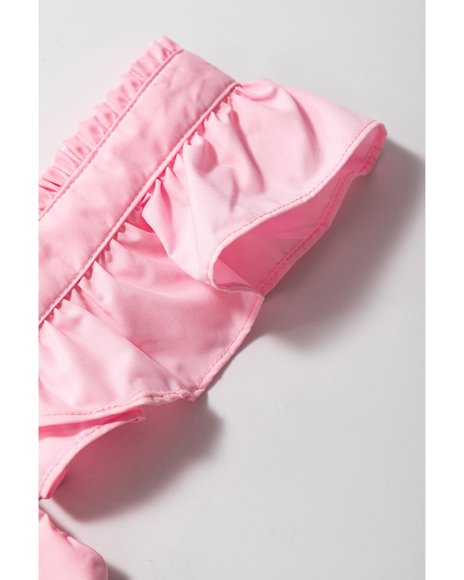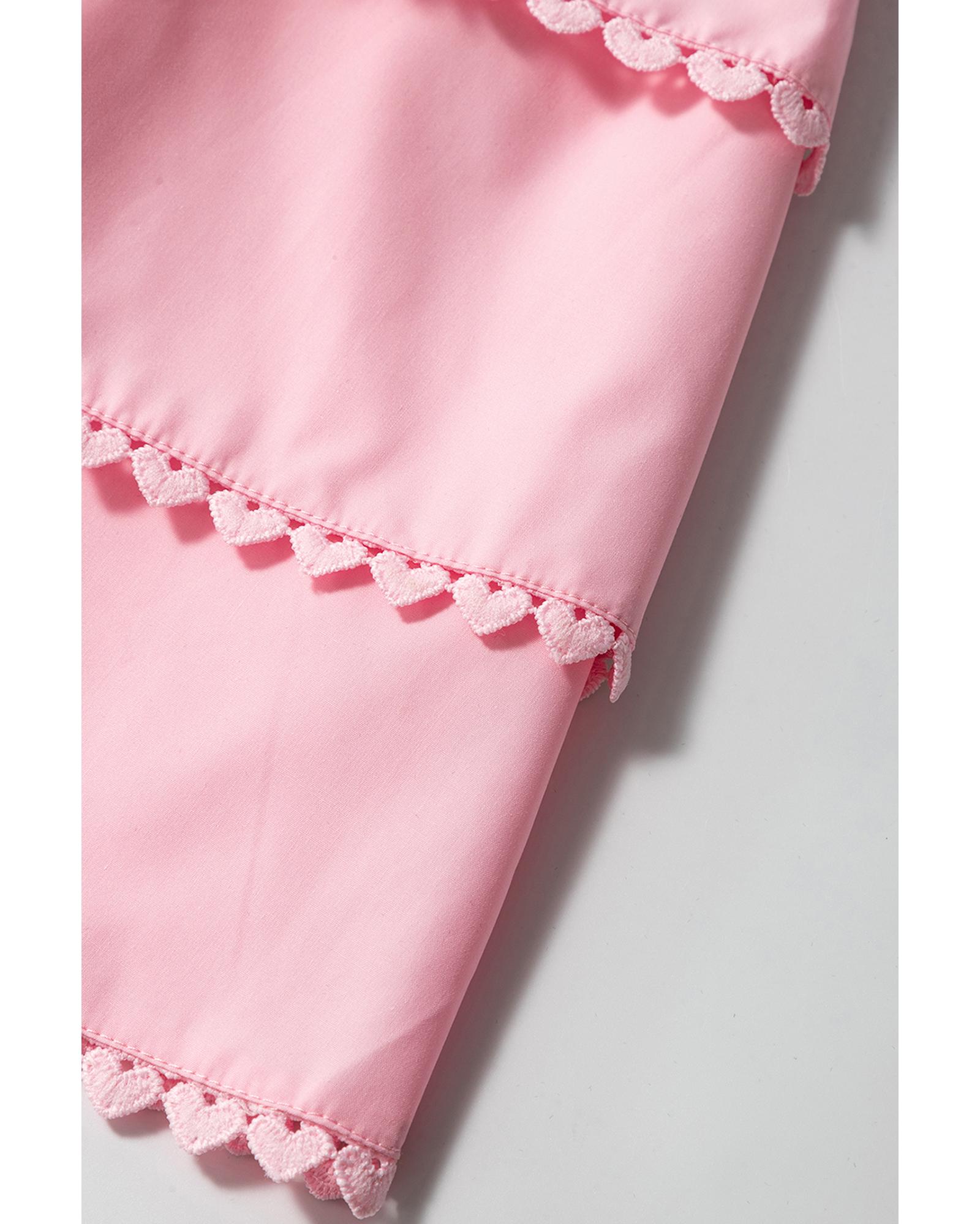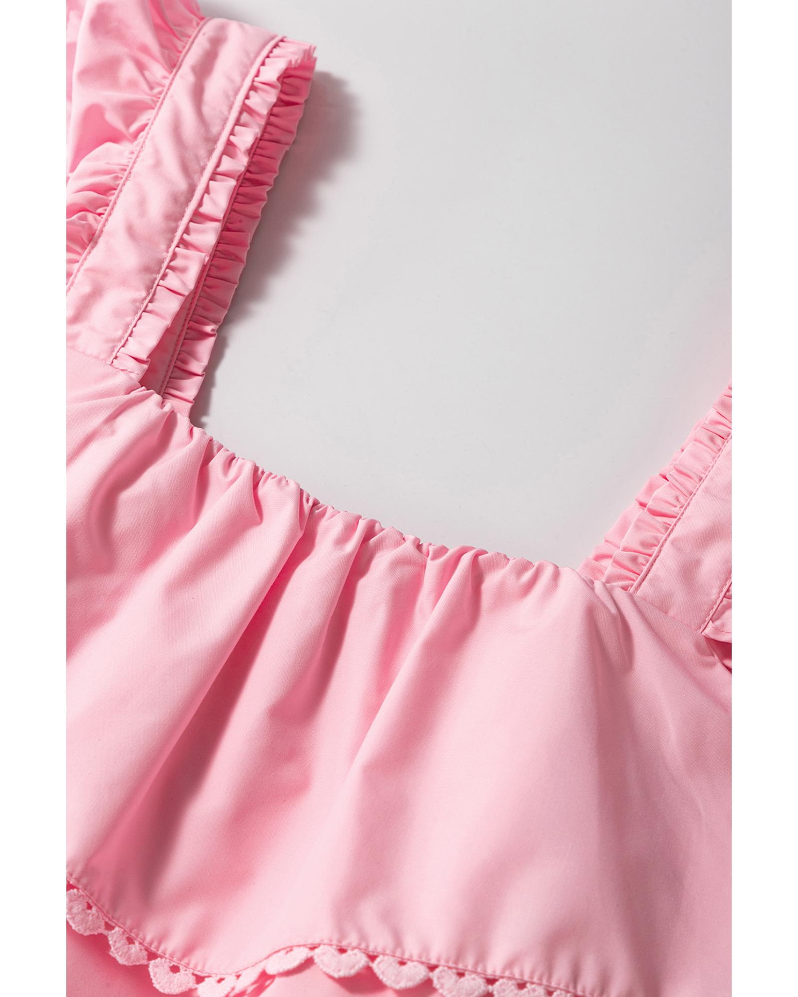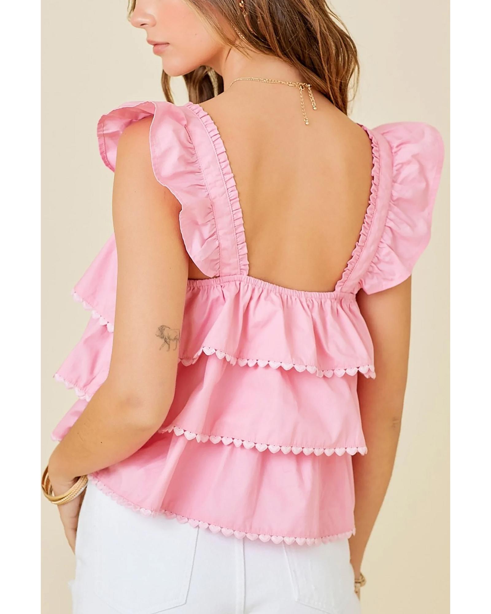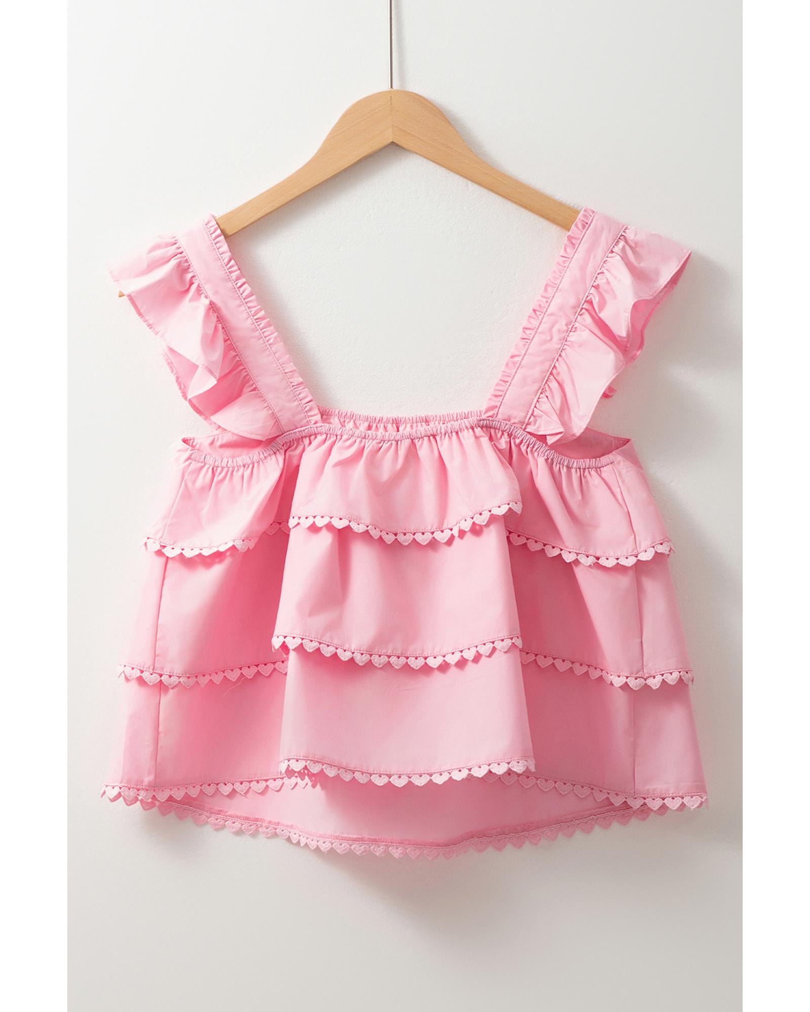 Pink Tiered Heart Trim Square Neck Flutter Top – L