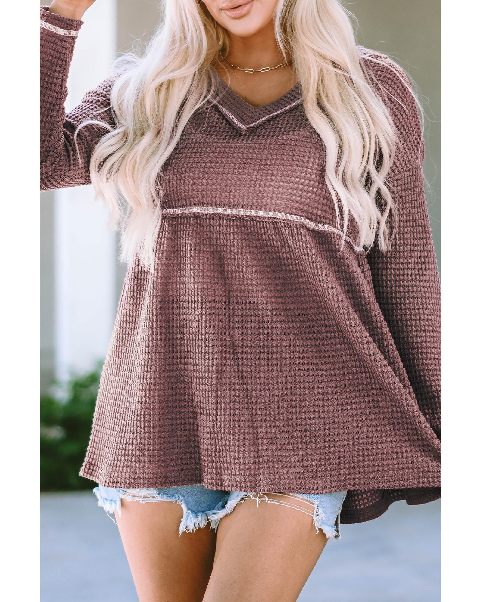 Pink Waffle Knit V Neck Long Sleeve Babydoll Top – L