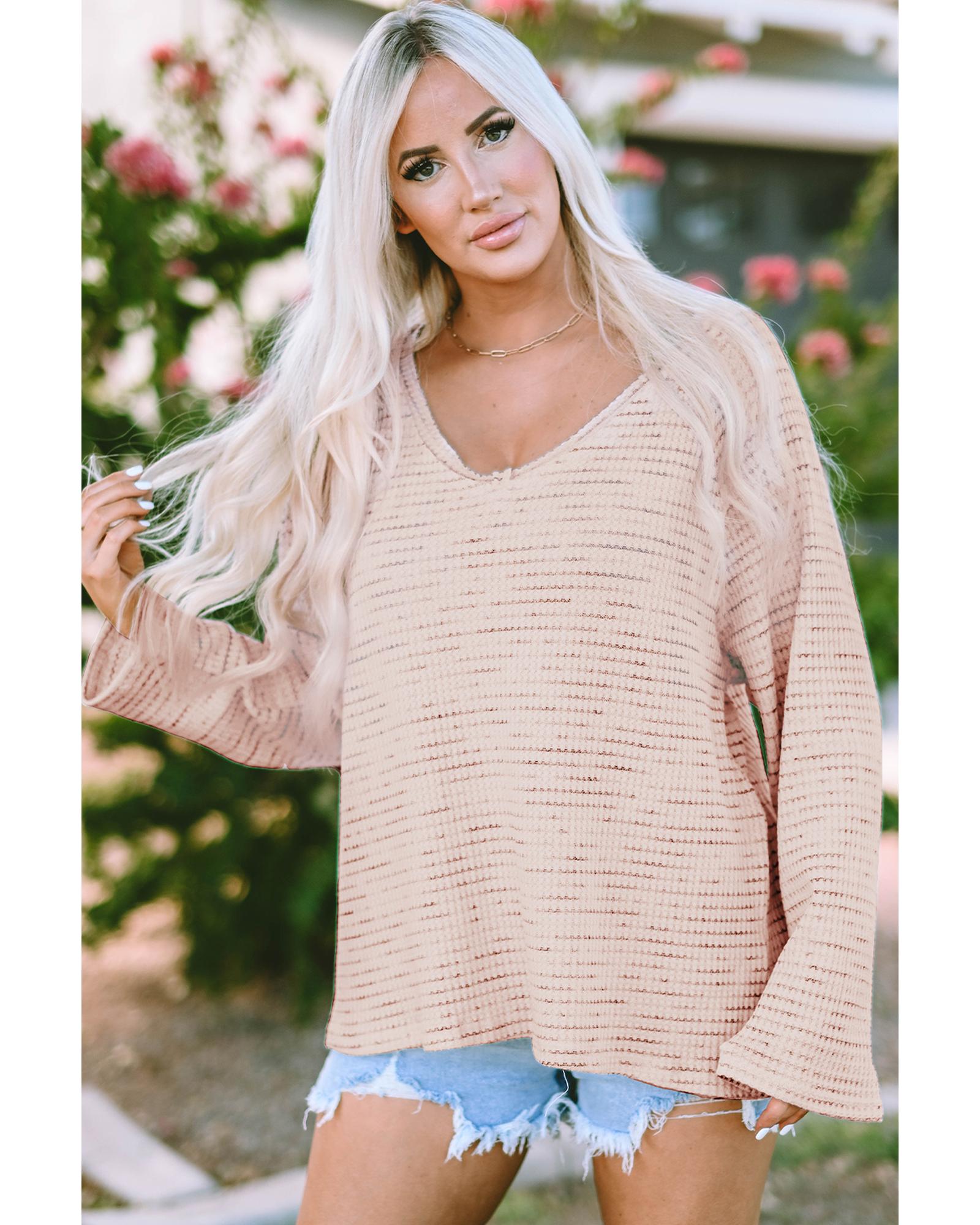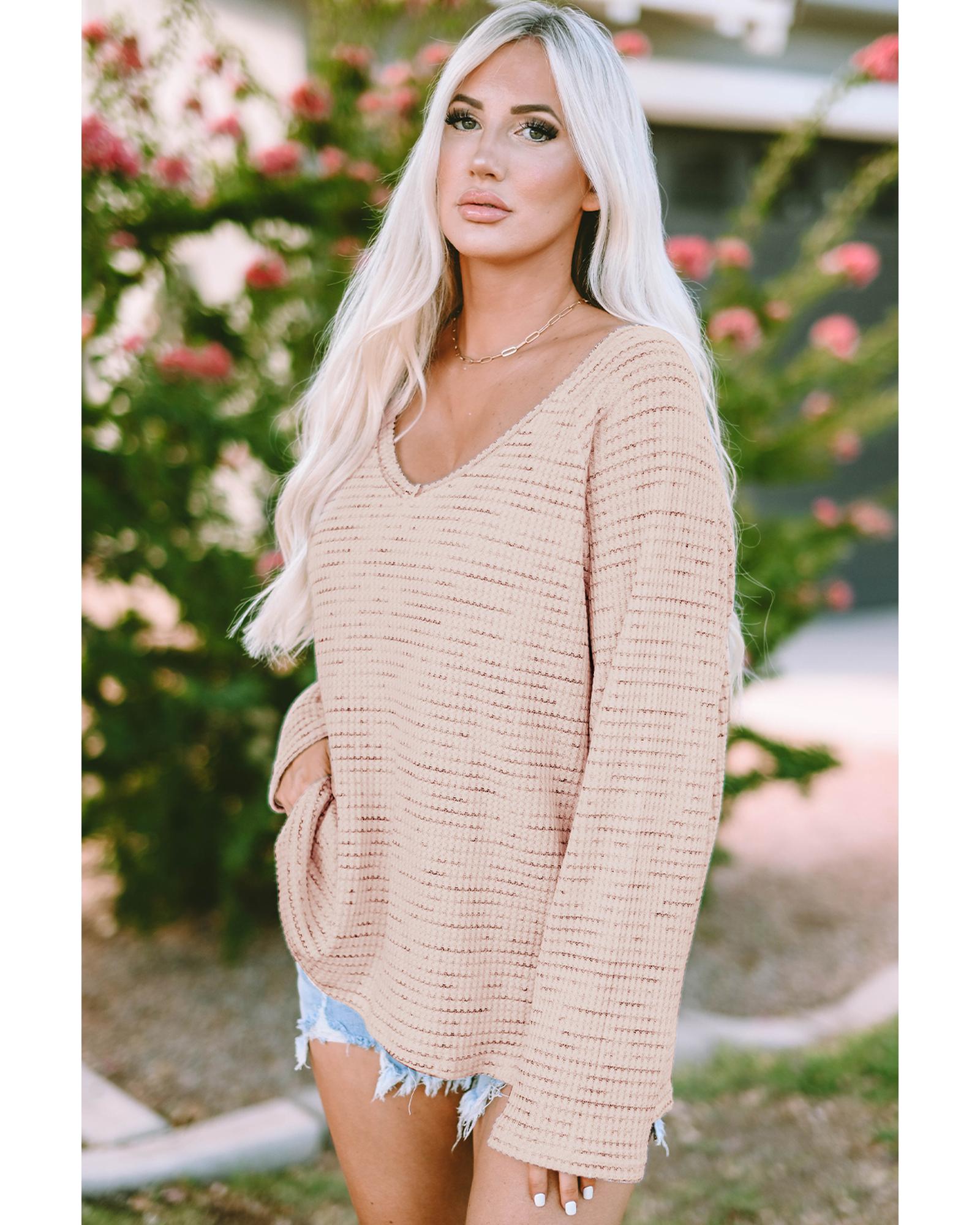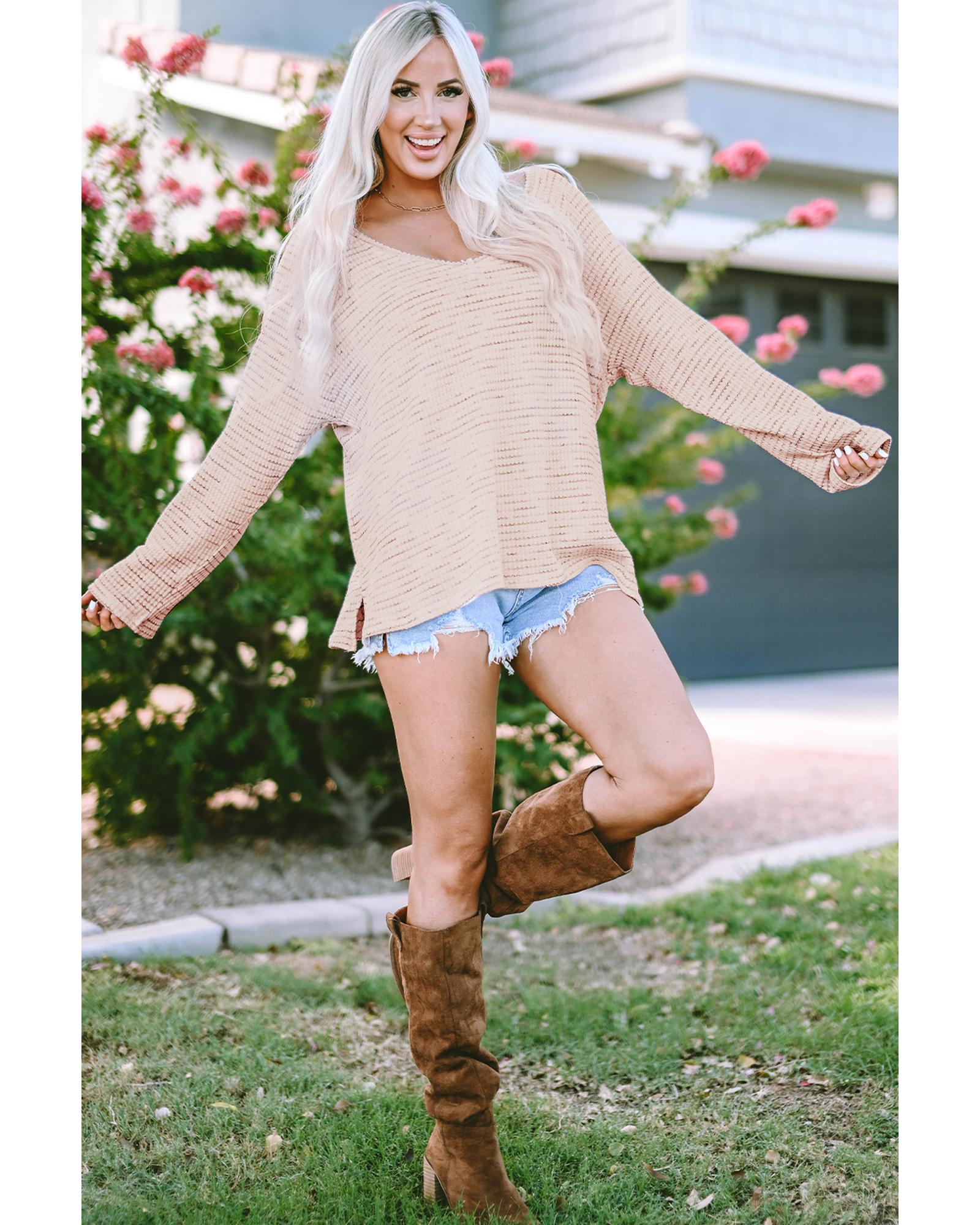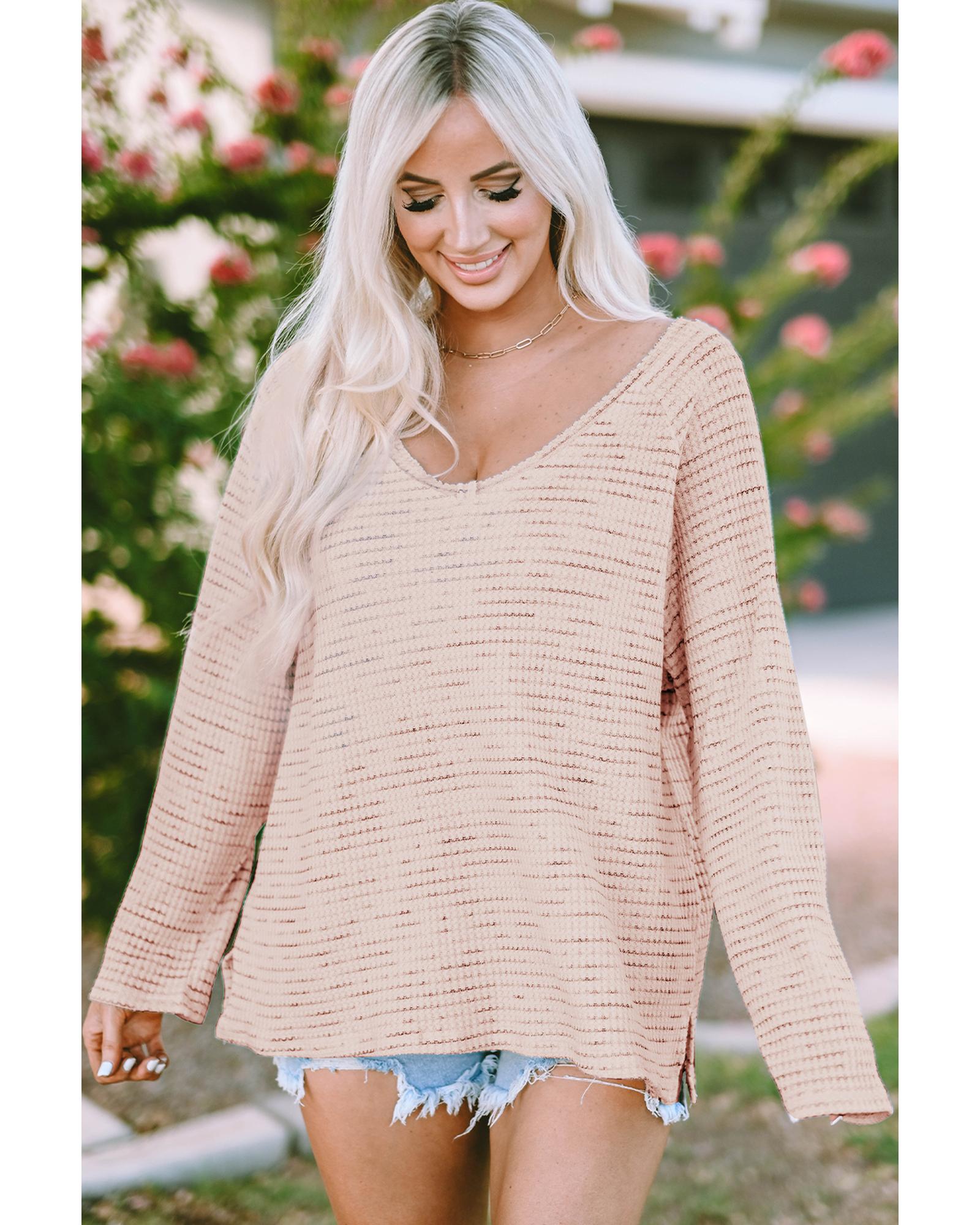 Pink waffled knit long sleeve top V - neck and loose cut for a comfortable fit Solid color design with frayed details Versatile piece for both casual and formal occasions Pairs well with ripped jeans or a skirt