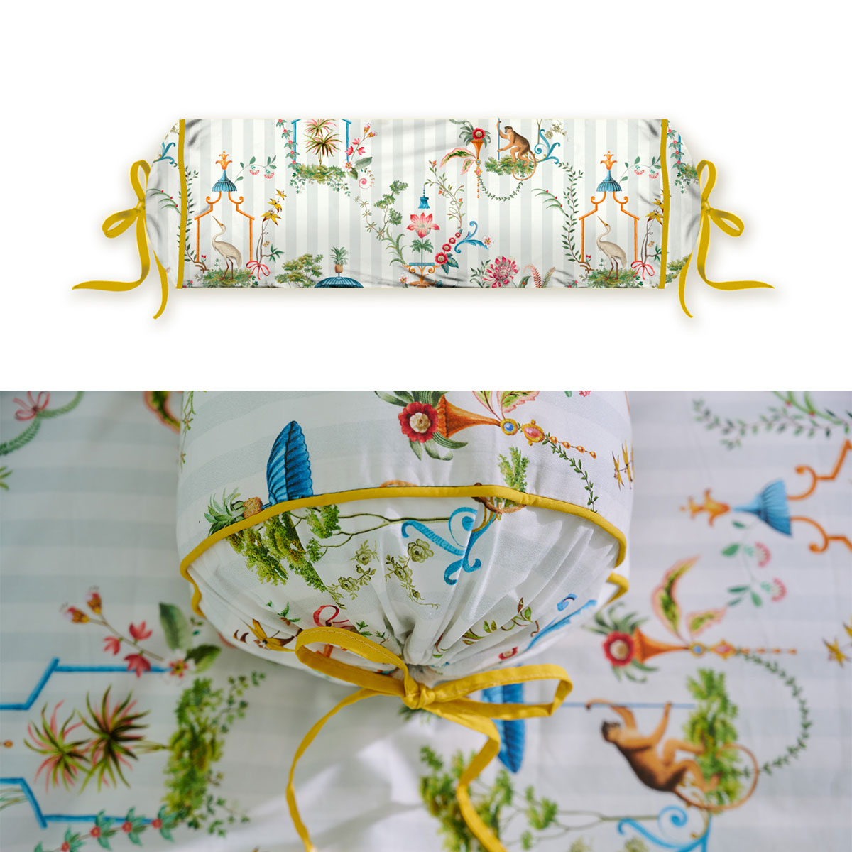 The Singerie White Neck Roll Cushion 22×70 cm by PIP Studio has a cheerful design with decorative scenes featuring birds, monkeys, and a heron printed in white, teal, green, red, yellow, pink, orange, brown, and black colour tones. A tonal stripe makes up the background of these scenes. This print was inspired by the singerie art genre that was popular in the South Netherlands during the Rococo. The decorative cushion has brightly coloured cord piping and a unique tie closure. The cushion is made of 100% percale cotton, 200 TC. Percale is a fine woven cotton of high quality. The cushion is 22 x 70 cm. The cushion can be washed at temperatures up to 60 degrees, is suitable for tumble drying, and can be ironed.