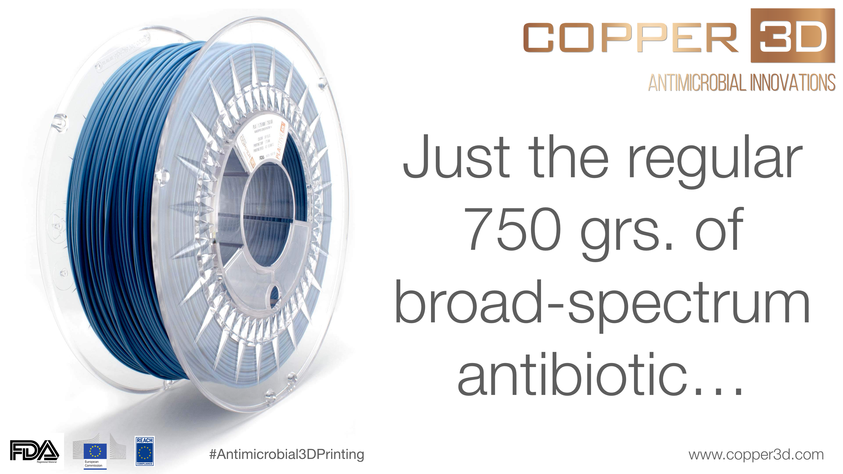 Copper 3D PLActiveis an innovative Nanocomposite 3D printer filament developed with proven high-quality EasyFil PLA compound and a patented, scientifically validated and highly effective Nano-Copper additive. PLActive filament is FDA registered and eliminates more than 99.99% of fungi, viruses, bacteria and a wide range of microorganisms.