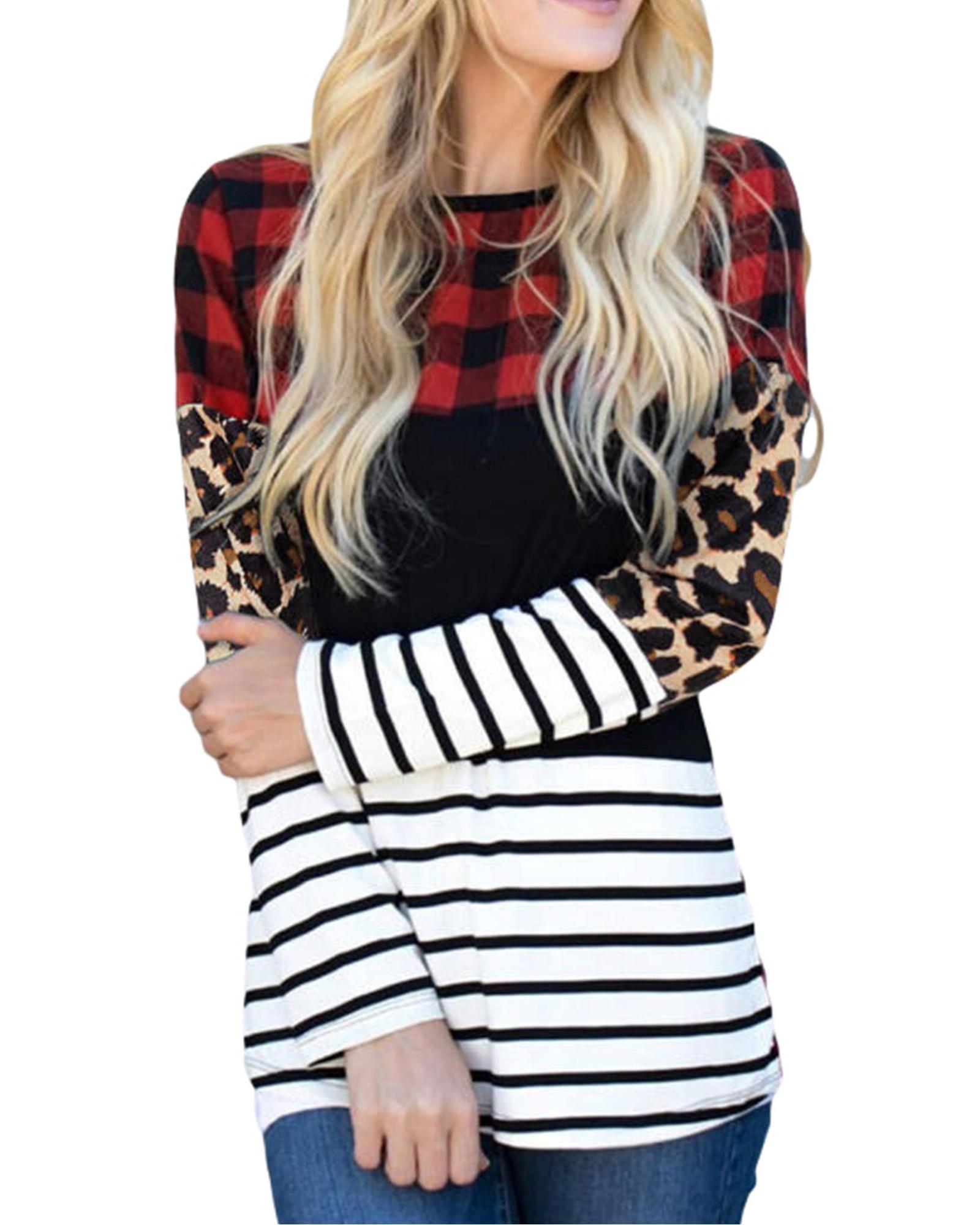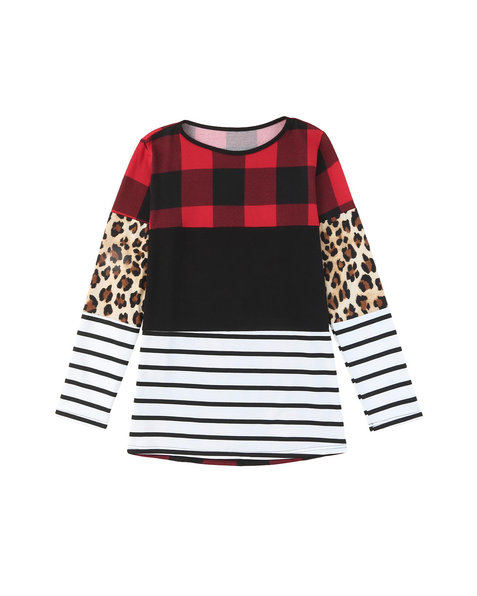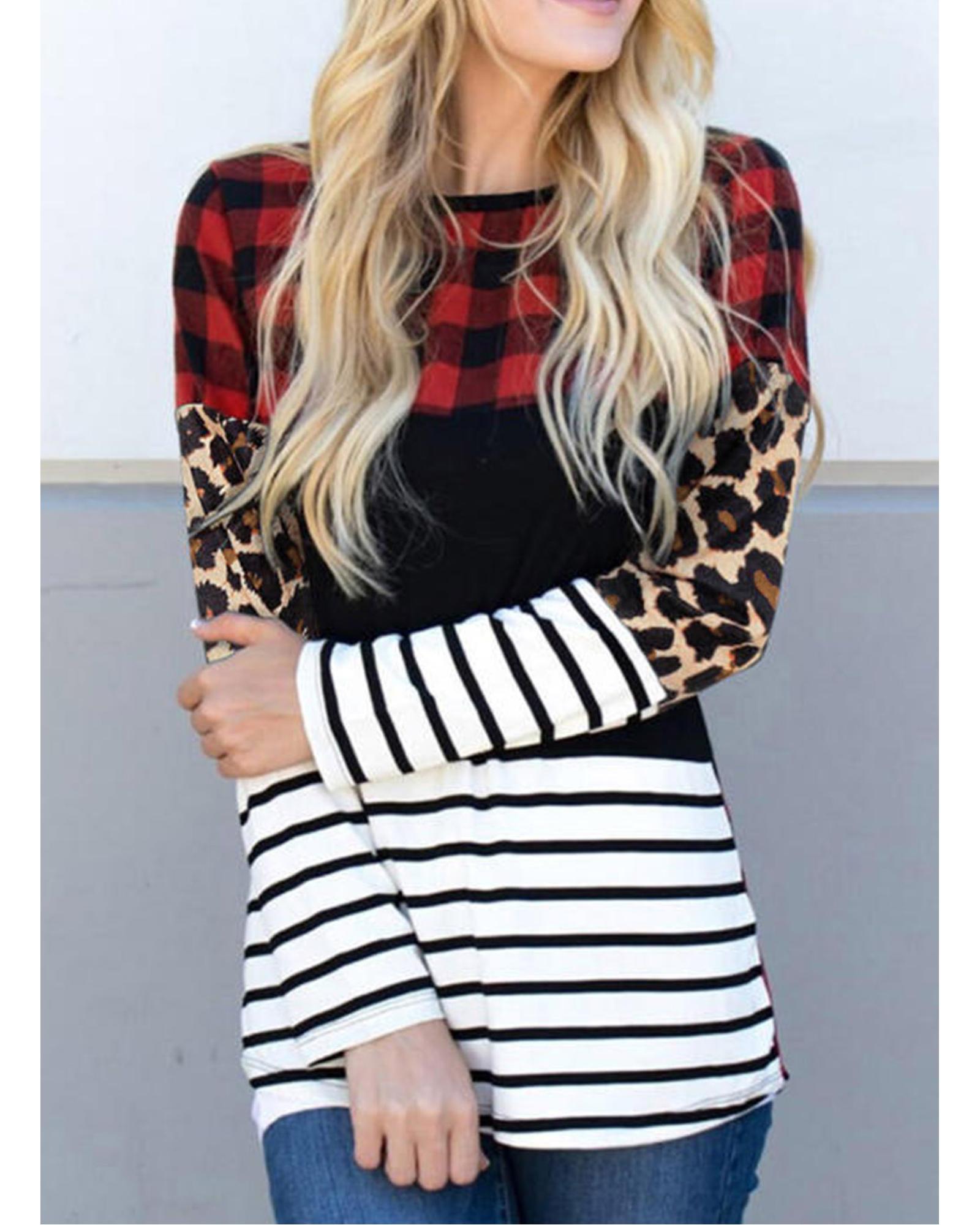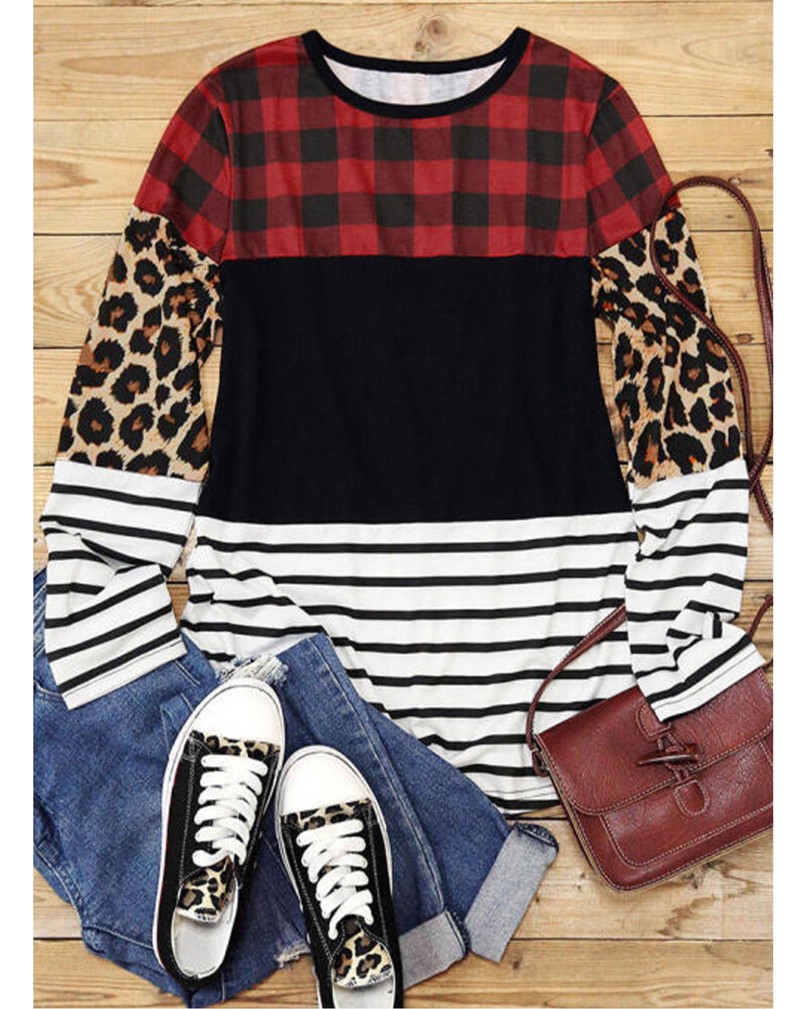 Plaid Print Leopard Splicing Striped Color Block Long Sleeve Top – M