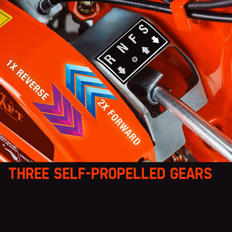 The USA designed BT-777 gets the job done faster with an 800mm tiller scope – over 35% wider than most alternative designs, greatly reducing the time it takes to prep your soil. It boasts an impressive 350mm tilling depth, made possible due to its non-restrictive safety shields. The unit features 3 self-propelled gears – 2 forward and 1 reverse – that drive the machine so you can get loads of work done with little fatigue. The superior hard-drawn and synchronous-rotating steel tiller blades offer superior durability in tough rocky soil, and one pass is all it takes to have finely milled and well-aerated earth.