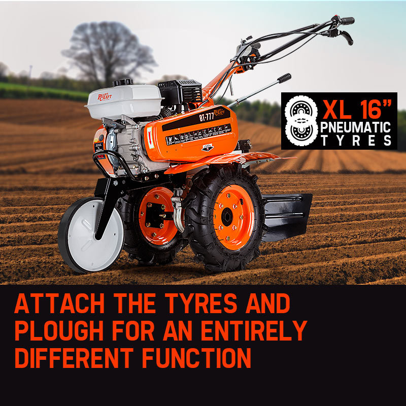 Perhaps the most unique attribute of this unit, and what’s elevating it above its competitors, is that it can be transformed into a heavy-duty plougher in moments. By simply replacing the tiller blades with the extra-large 16″ pneumatic tyres and attaching the two-sided steel plough, the machine becomes a self-propelled plougher. This addition to the BT-777 allows you to create clean and uniform trenches for crops following cultivation with the tiller function.