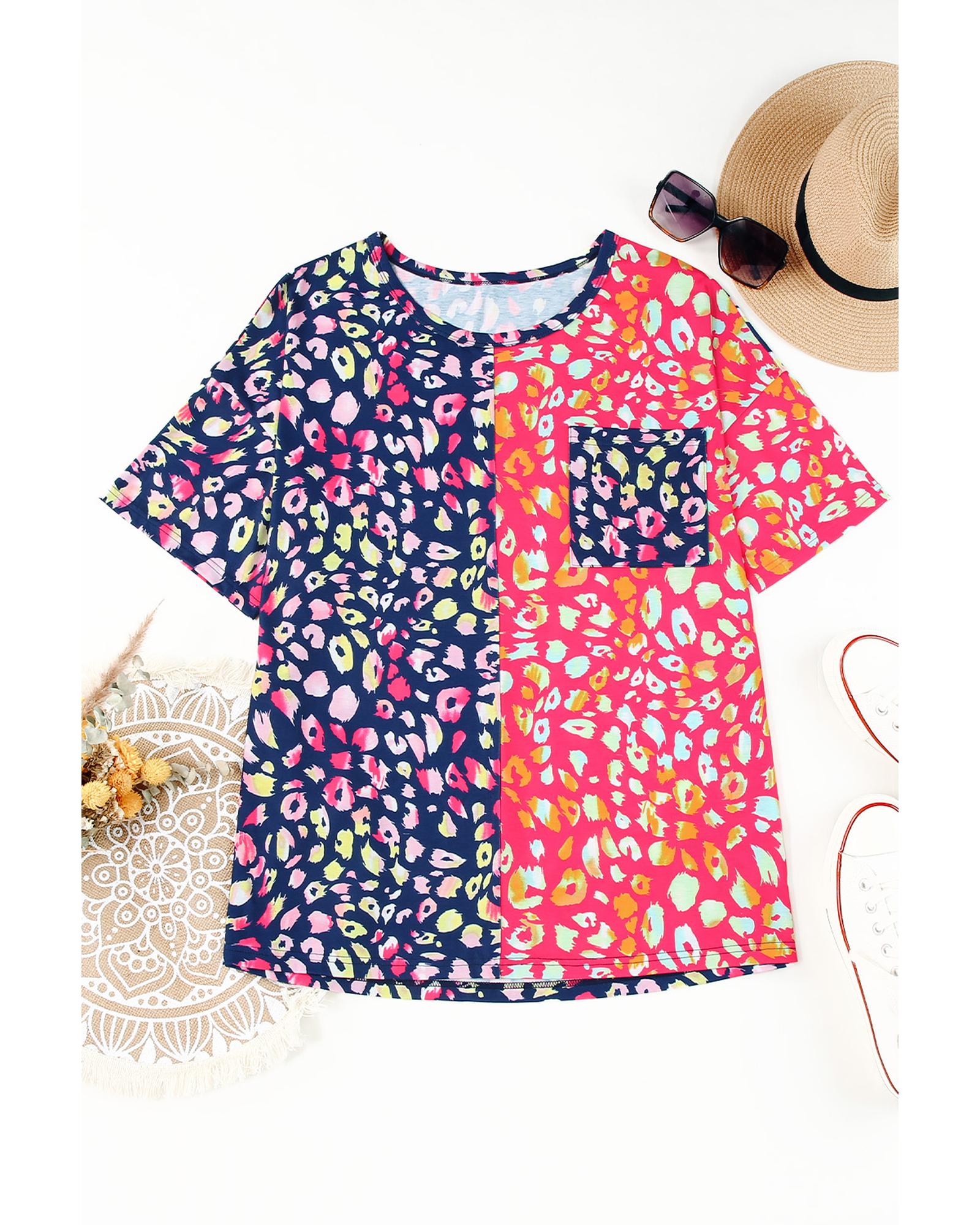 - Featured with a crew neckline short sleeves chest pocket and leopard patchwork