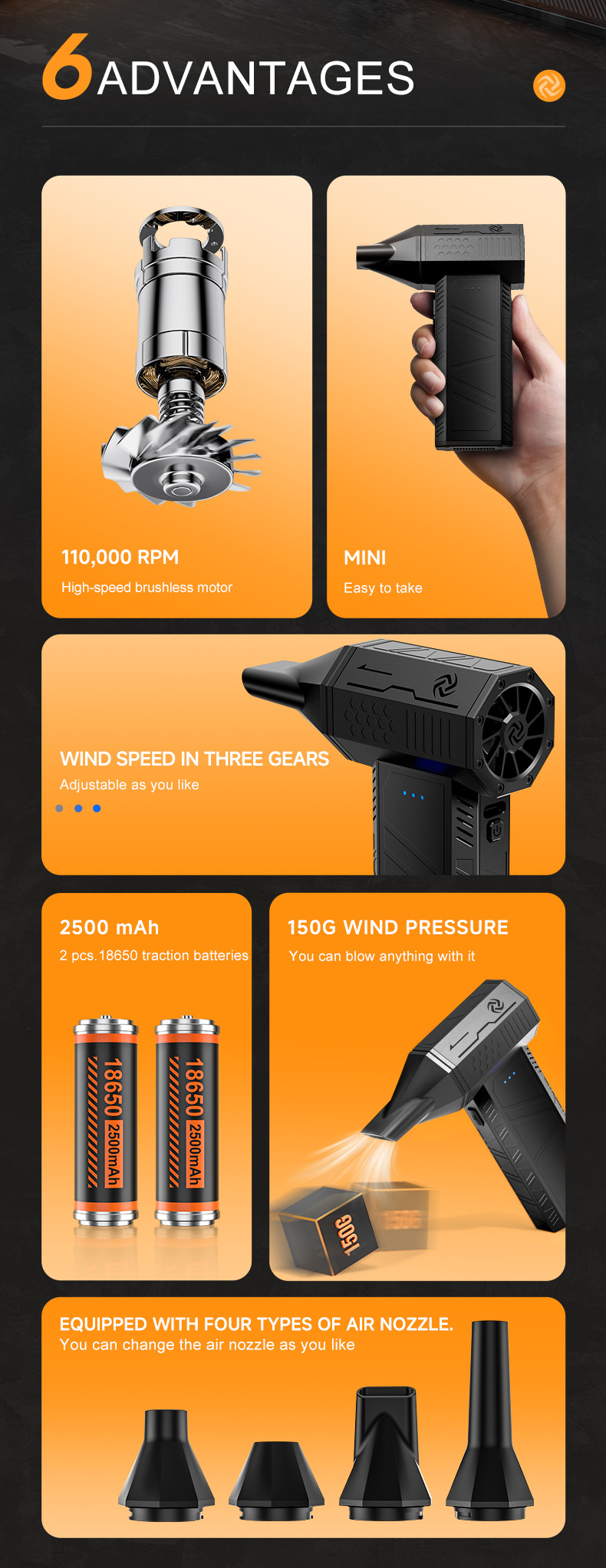 - Four Air Nozzles: Includes a long air nozzle, flat air nozzle, and two round air nozzles for various applications.