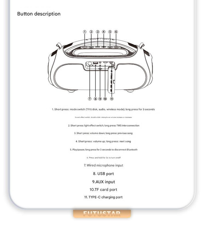 - Light Effect Switch: Short press to switch light effects. Long press for TWS interconnection.