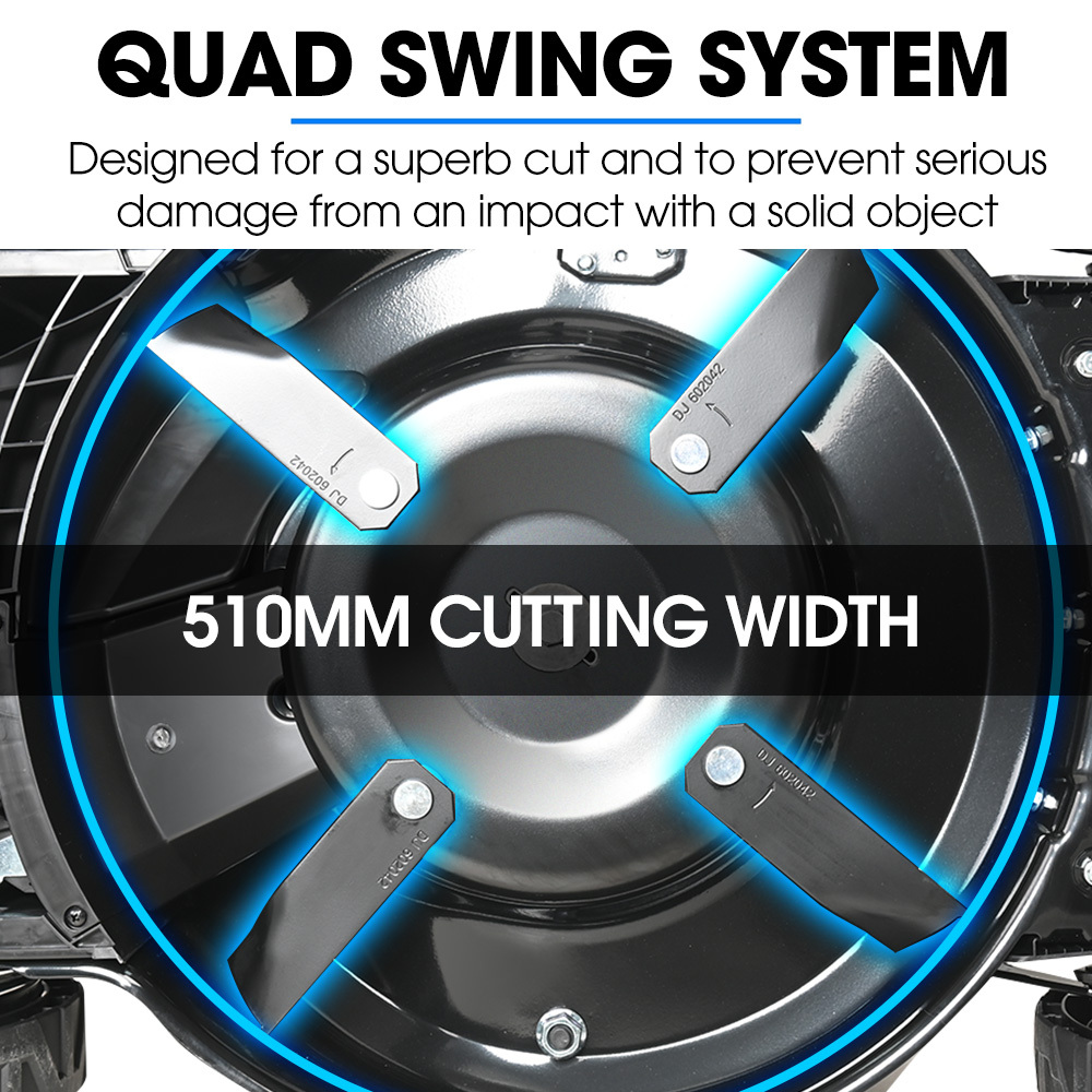 Navigate any terrain smoothly with oversized wheels and premium bearings, while the heavy-duty 4-blade system ensures a precise 20-inch cut. The generous 60L catcher means fewer stops and more continuous mowing.