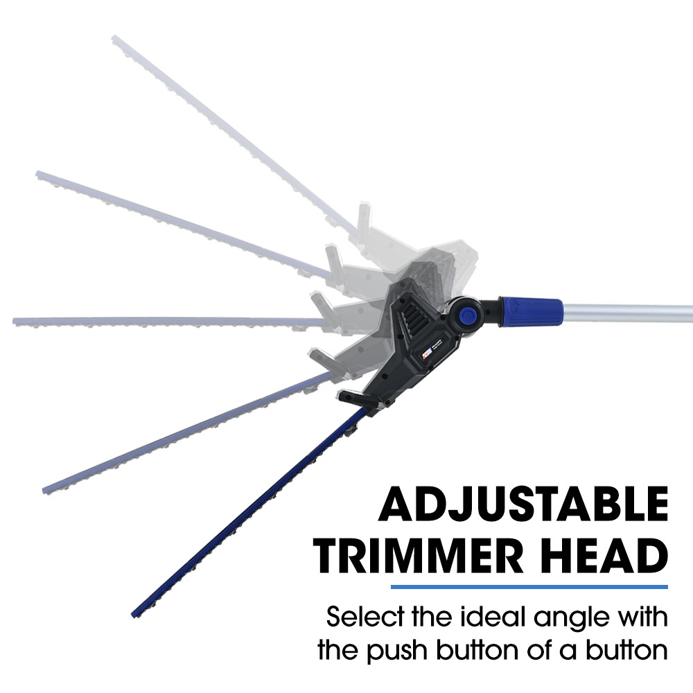 Designed for ultimate flexibility, the interchangeable motorheads allow you to switch from the chainsaw to the hedge trimmer effortlessly. The Pole Hedge Trimmer features a 20′ hardened alloy dual-action blade and an adjustable angle head. You can ergonomically trim low box hedges, and with the extension pole fitted you can easily cut at up to 3m.