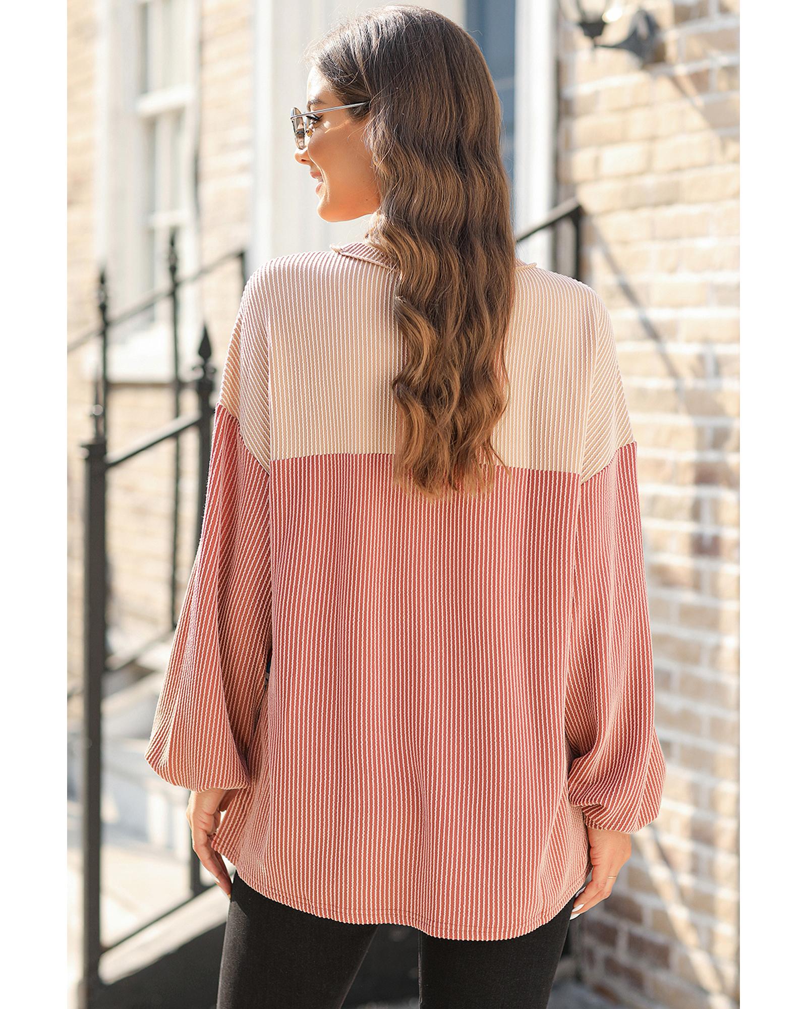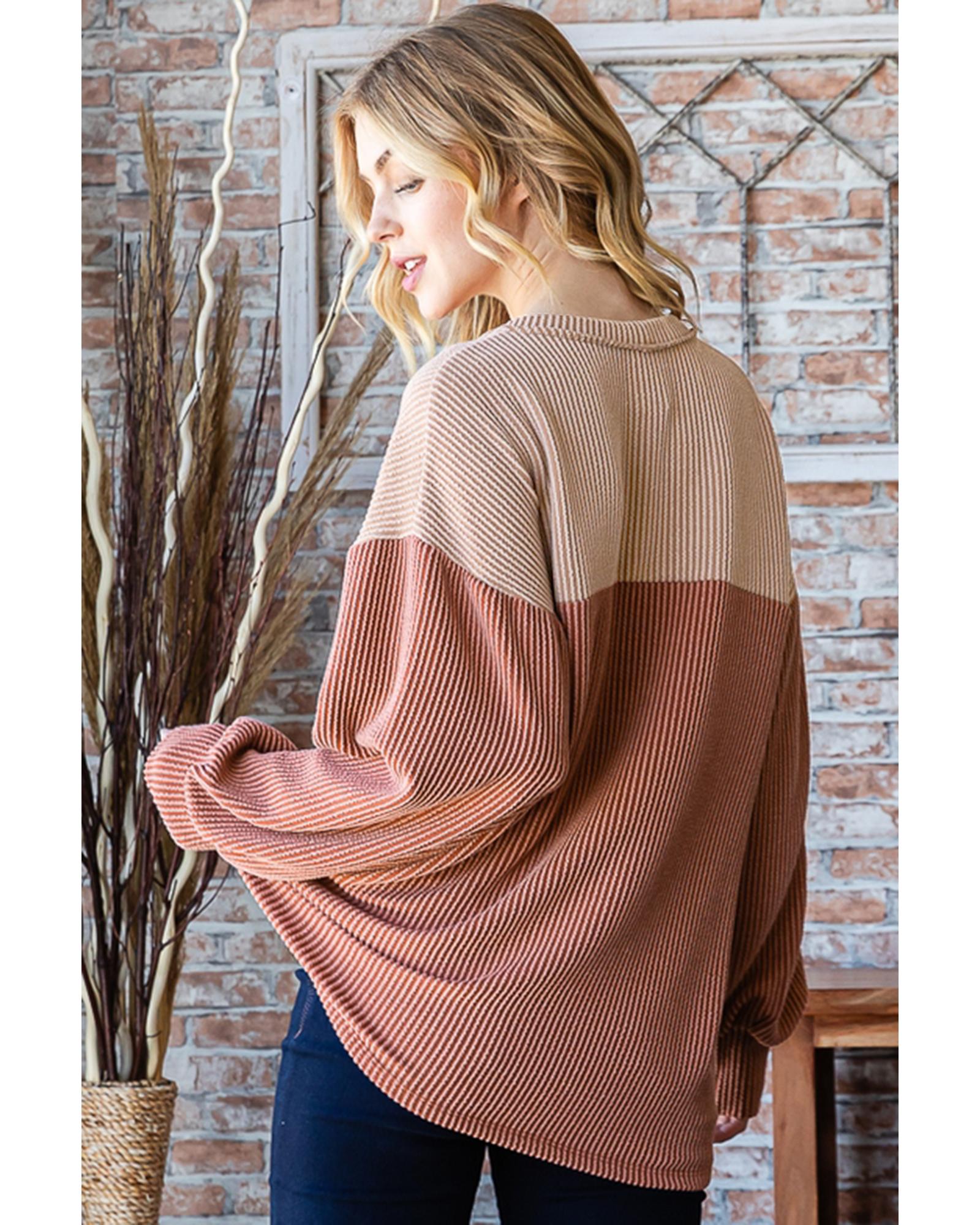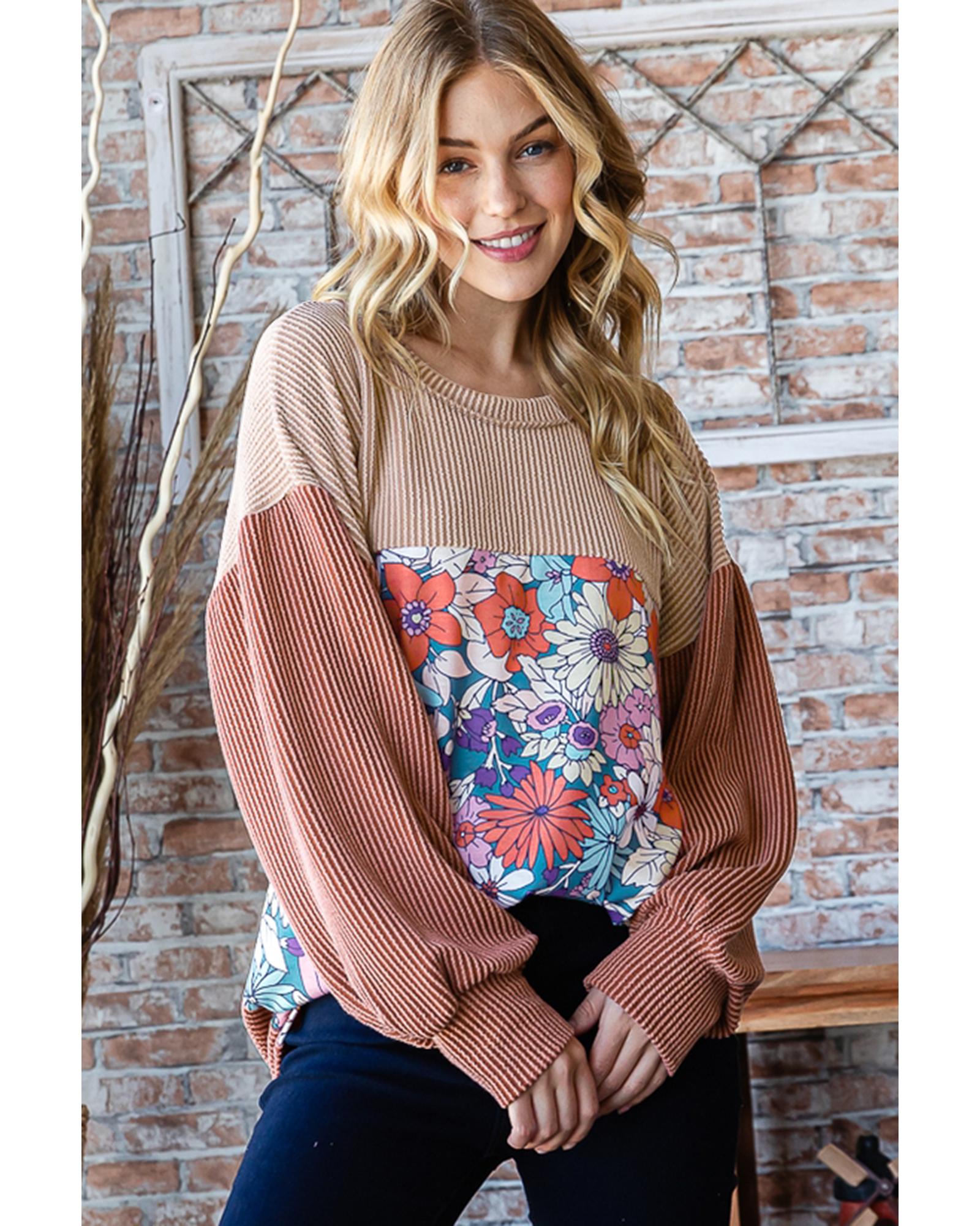 Printed Floral Contrast Colorblock Ribbed Top – L