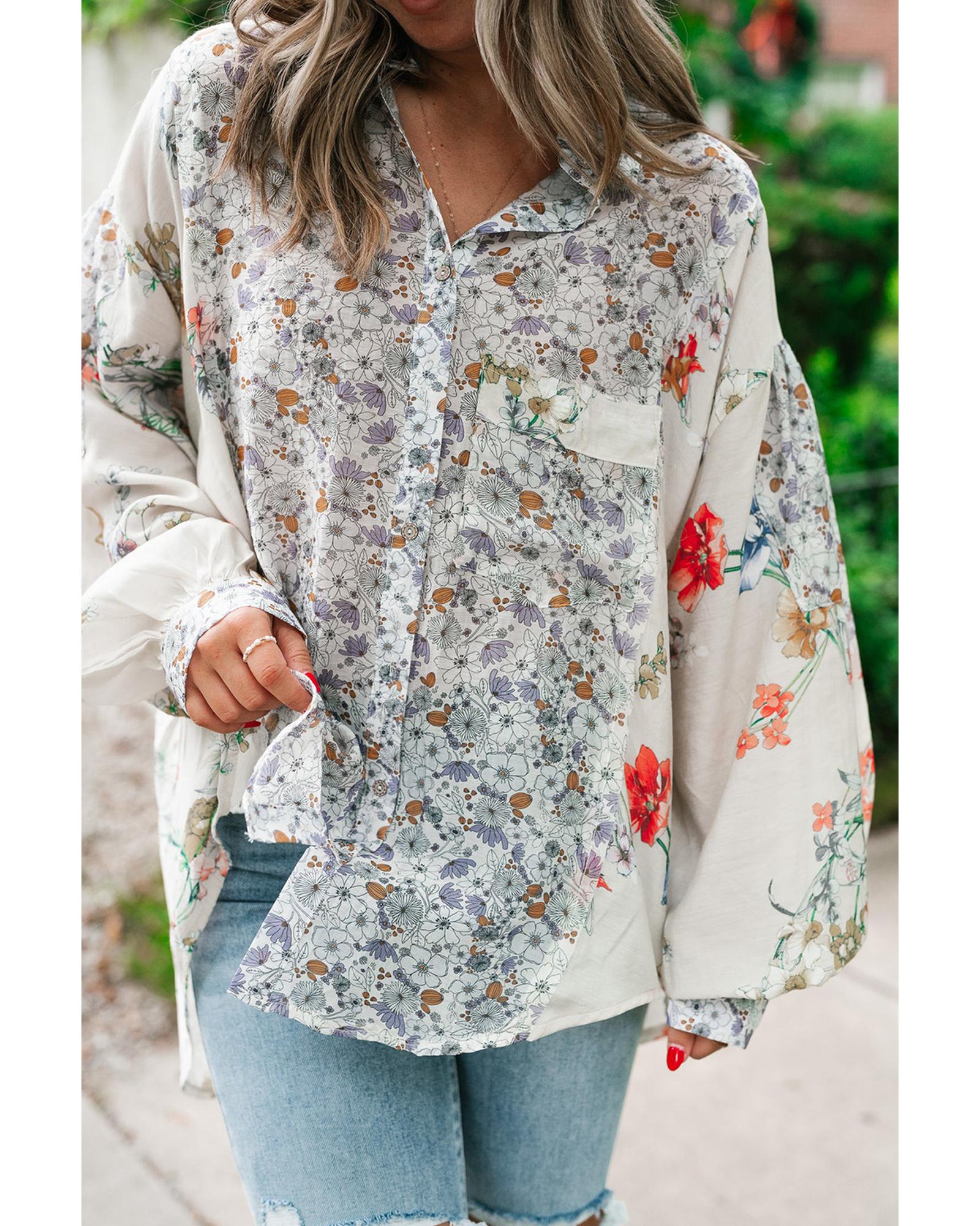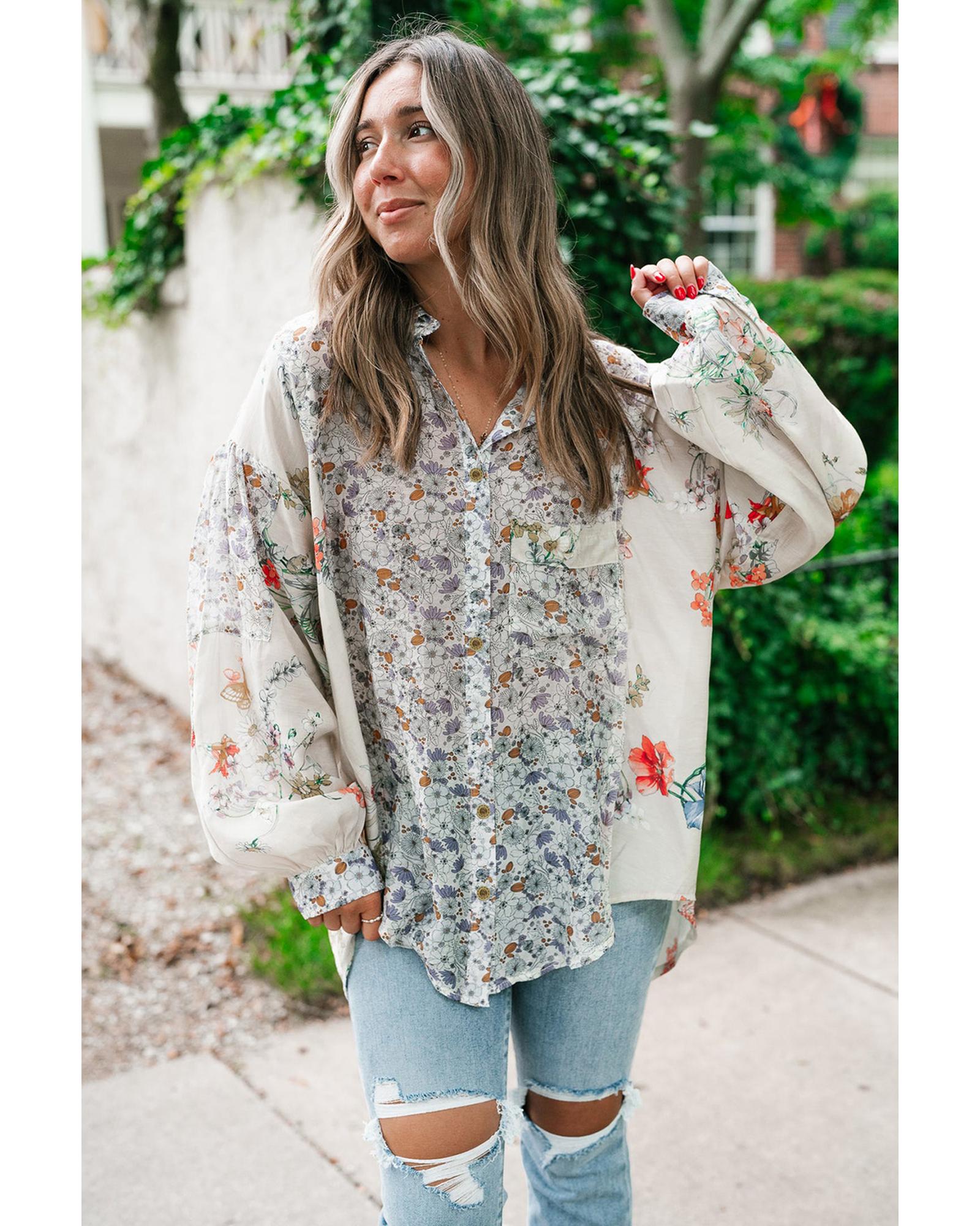 • Purple Boho Floral Bishop Sleeve Button Up Loose Shirt