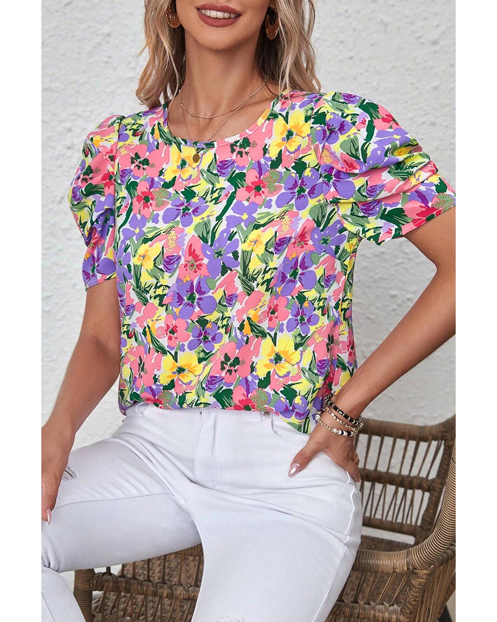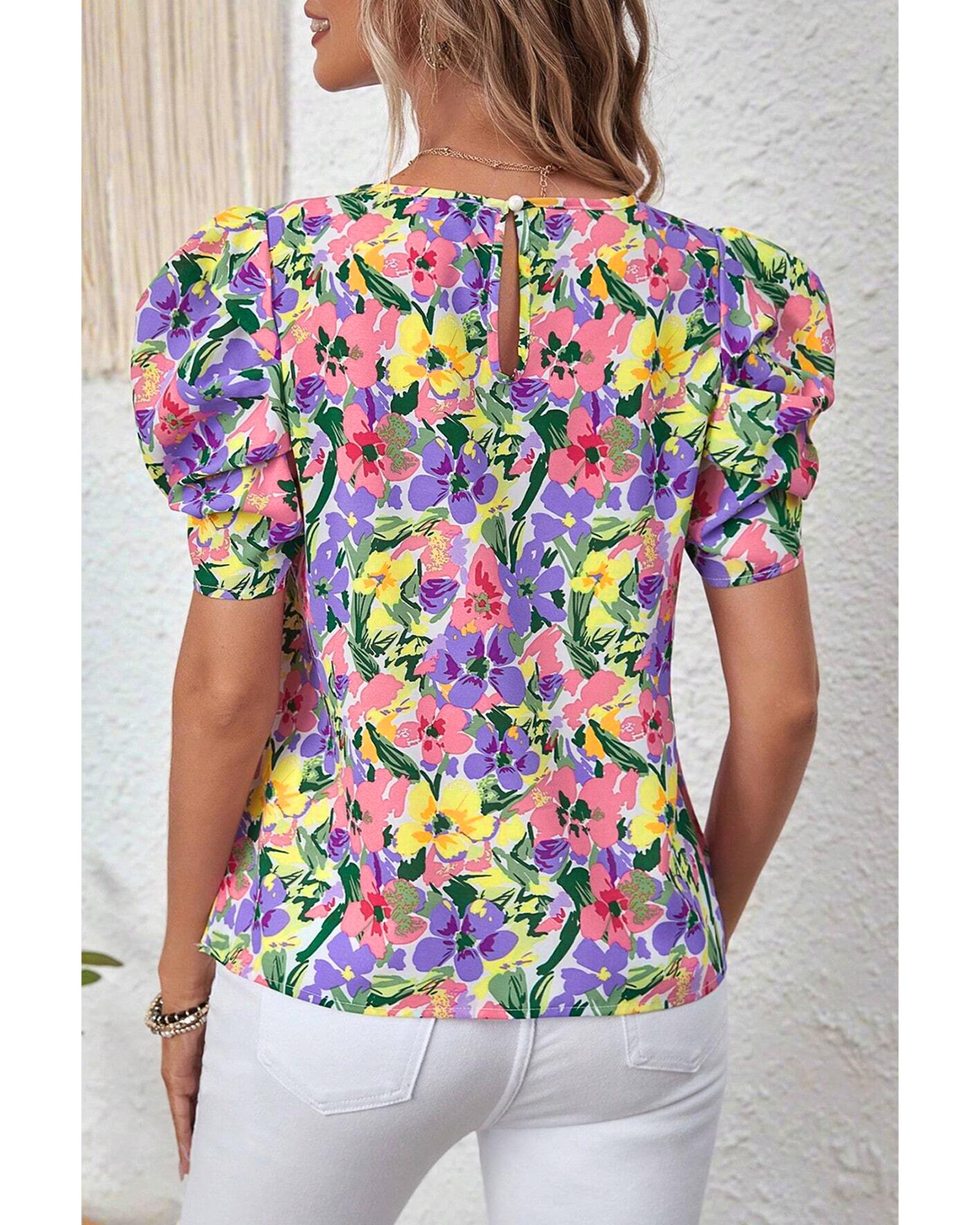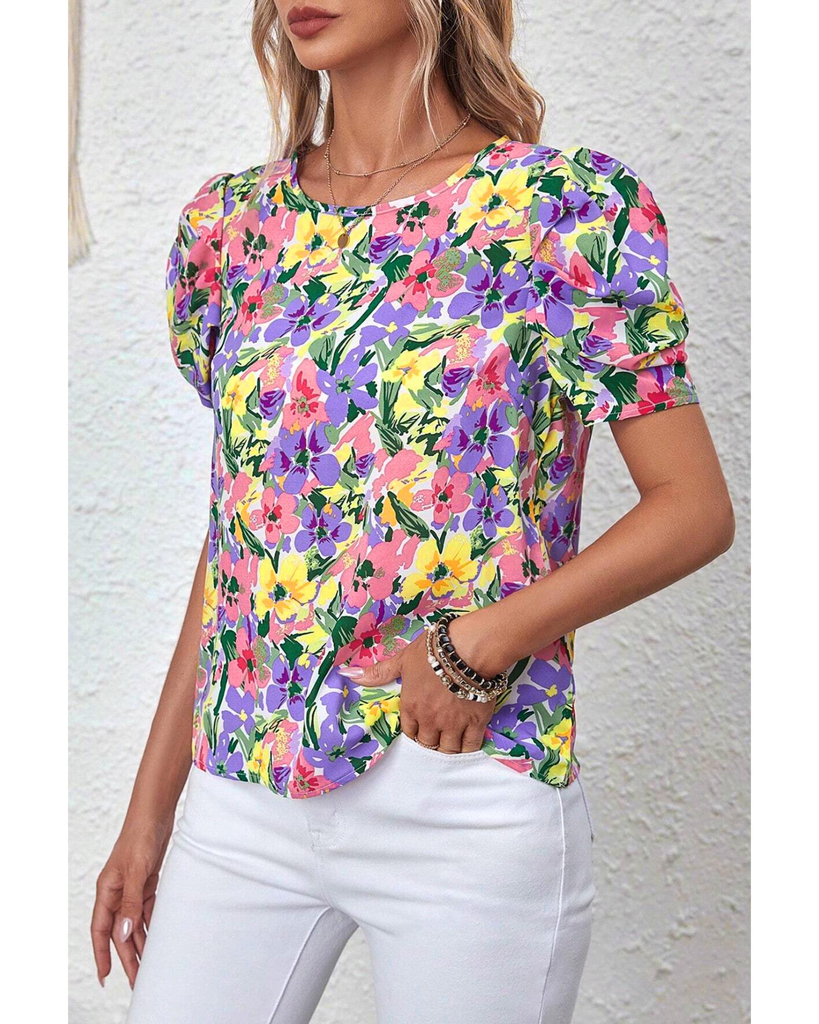 Purple Floral Print Puff Short Sleeve Crew Neck Blouse – XL