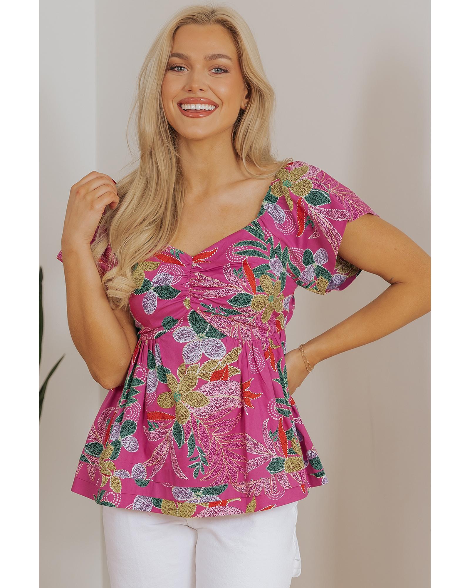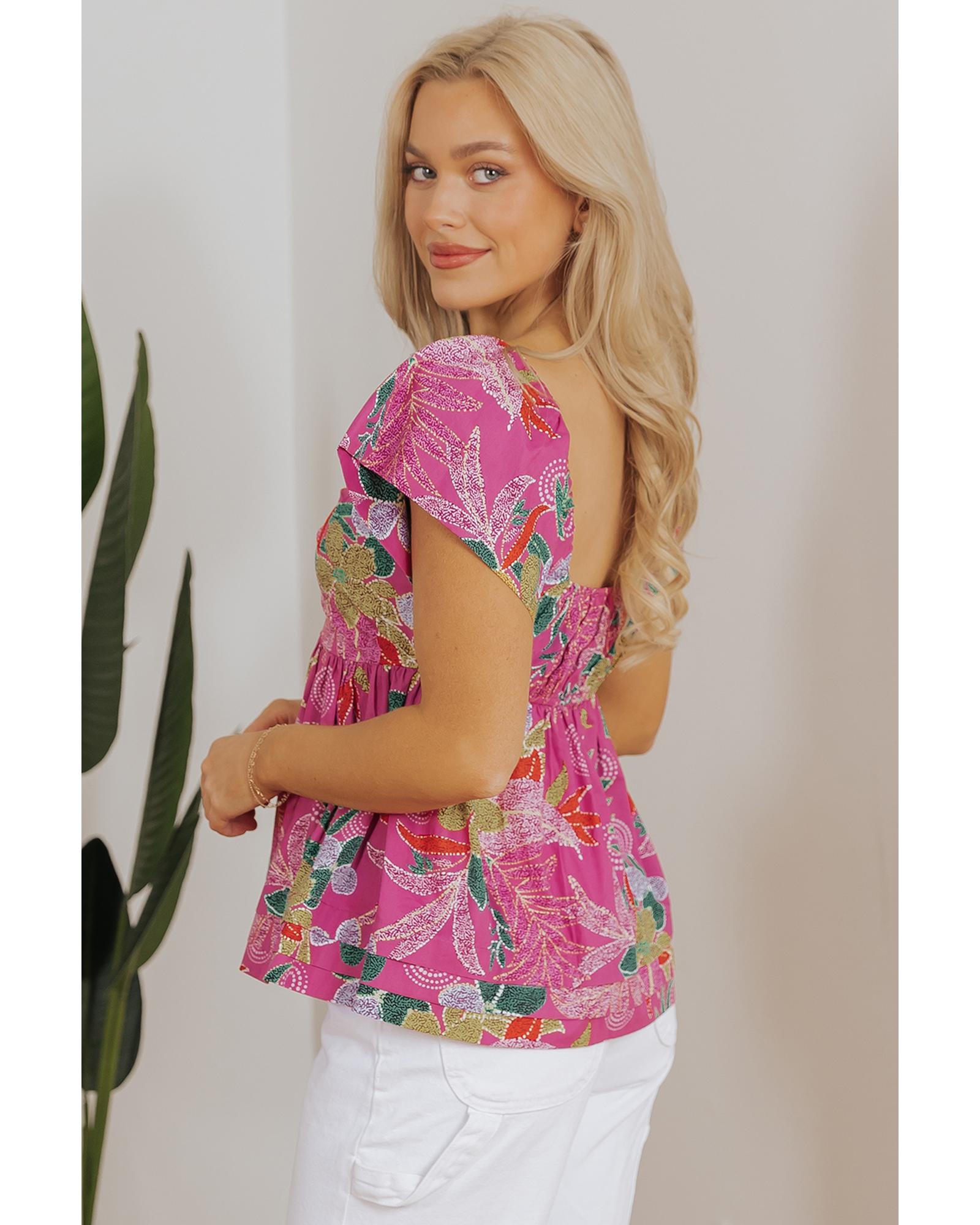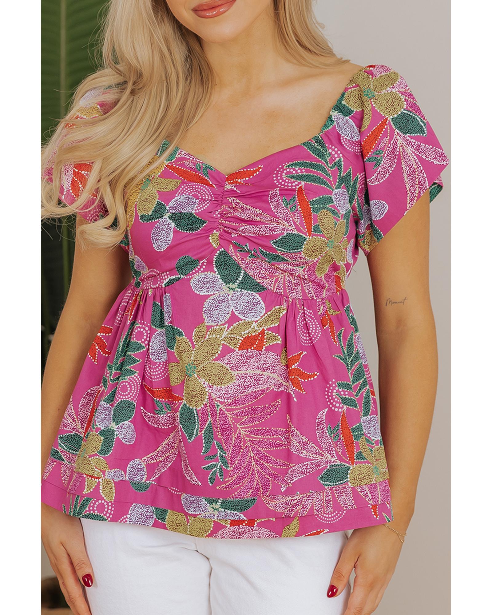 Purple Floral Print Sweetheart Neck Flutter Sleeve Blouse – L