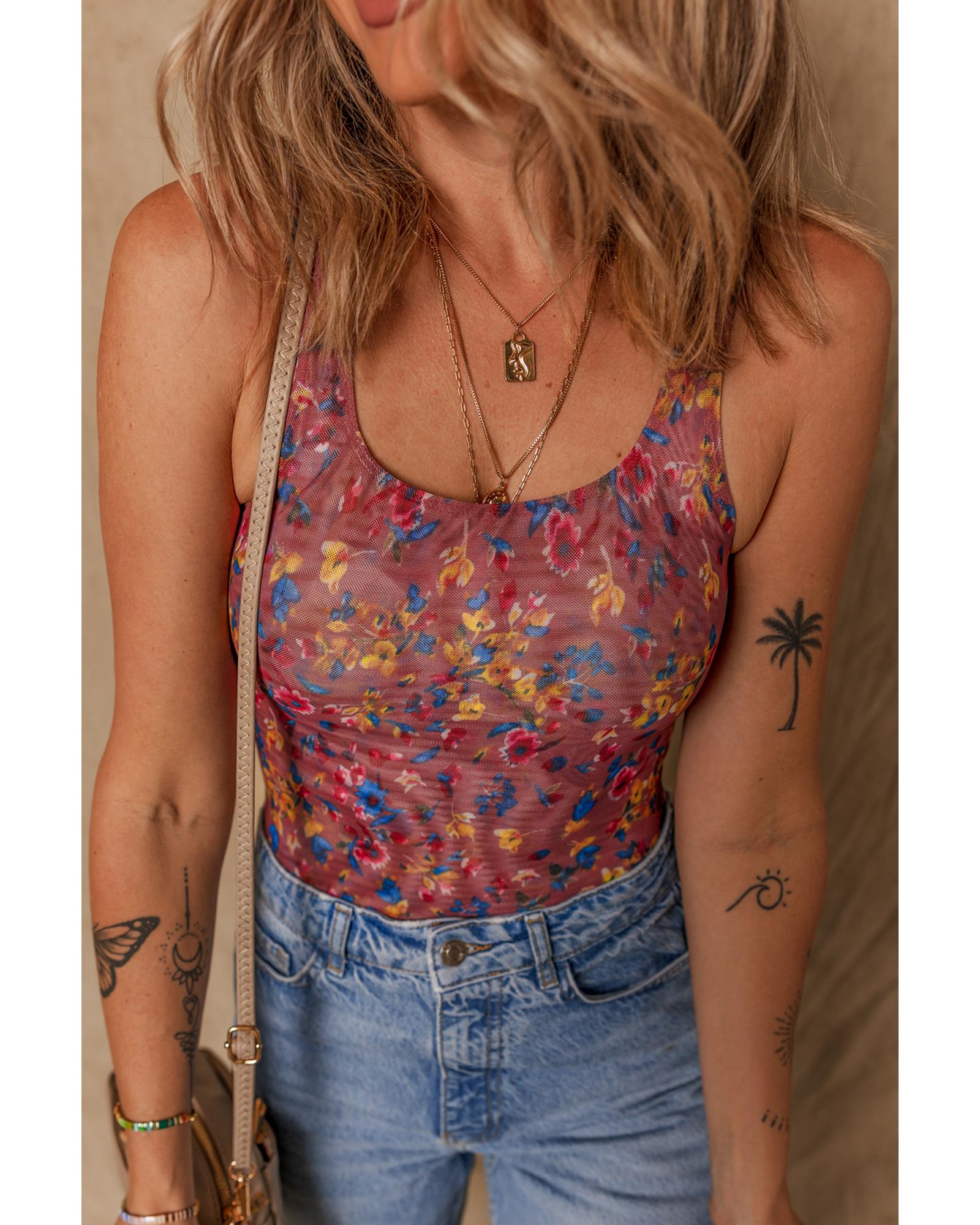 Purple Floral Printed Mesh U Neck Sleeveless Bodysuit – M