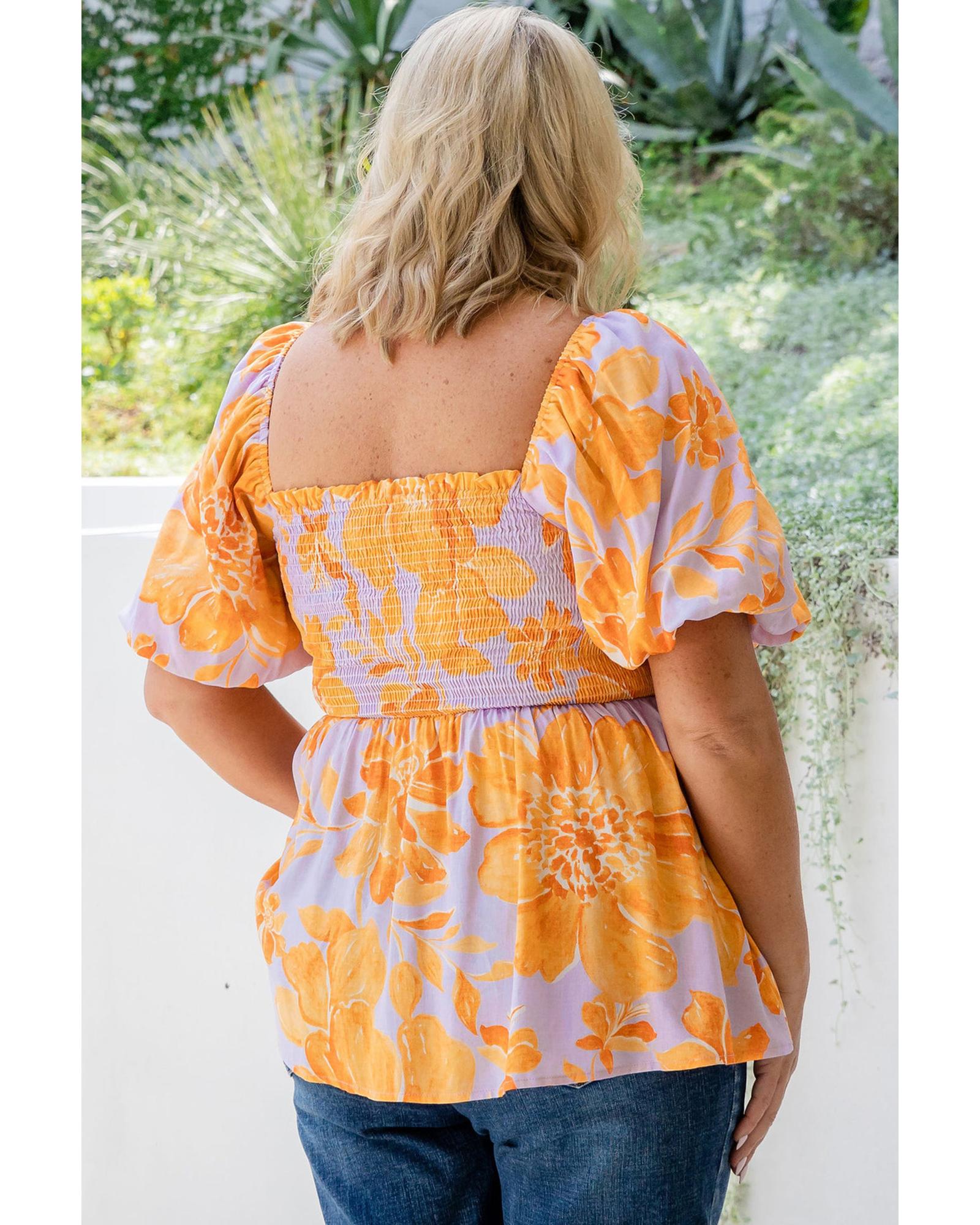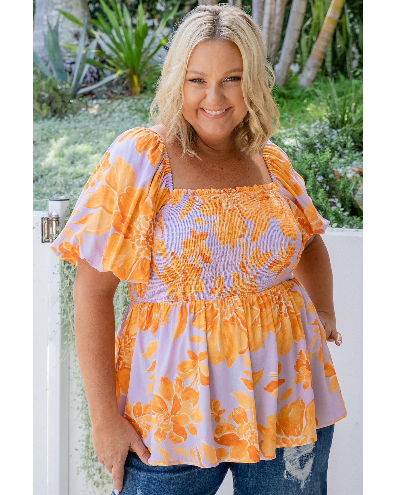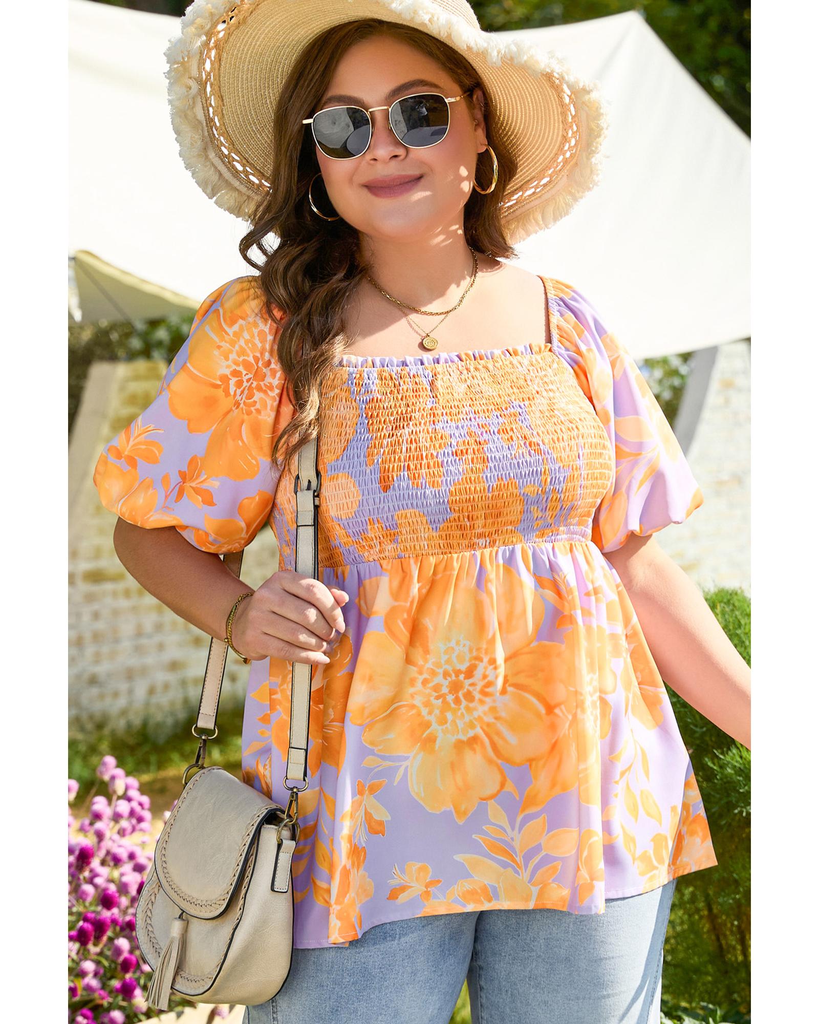 - Purple Floral Puff Sleeve Square Neck Smocked Plus Size Babydoll Blouse