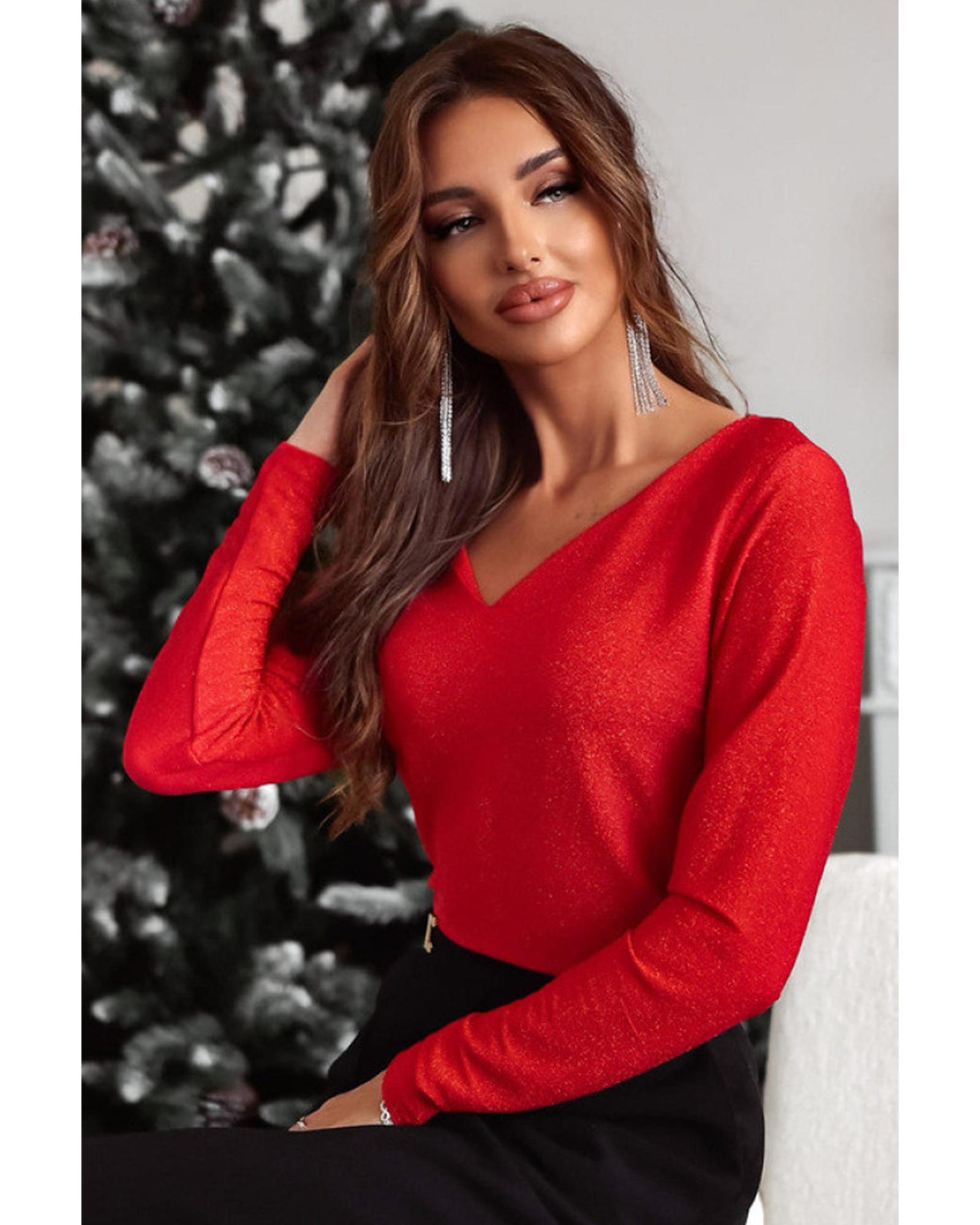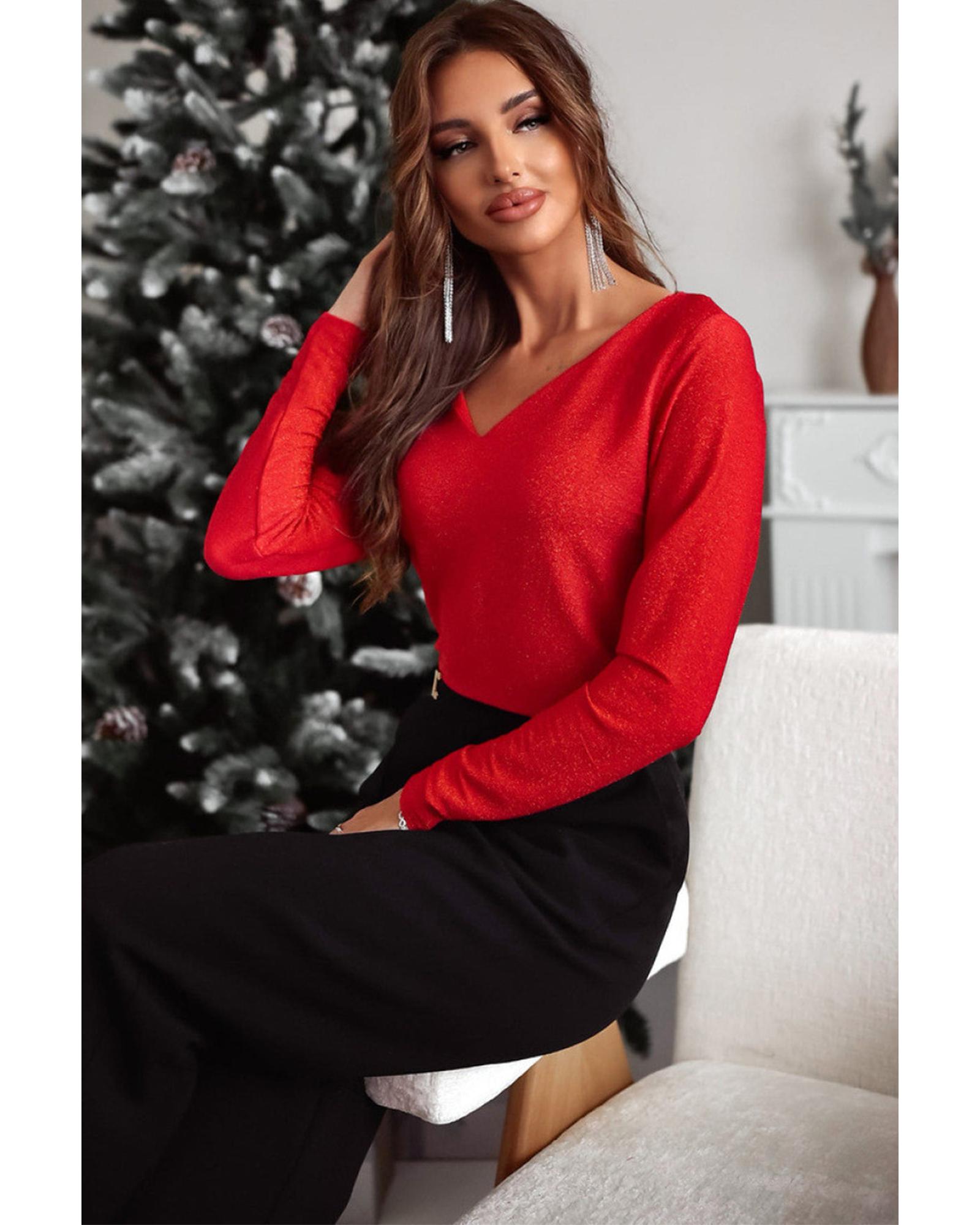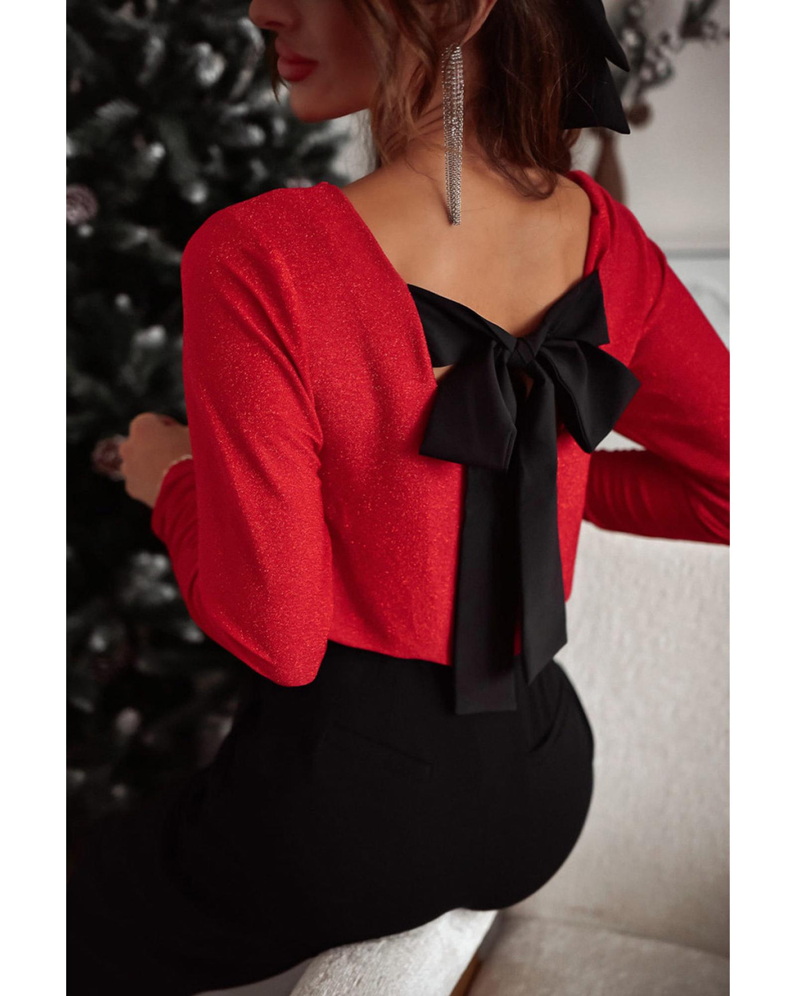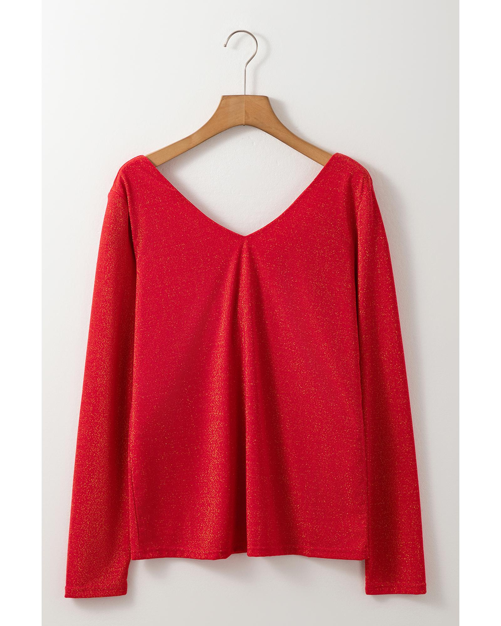 Racing Red Metallic Bowknot Open Back V Neck Top – XL