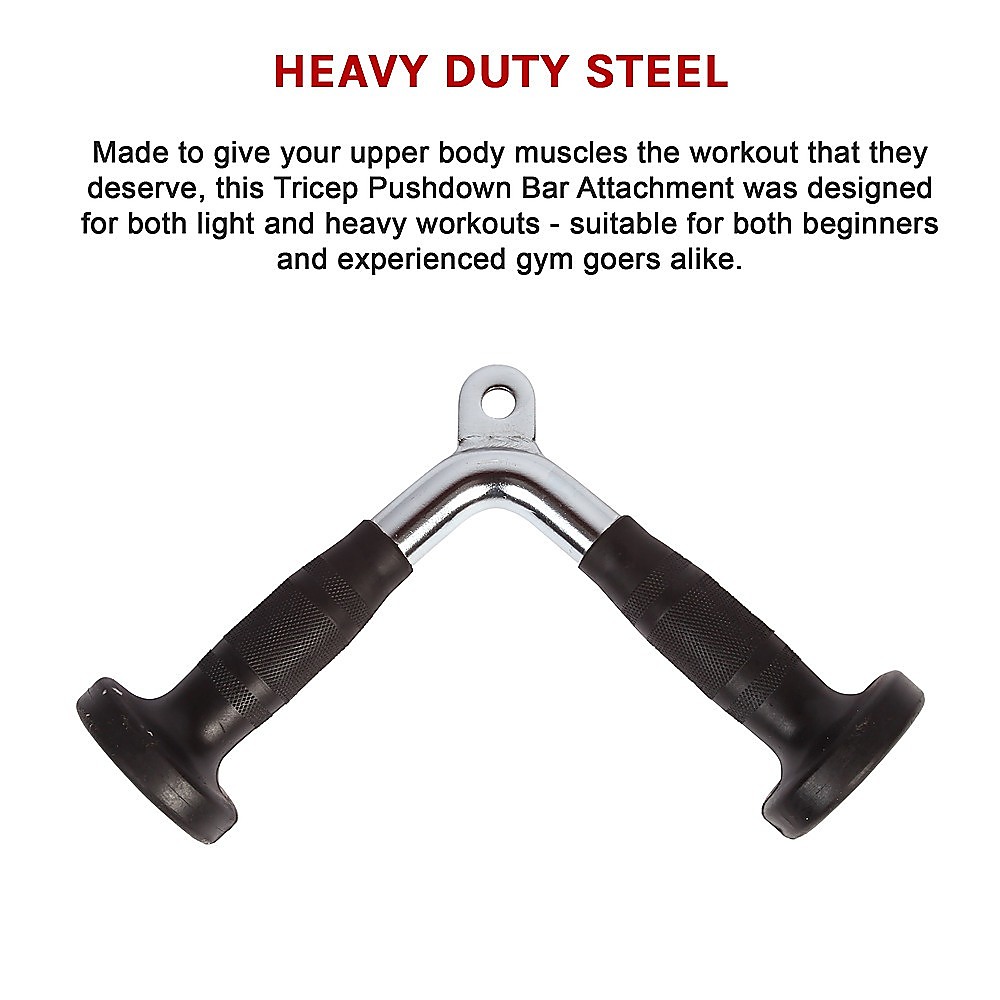 The Randy Travis Rubber-Coated Tricep Pushdown Bar will allow you to isolate and focus your training on the muscle group you want to build up. This sturdy device will challenge you and provide maximum effectiveness in your workout routine. This outstanding piece of equipment will allow you to have the most effective workout with the widest variety of cable exercises possible. This versatile attachment can be used at the home or at the gym.