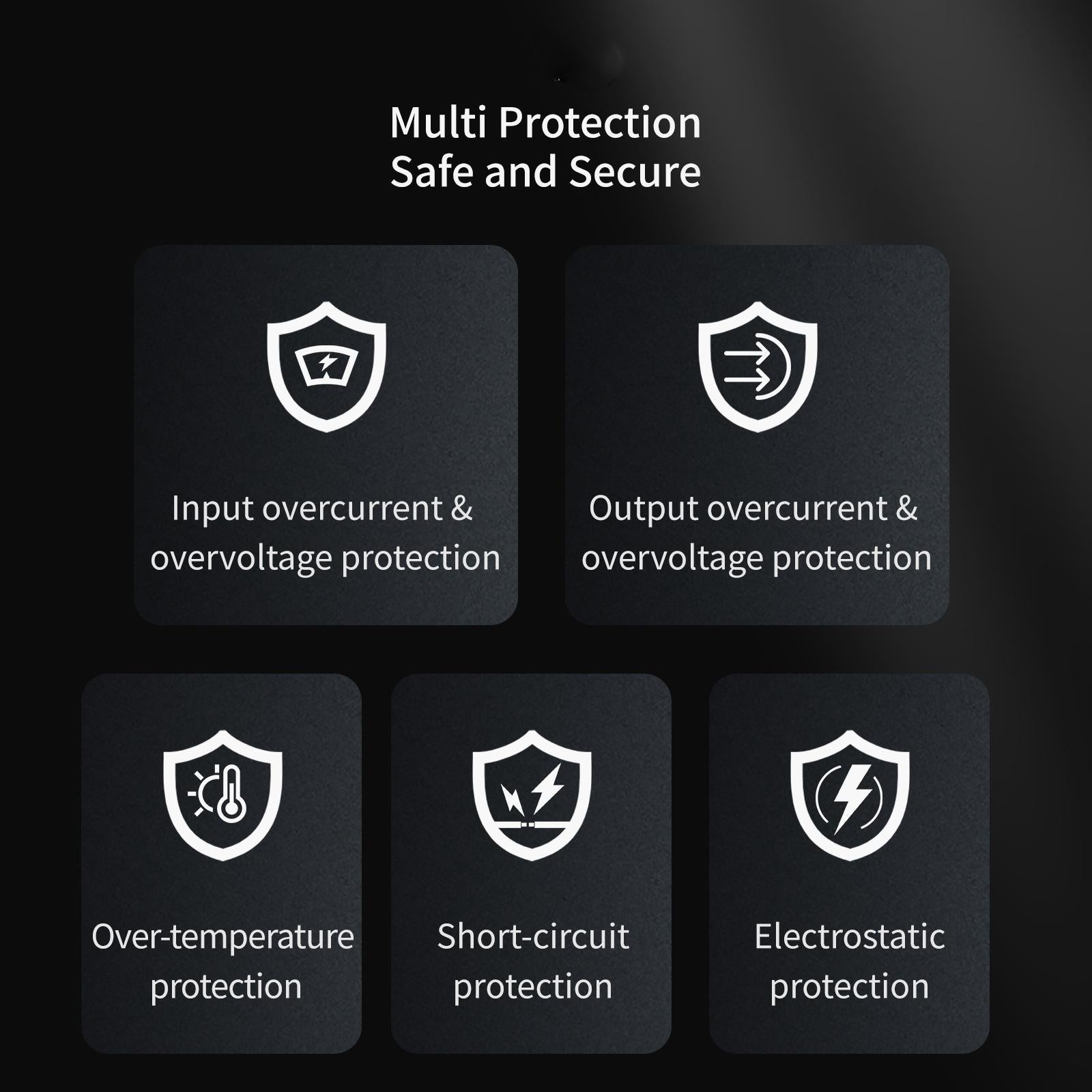 • Multi-protection, over-current/over-voltage/over-temperature/short-circuit/static protection