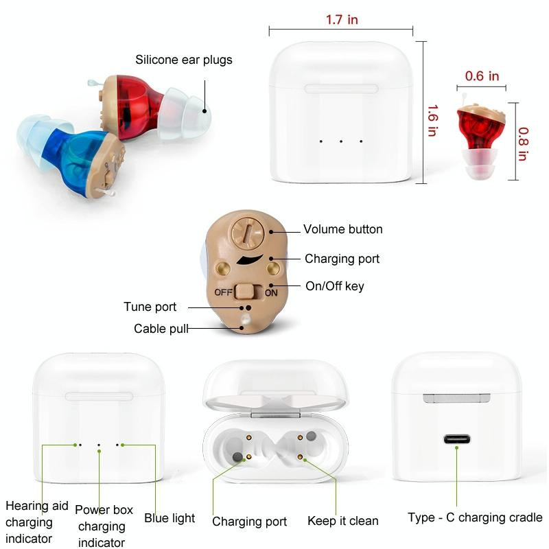 • 1 x Rechargeable Cic Hearing Aids Type C Port Invisible Red / Blue