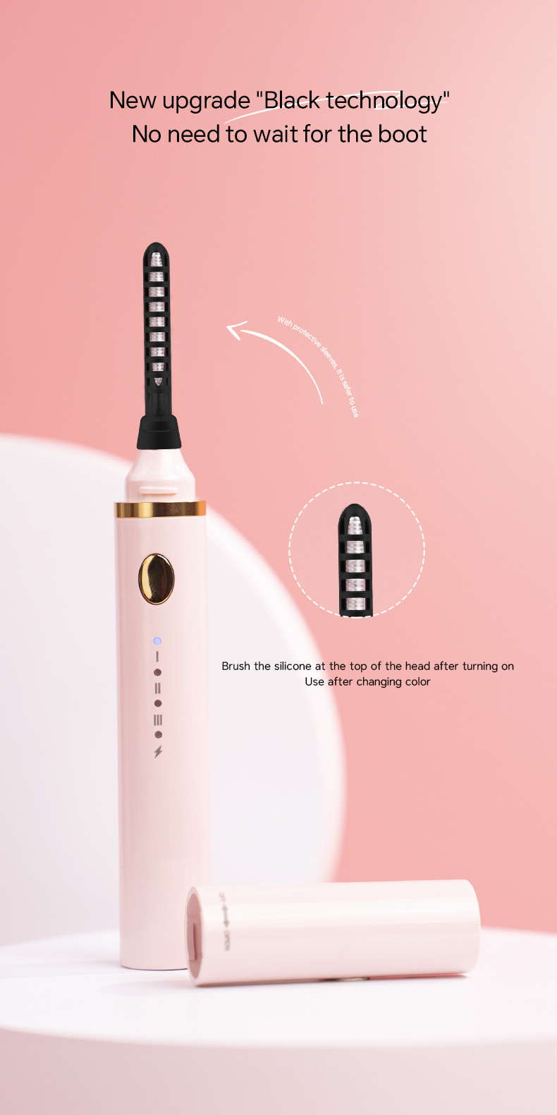 This product contains a lithium battery. Please do not aim the heated element directly at eyes or face. For best results, use on clean, dry eyelashes before applying mascara. Allow the curler to heat to the desired temperature before use. Gently press against lashes and hold for a few seconds. Do not use if you are wearing contact lenses. Keep this product out of reach of children. Keep the battery away from ignition sources. Non-professionals should not attempt to disassemble the product body. Clean the curler head after use. Do not wash the main body with water.