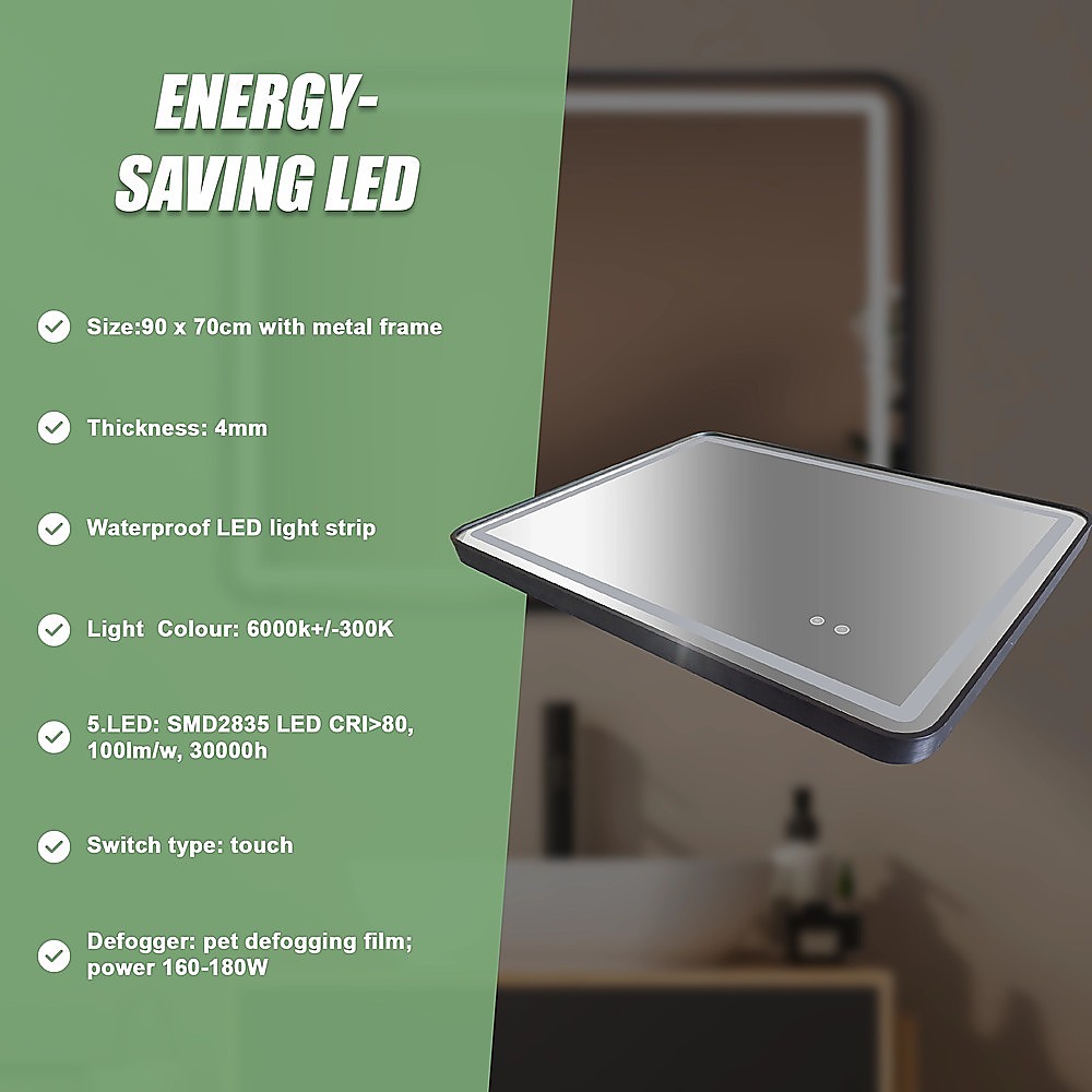 Rectangular Mirror LED Anti-Fog Illuminated Bathroom Living Room – 90x70cm