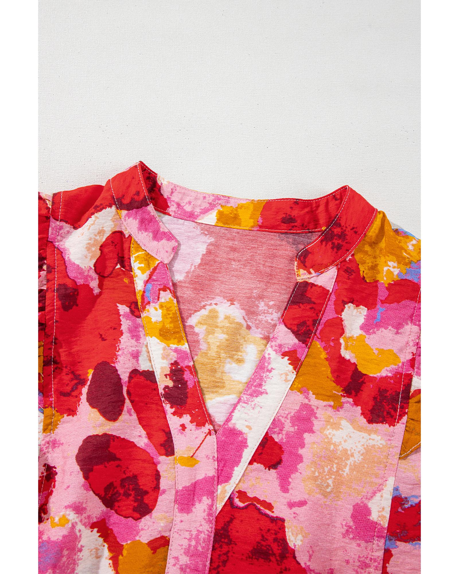 Red Abstract Print Split V Neck Ruffle Short Sleeve Blouse – L