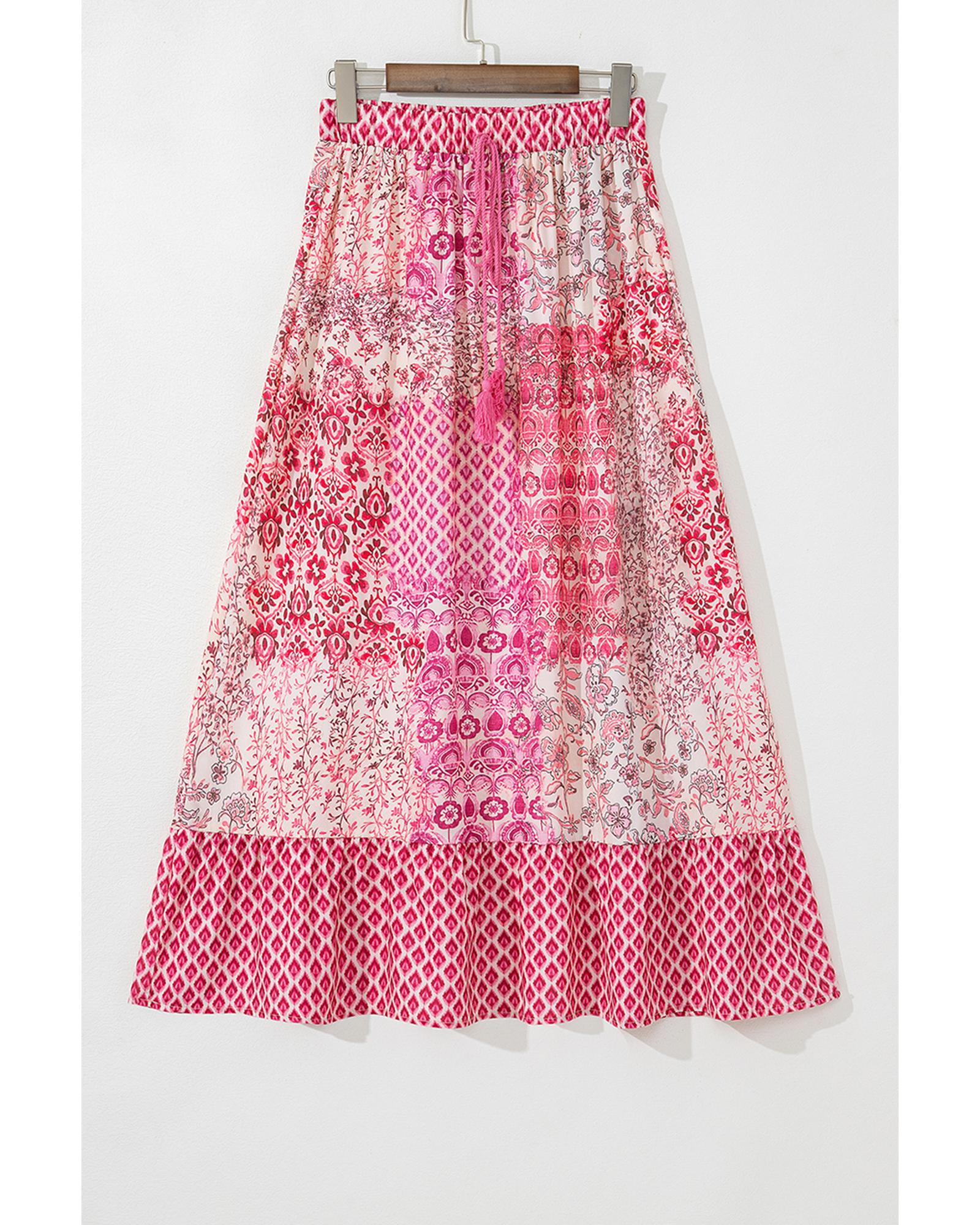 Red Boho Pattern Print Tassel Drawstring High Waist Maxi Dress – M