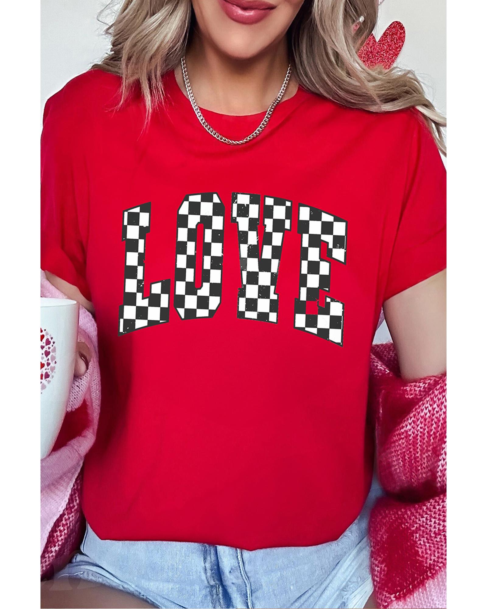 Red Checkered LOVE Letter Graphic Valentines T Shirt – XL