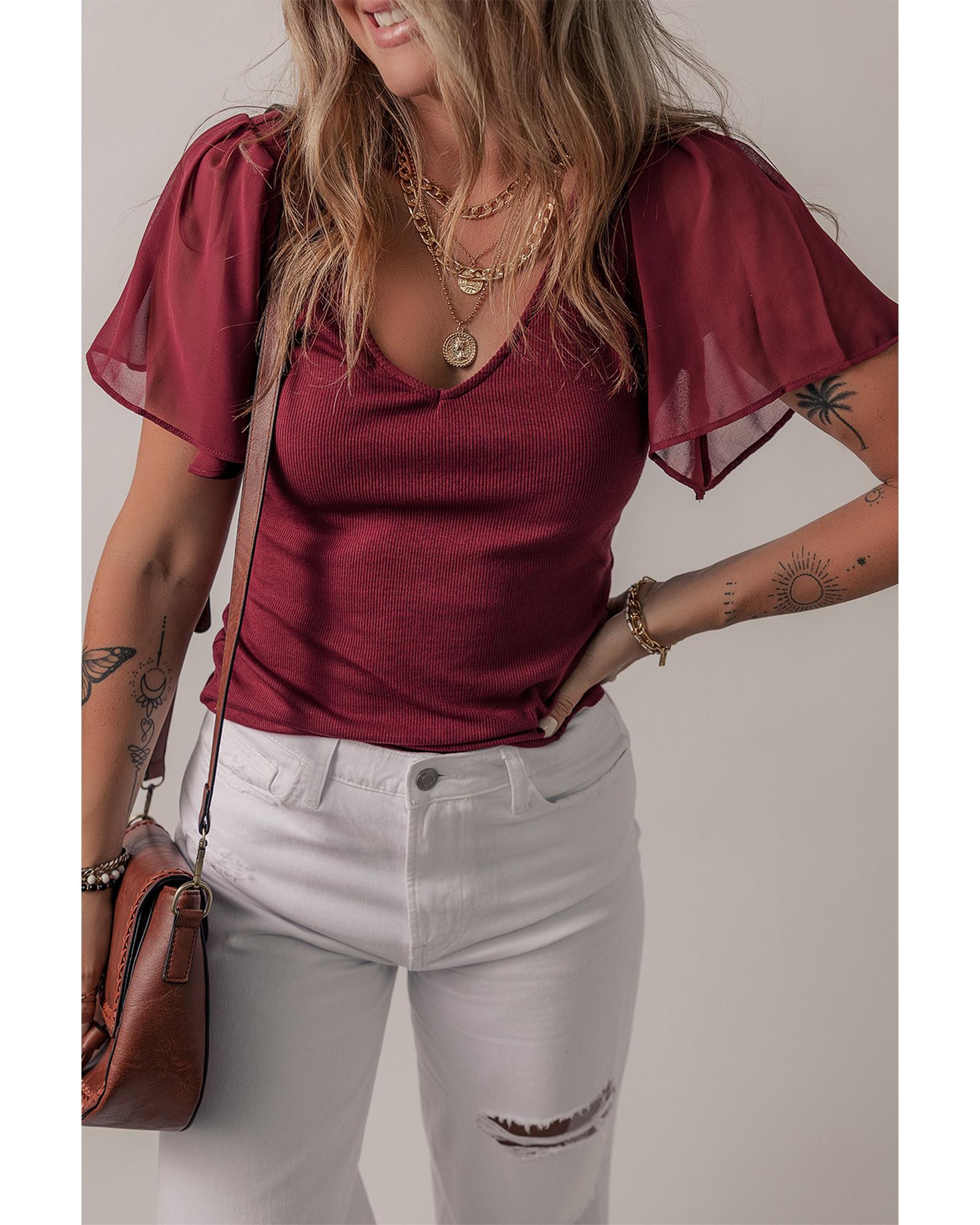 Red Dahlia Mesh Ruffled Sleeve Slim Fit V Neck Top – S