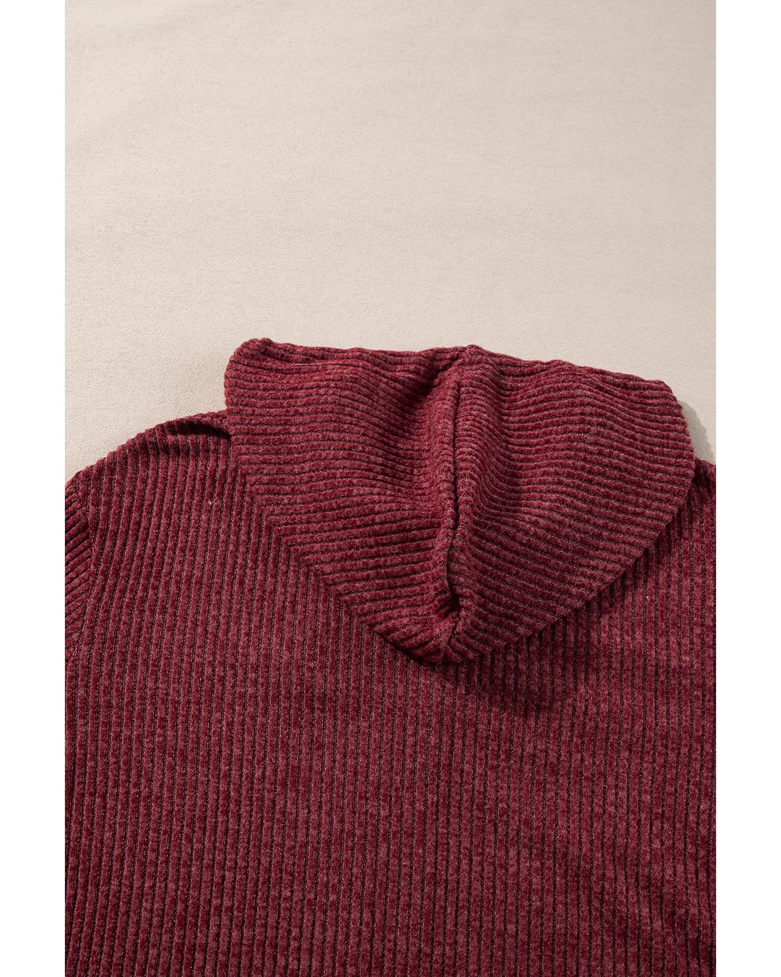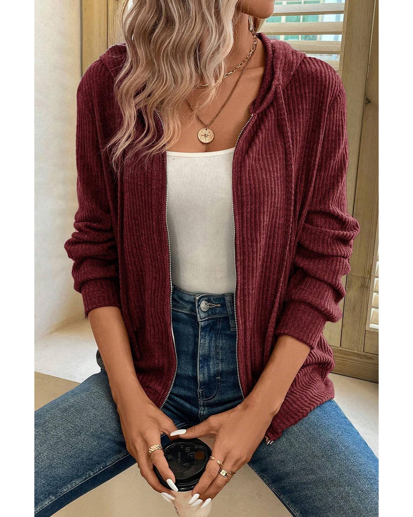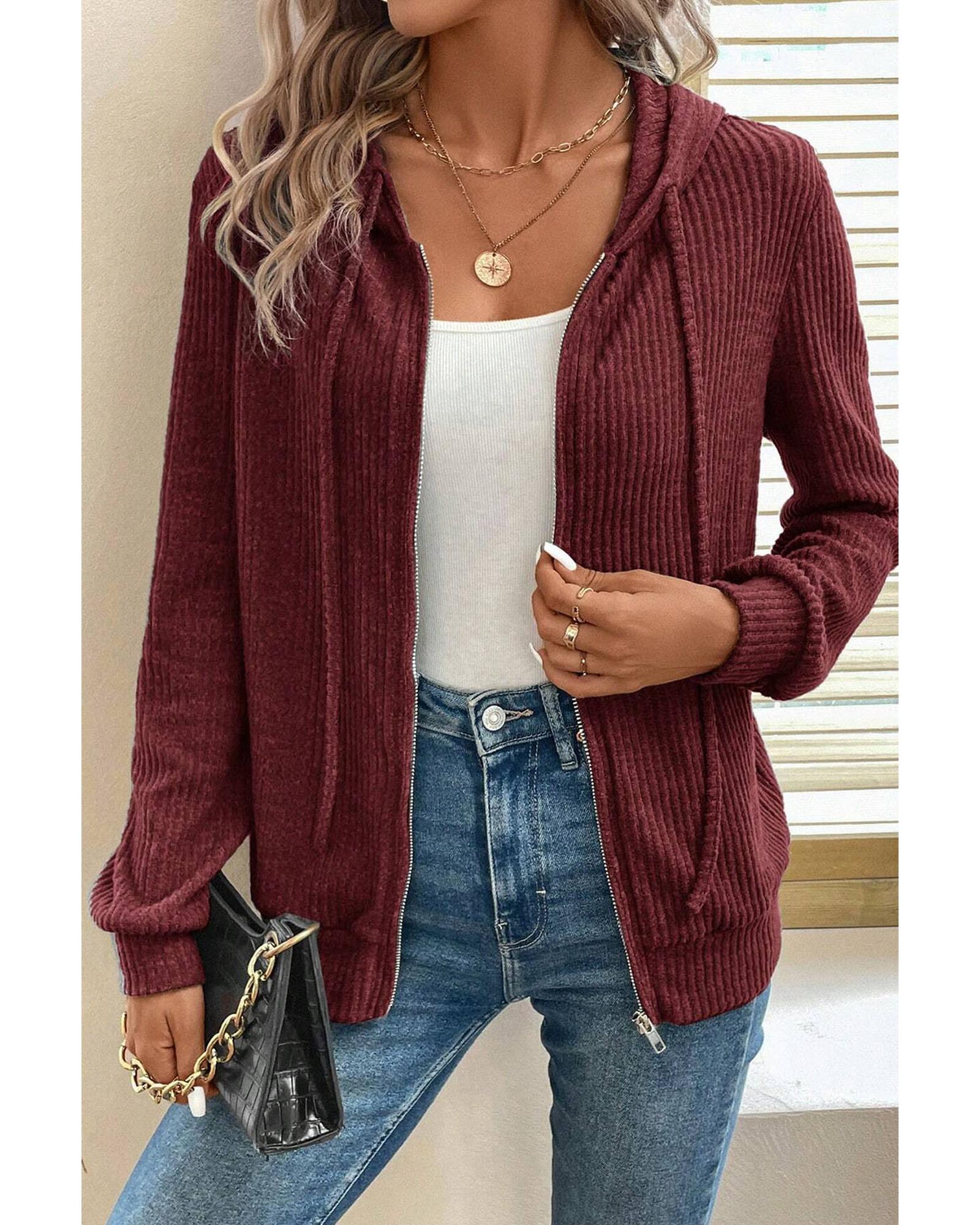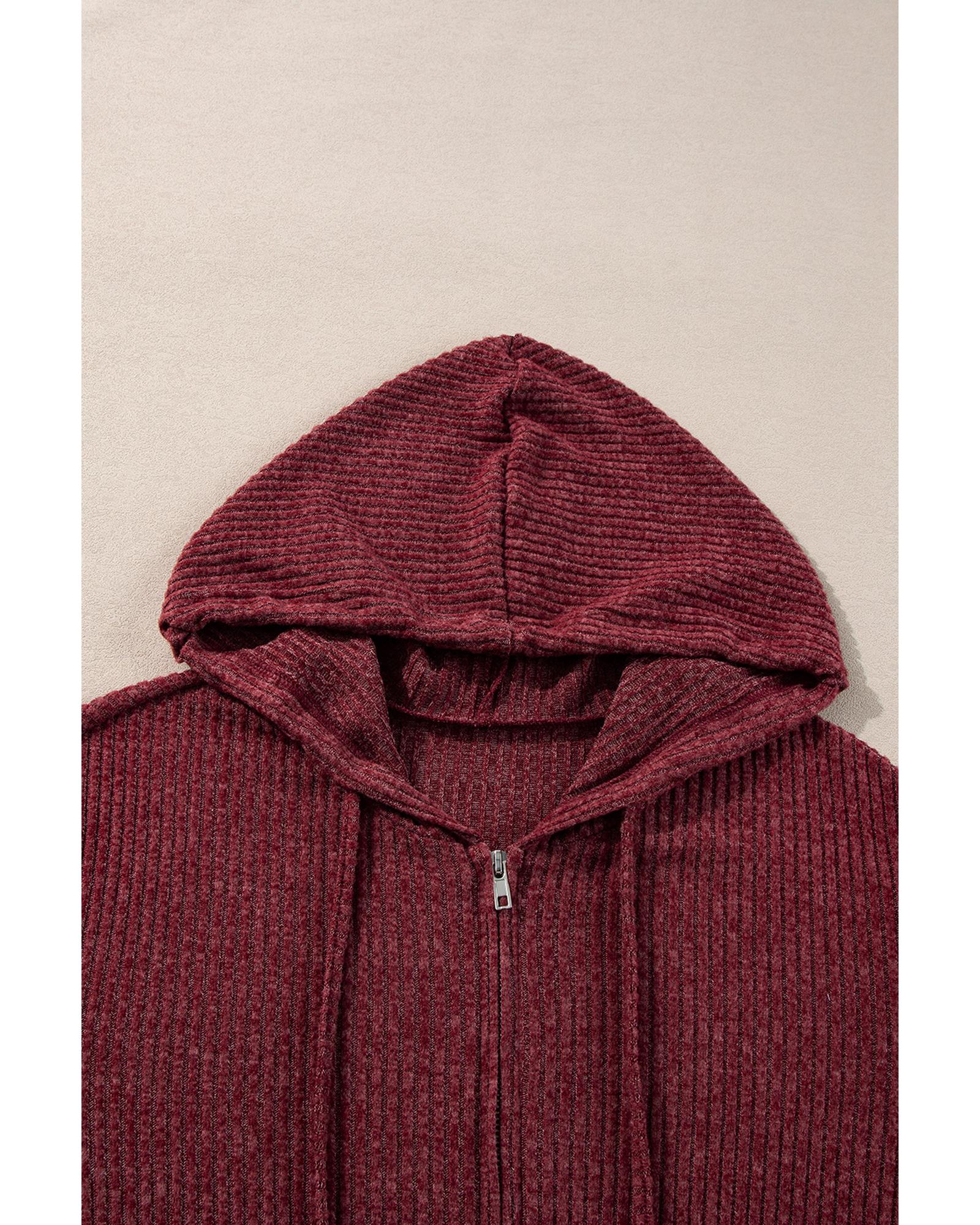 Red Dahlia Ribbed Zip Up Front Drawstring Hoodie – S