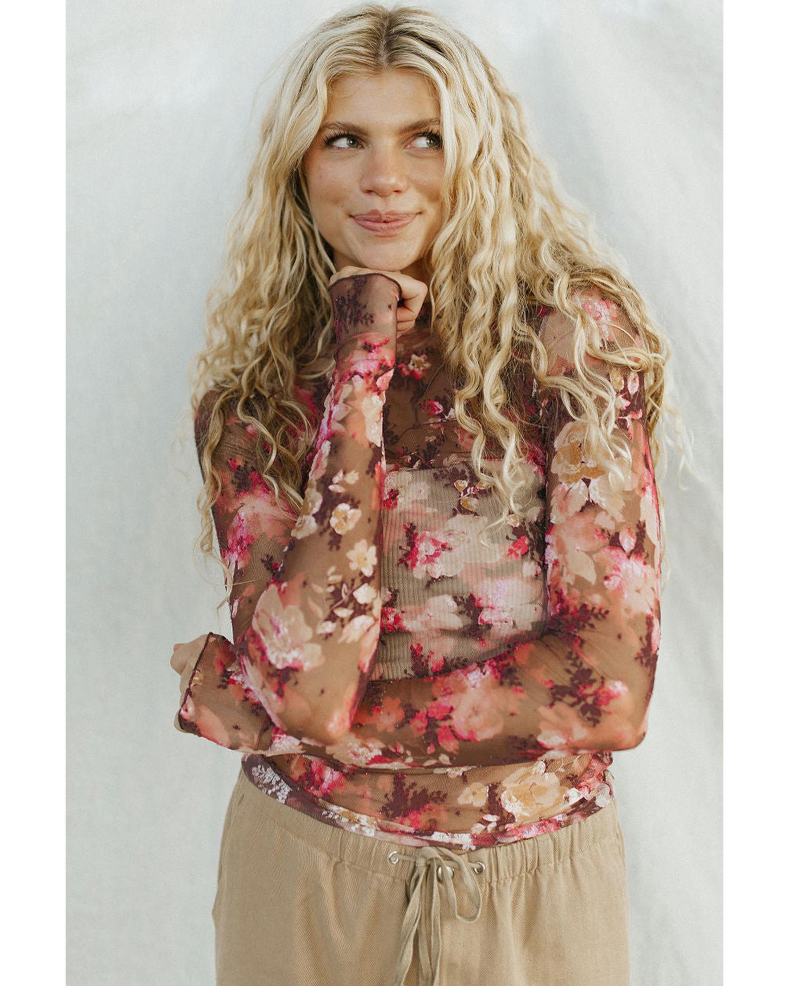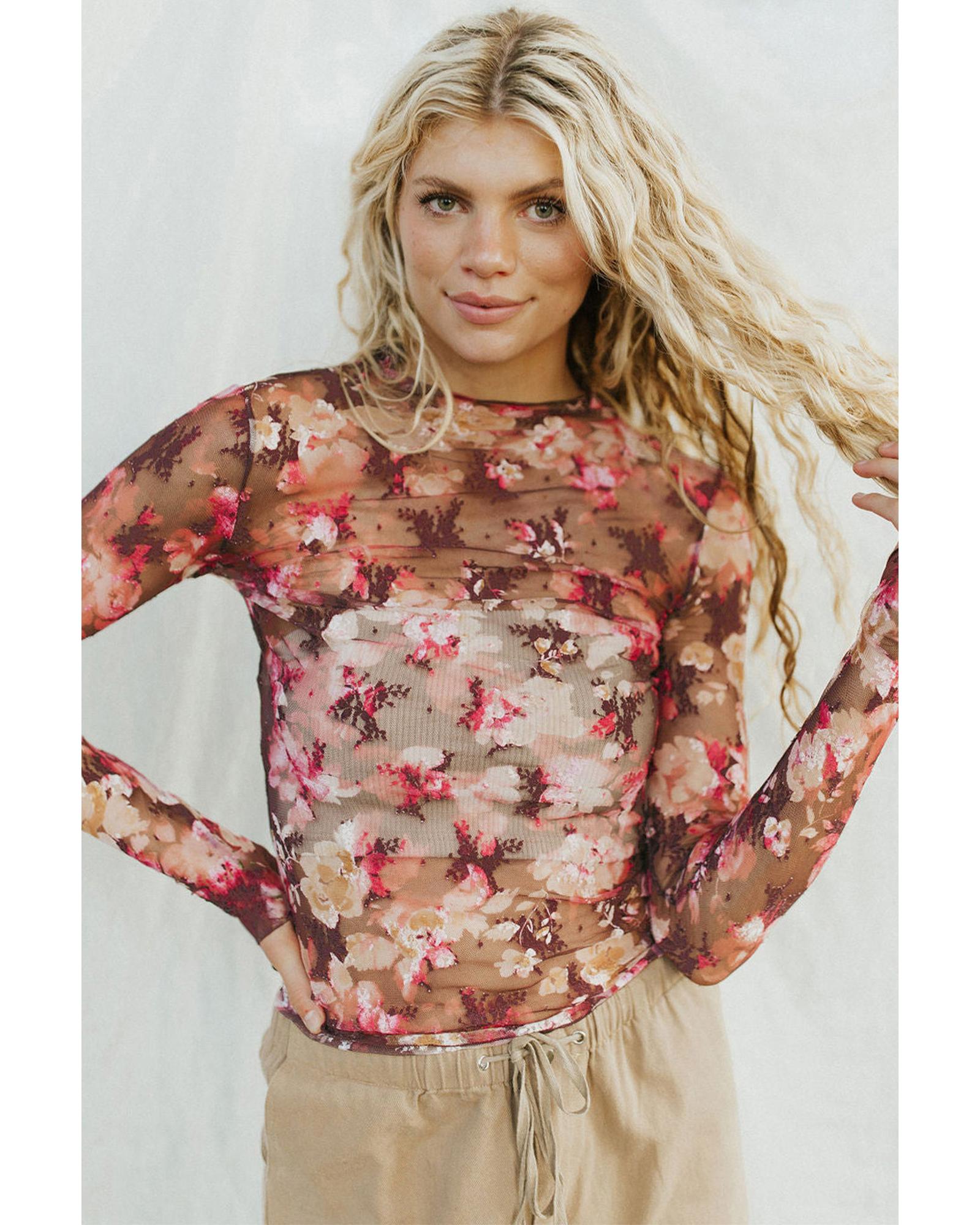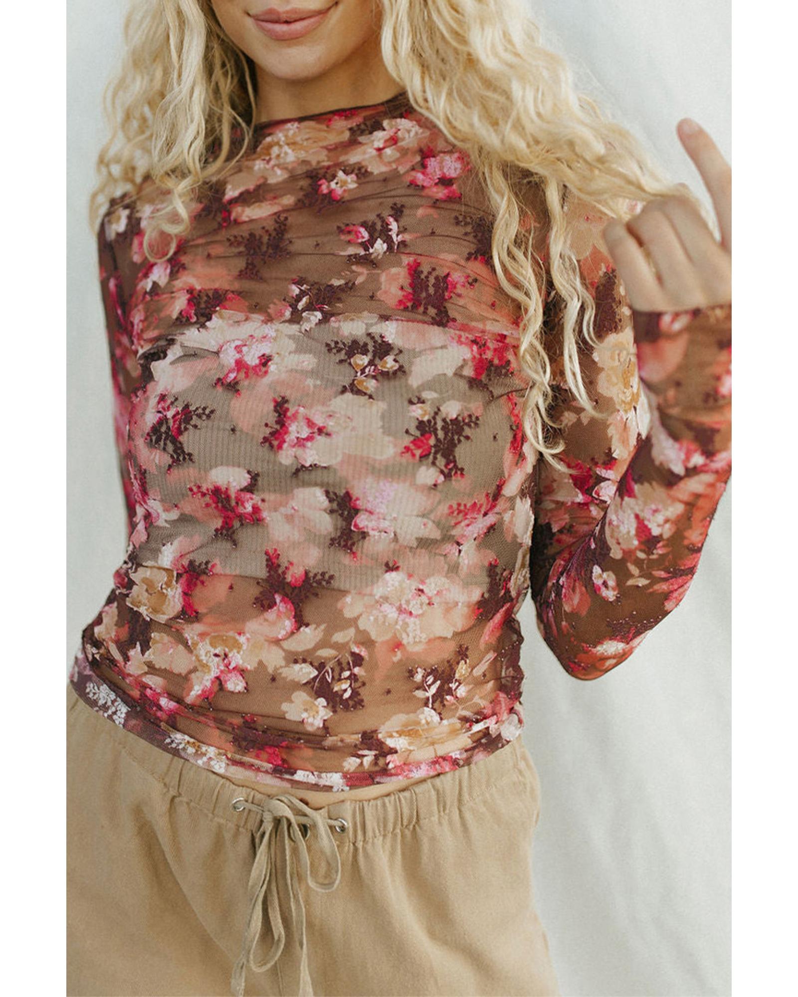 Red Floral Print Sheer Mesh Long Sleeve Top – L