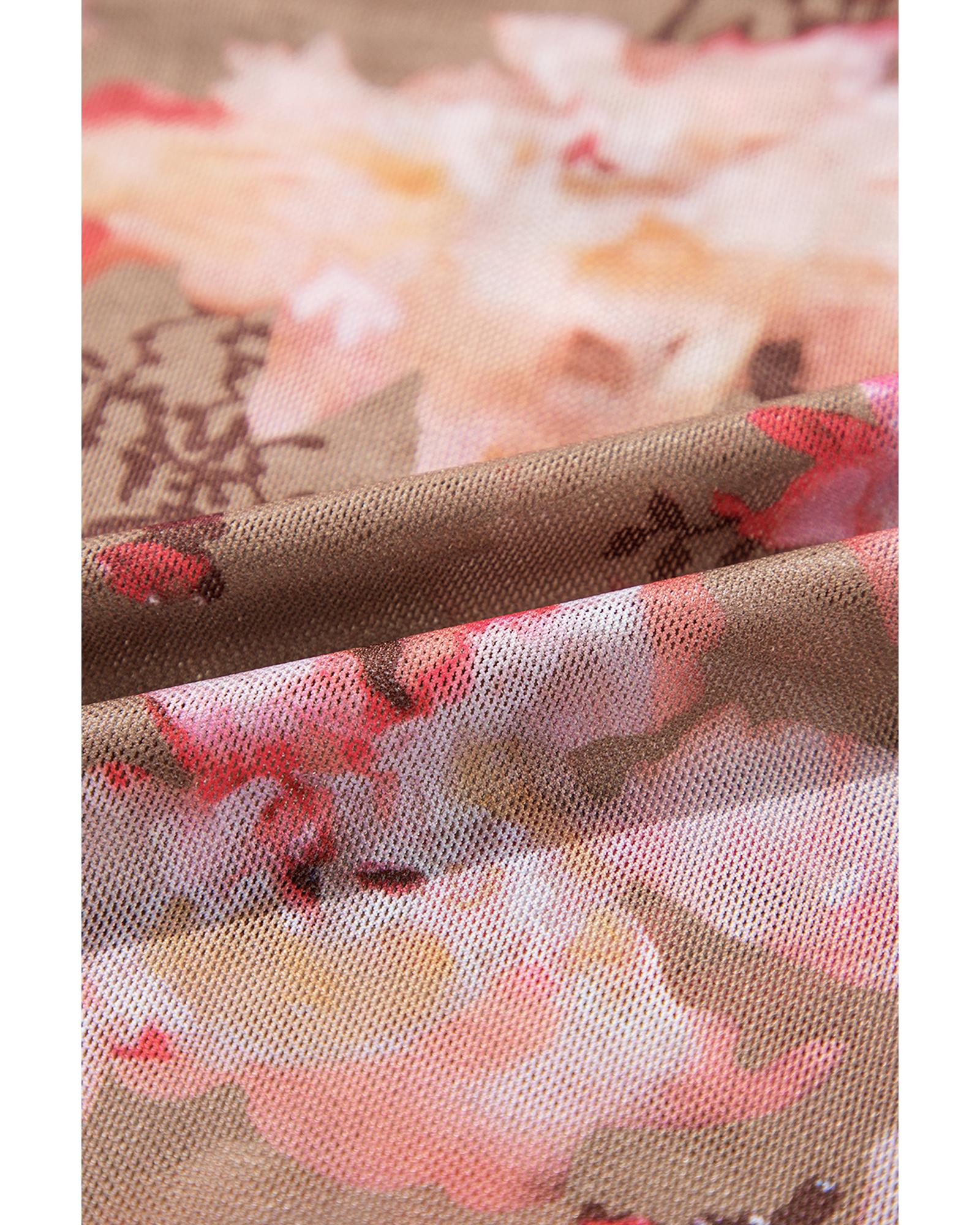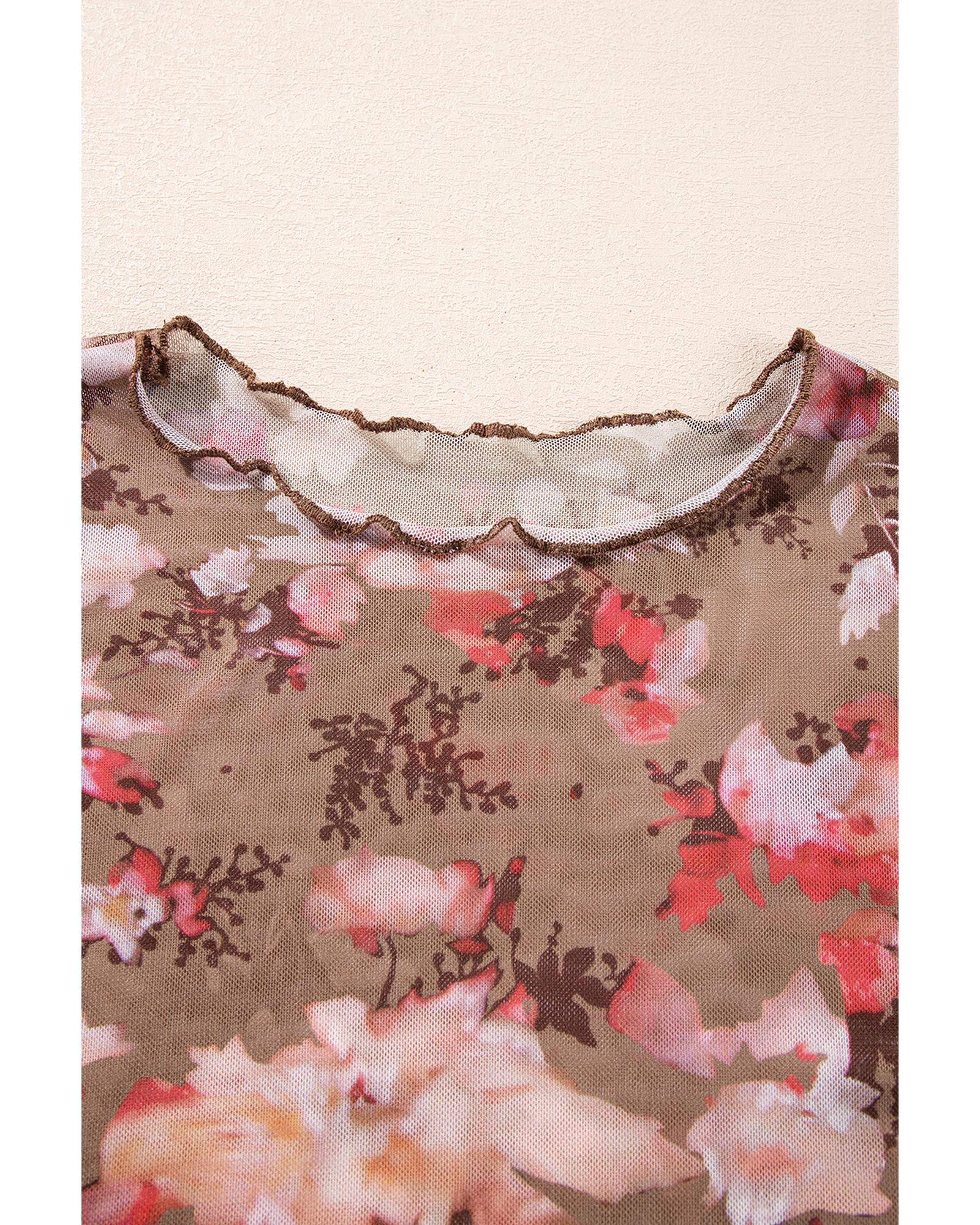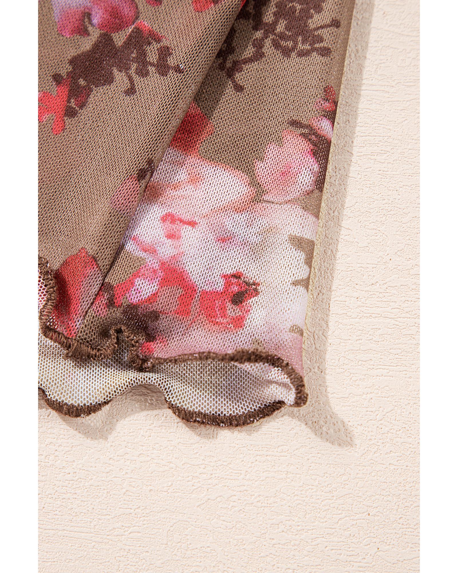 Red Floral Print Sheer Mesh Long Sleeve Top – L