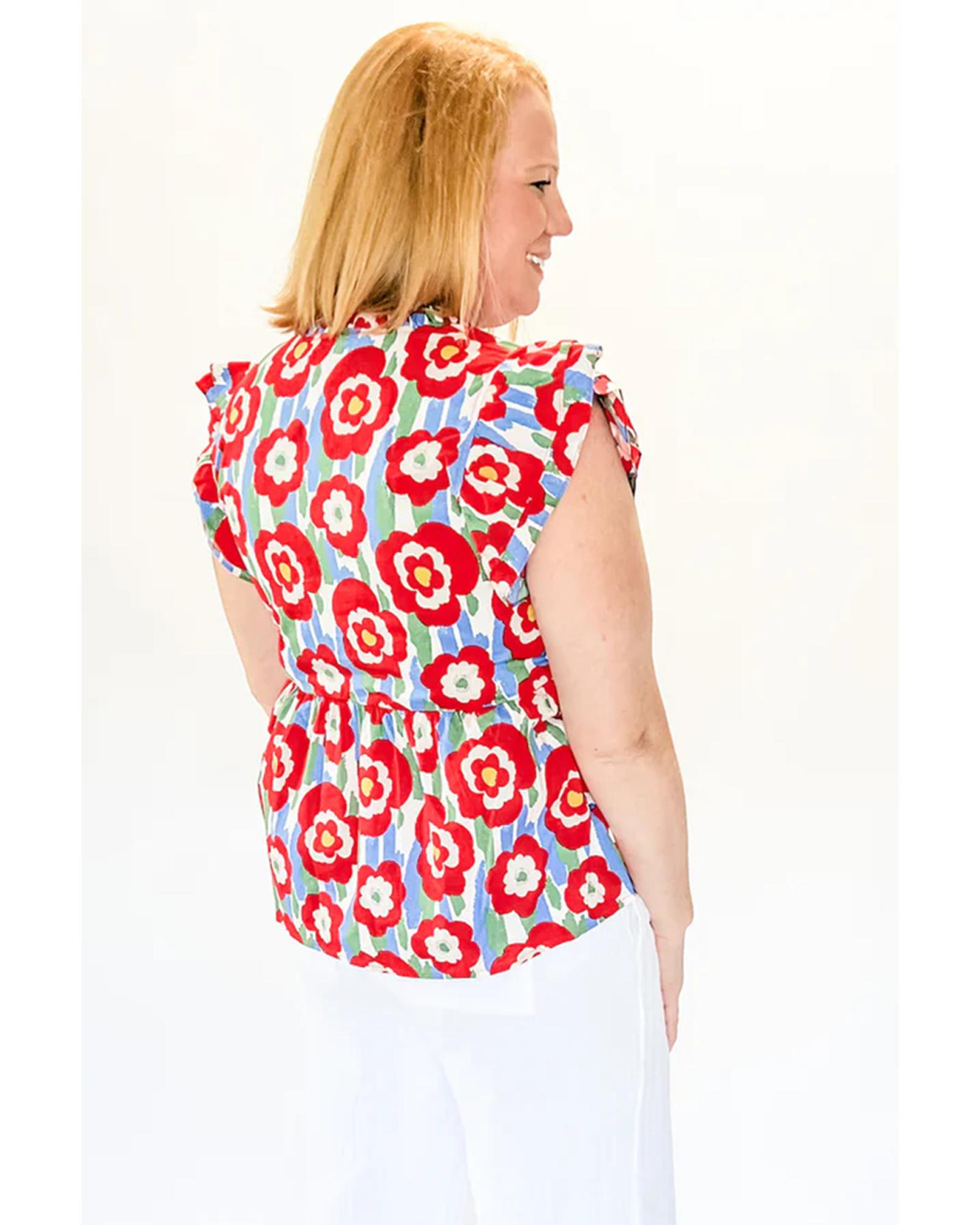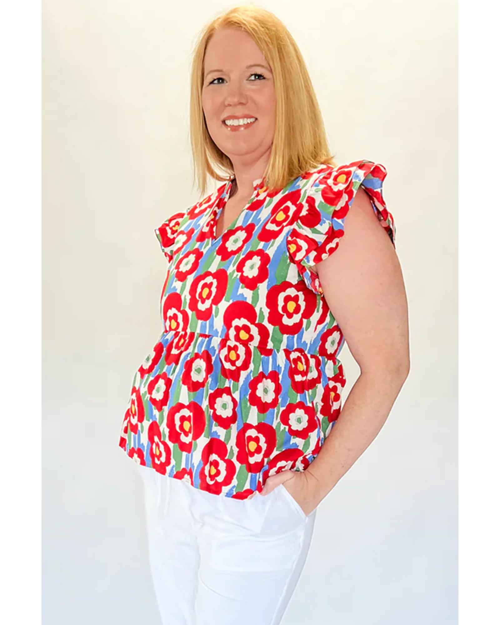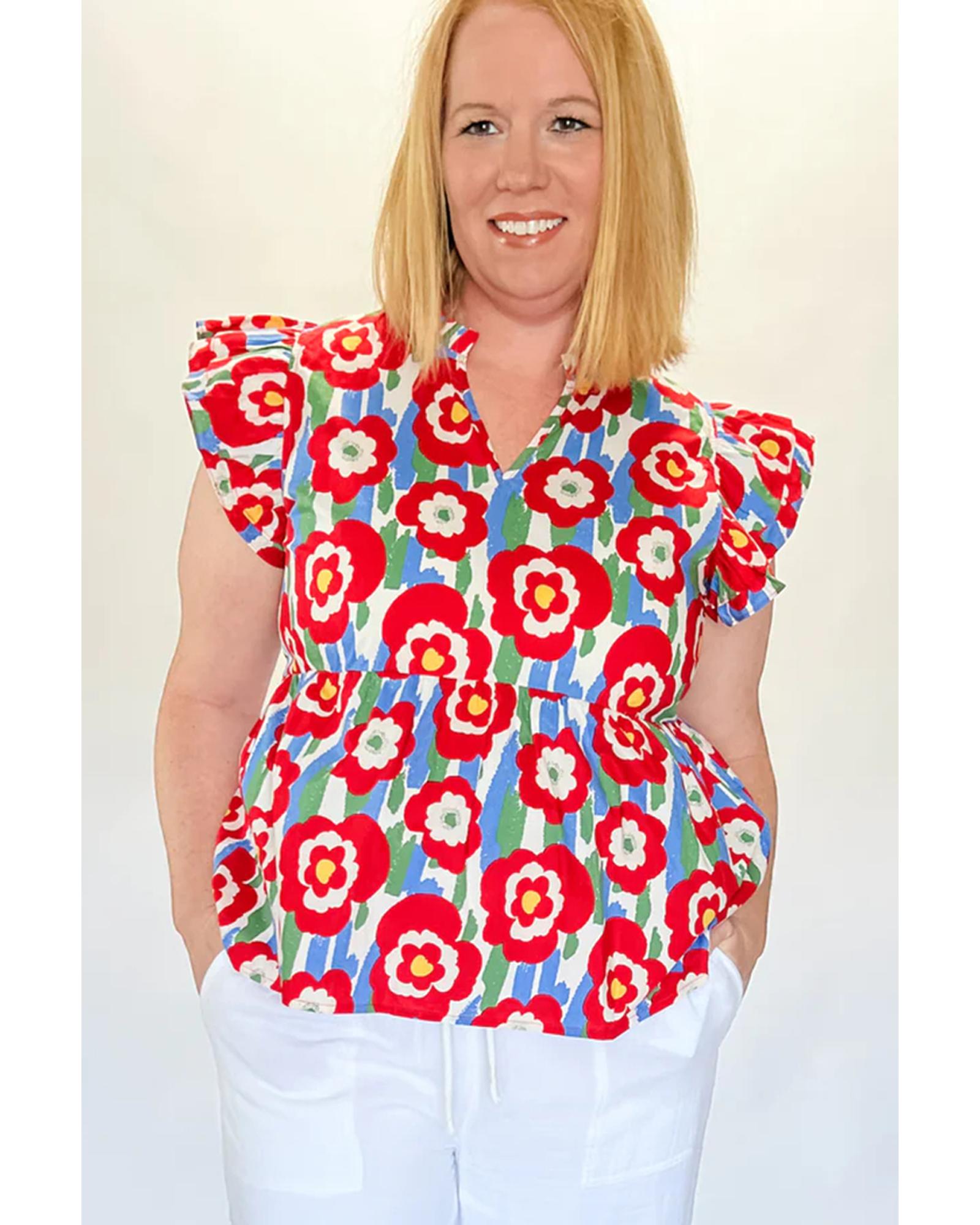 Red Plus Size Floral Print Ruffle Trim Split Neck Peplum Top – 2X