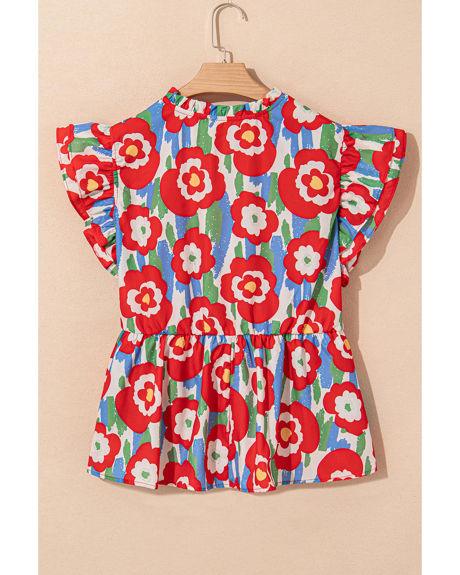 Red Plus Size Floral Print Ruffle Trim Split Neck Peplum Top - 1X