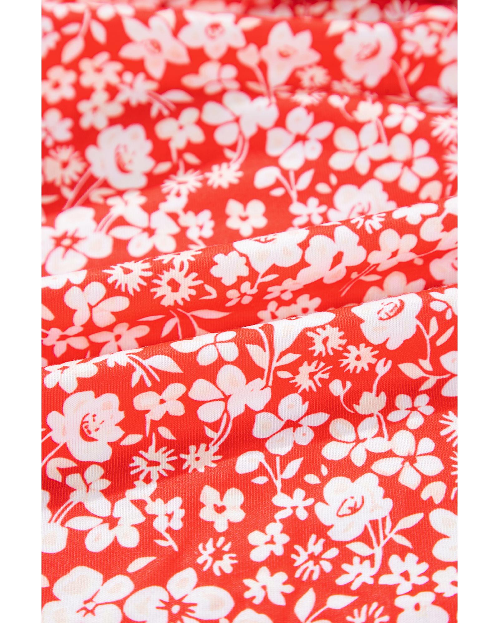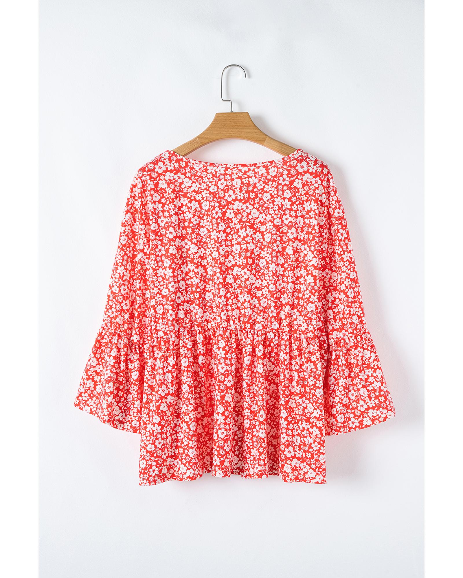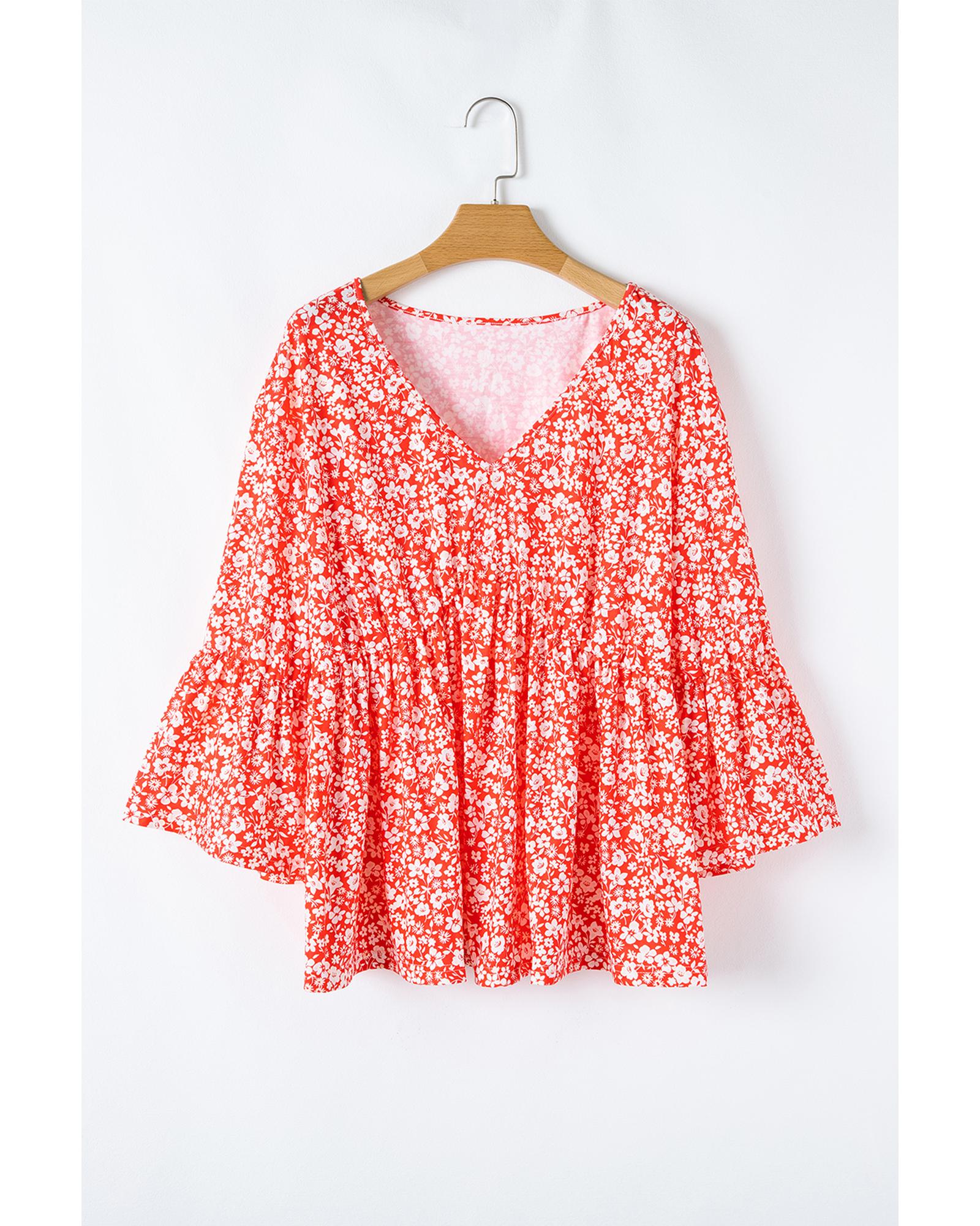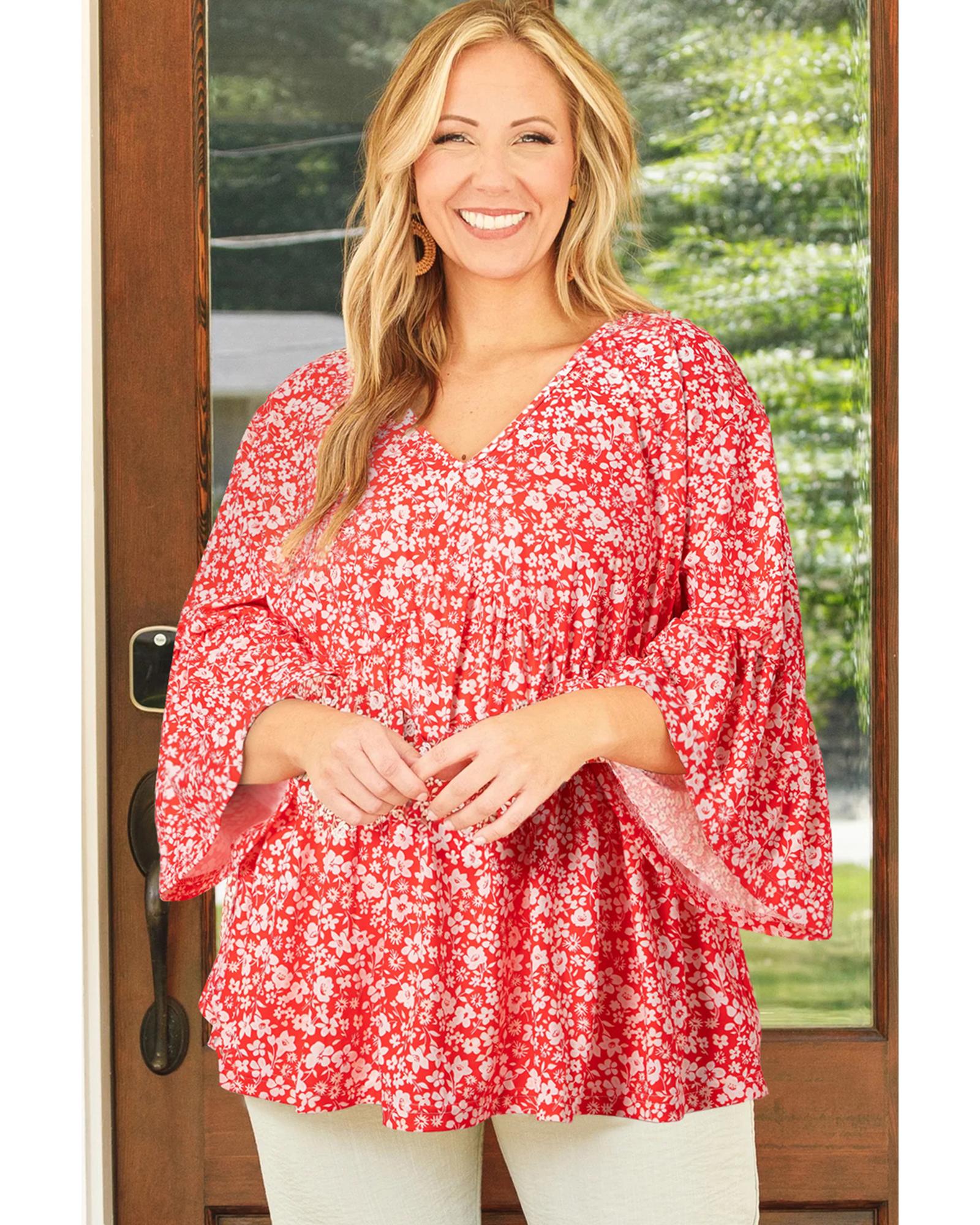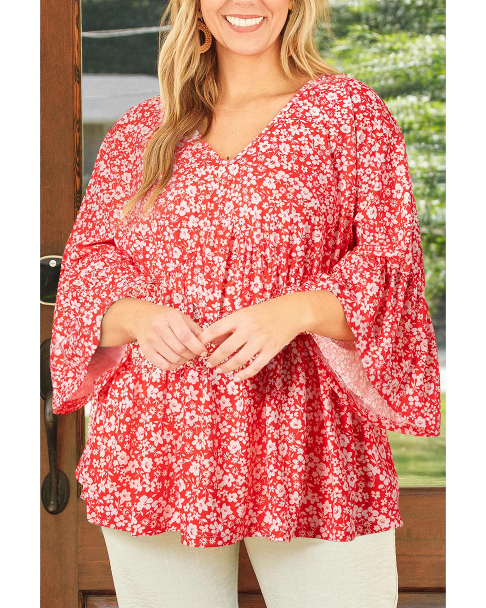 Red Plus Size Floral V Neck Flared Bracelet Sleeve Blouse – 4X