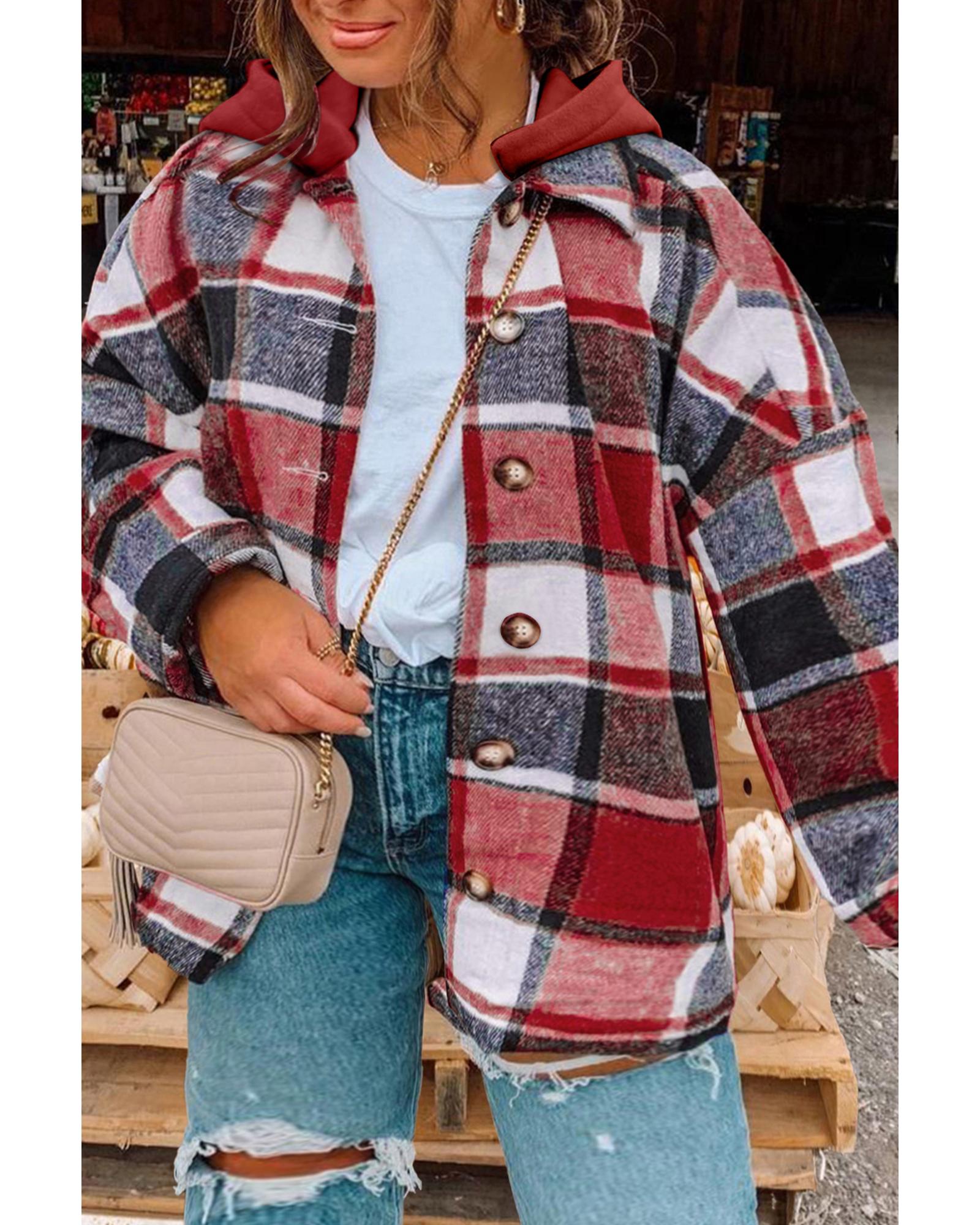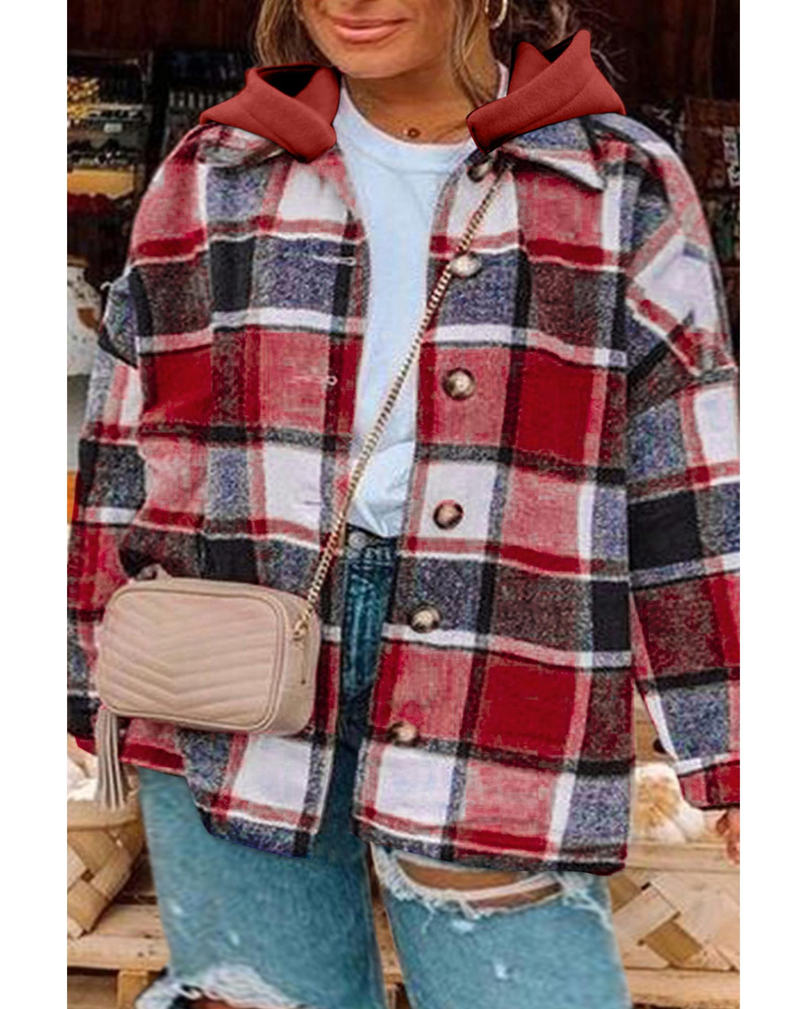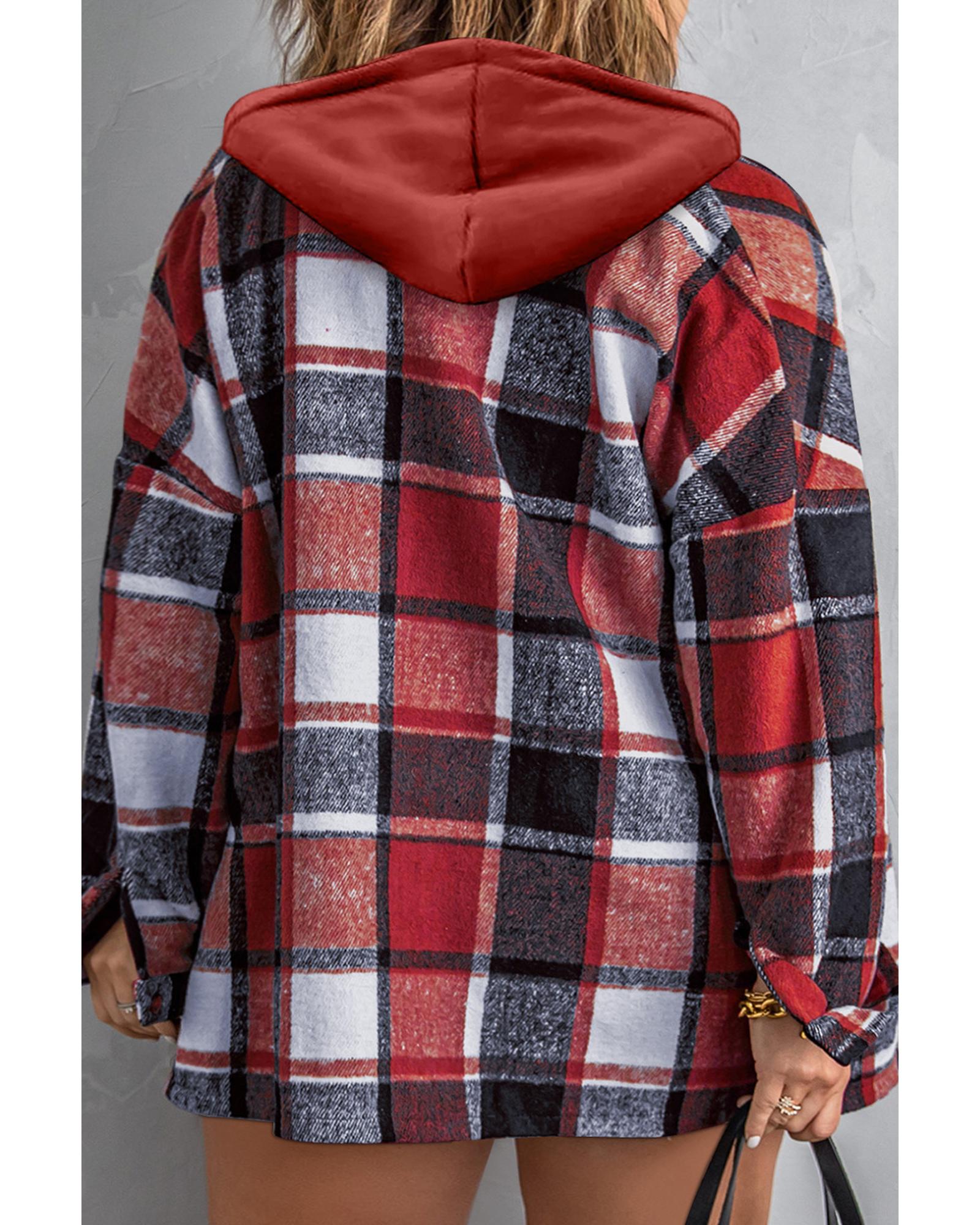 Red Printed Plus Size Plaid Button up Hooded Jacket – 1X