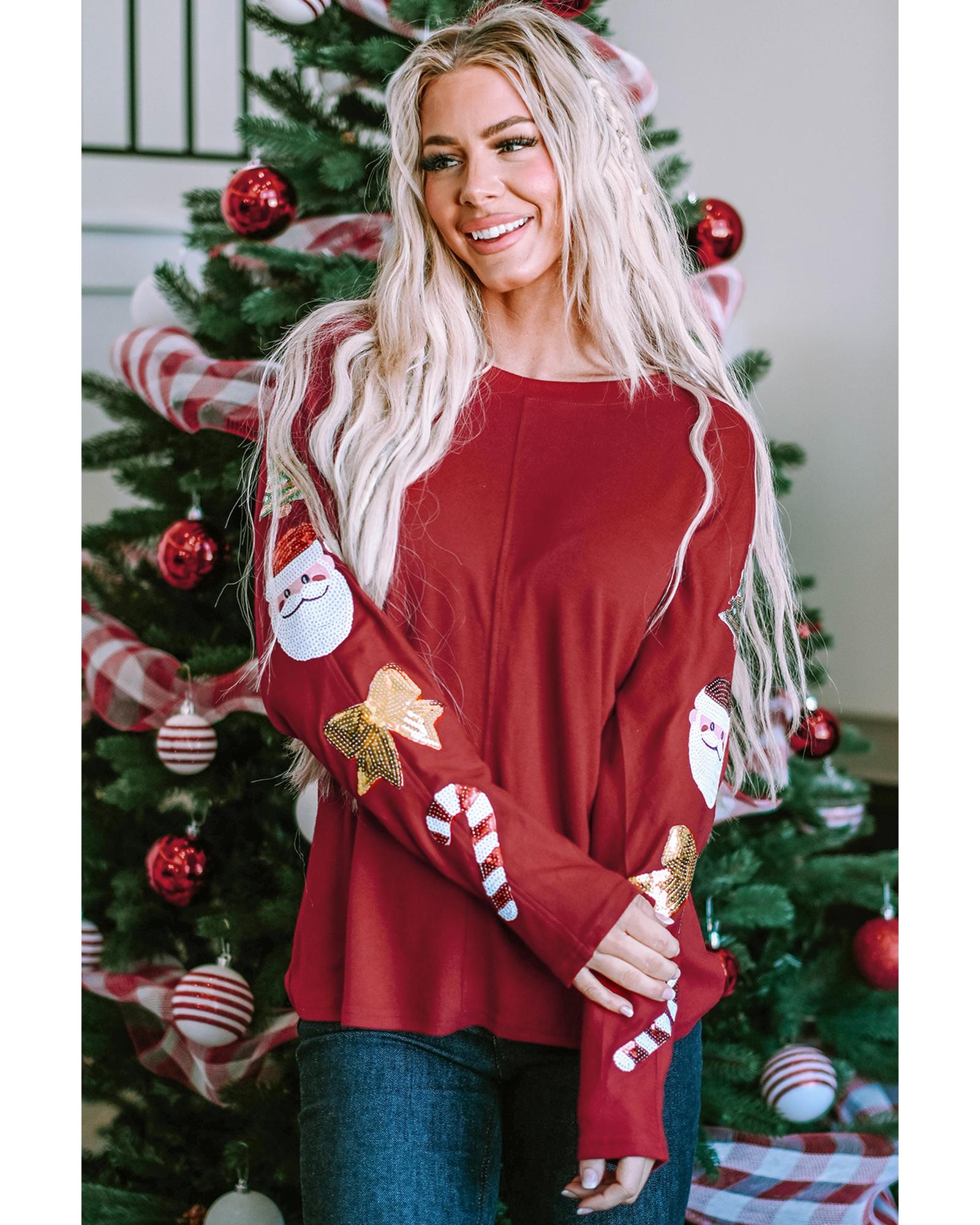 Red Sequined Christmas Favor Sleeve Casual Pullover – S