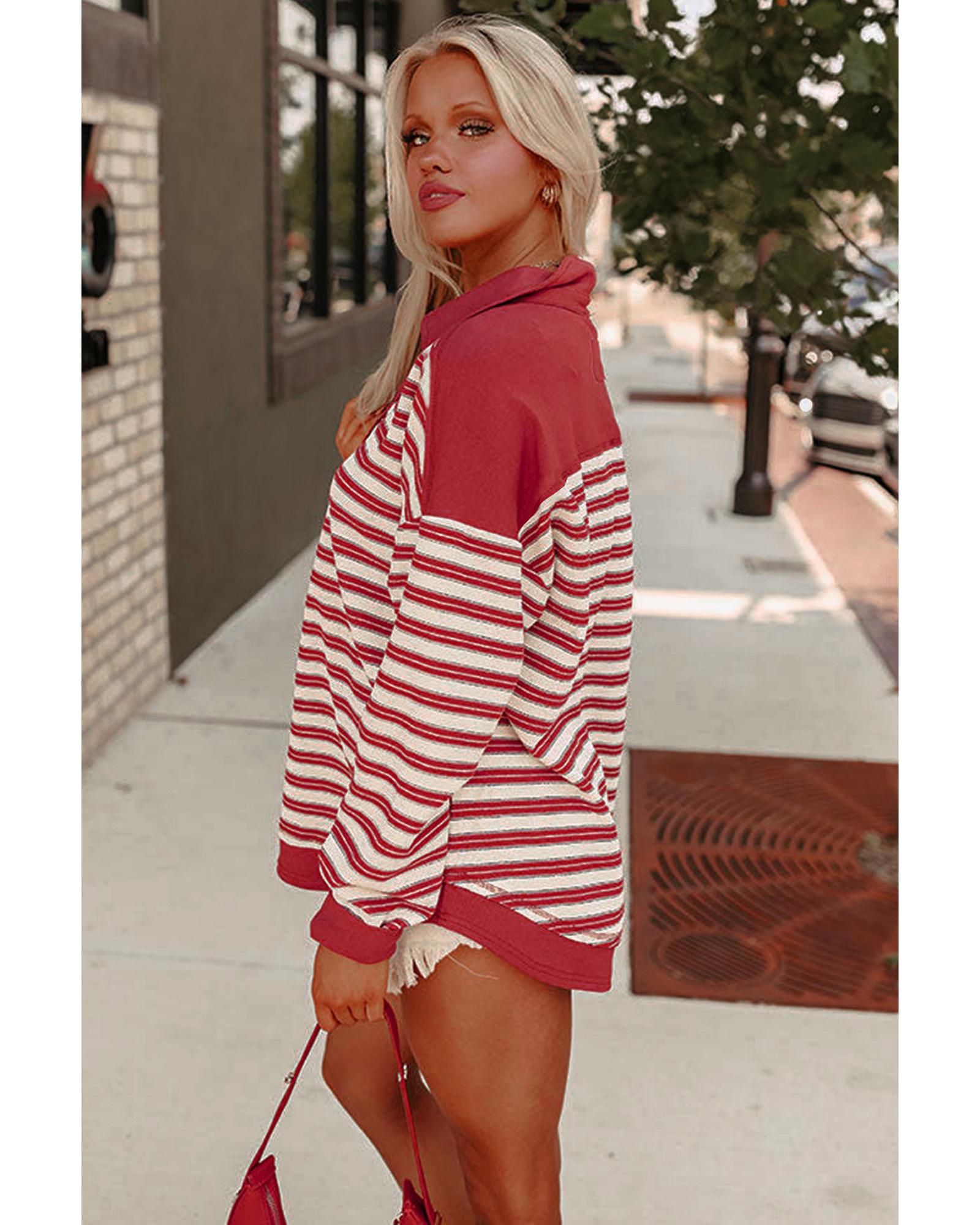 Red Stripe Buttoned V Neck Collared Drop Shoulder Top – XL