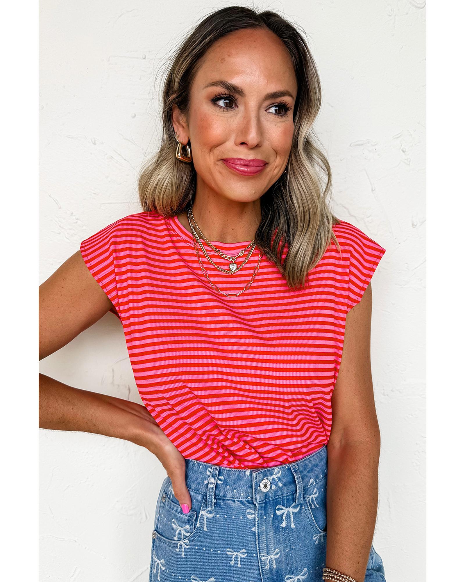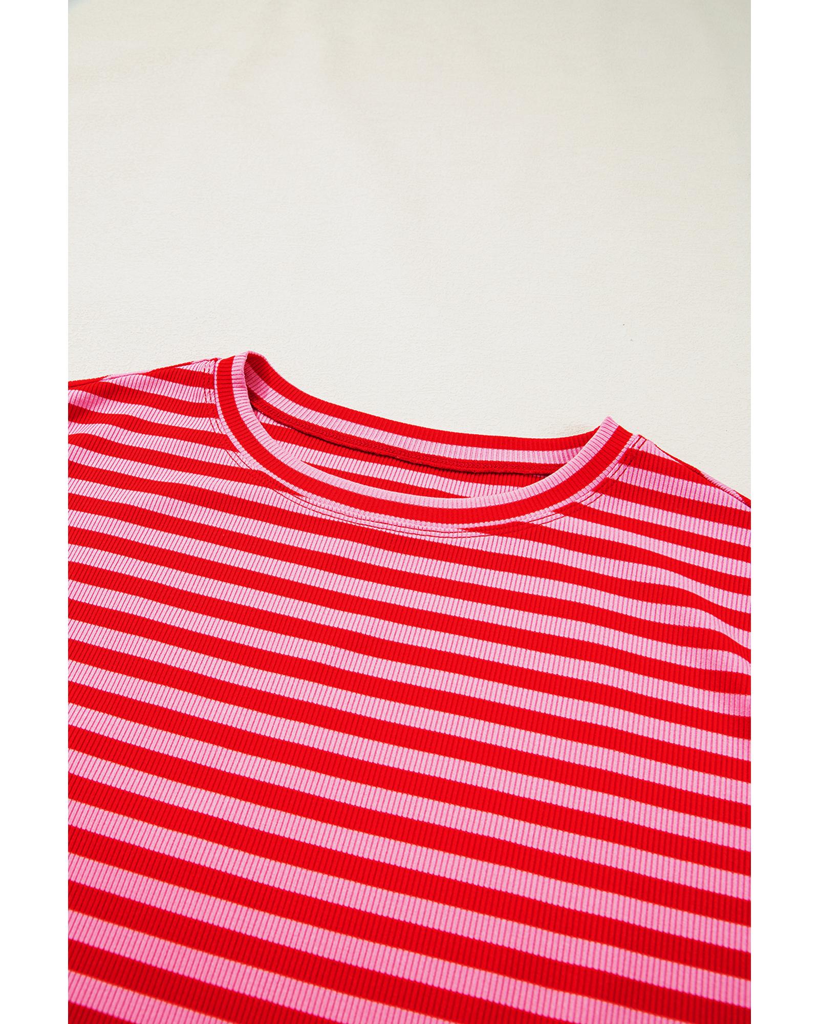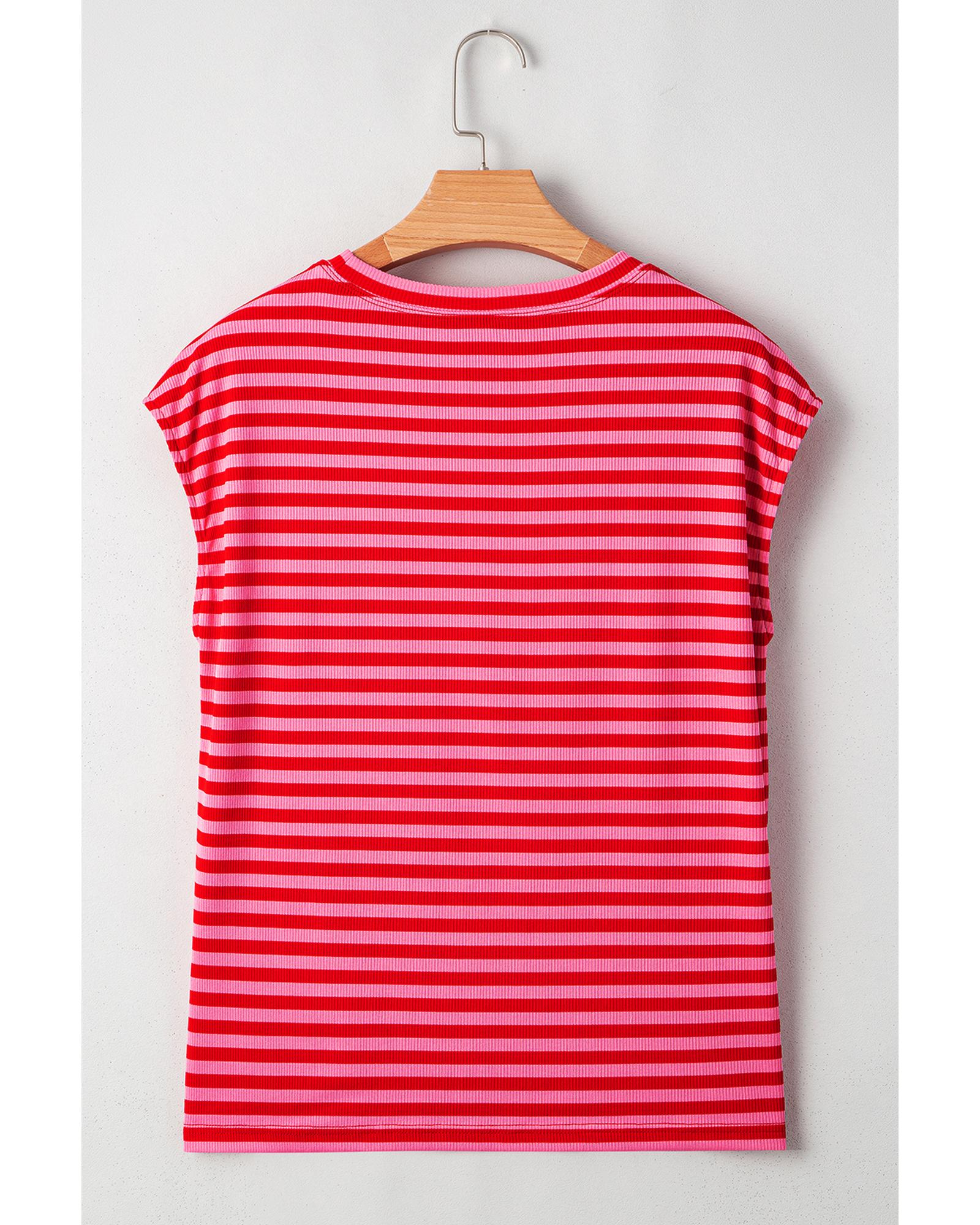 Red Stripe Ribbed Cap Sleeve Round Neck T Shirt – XL