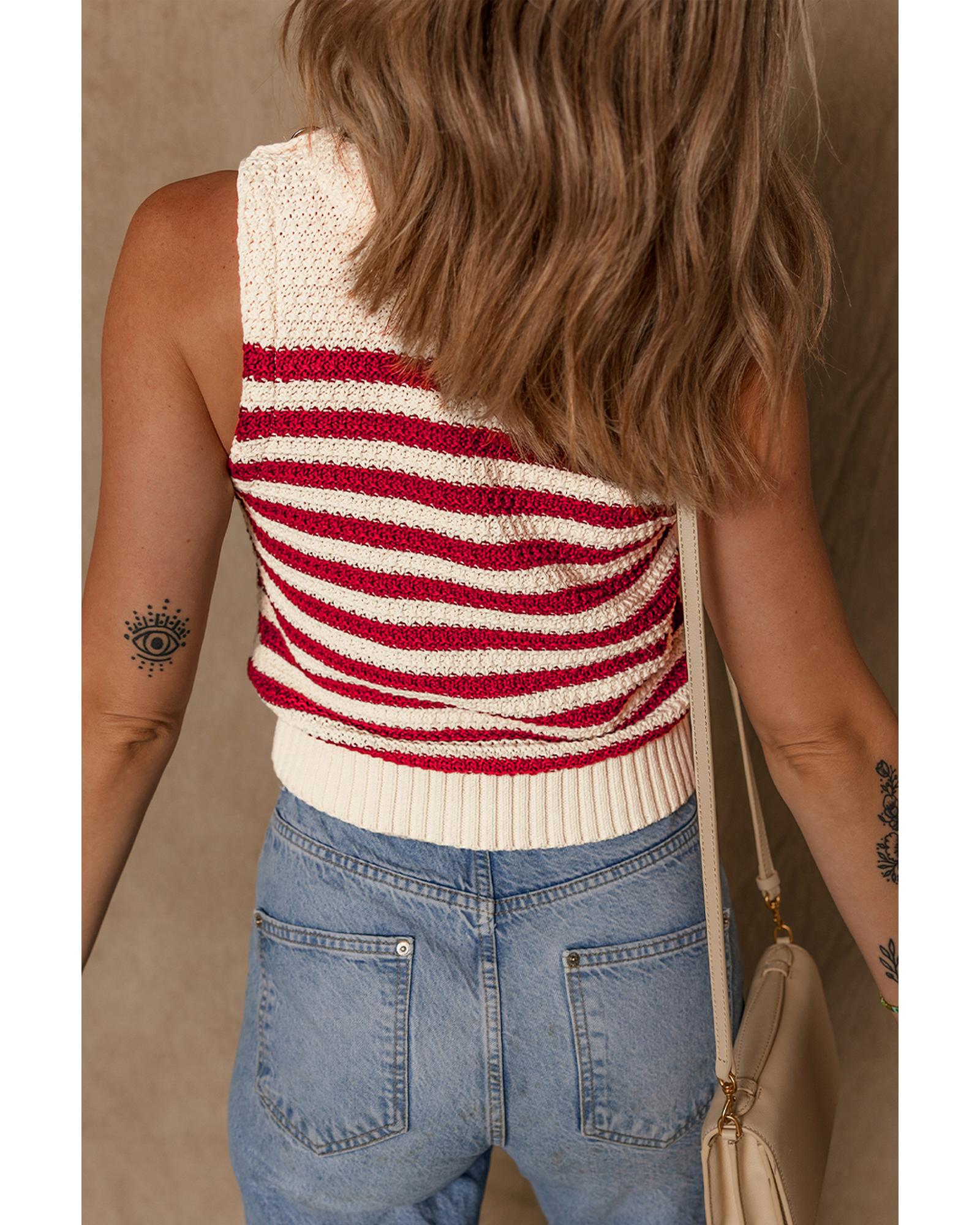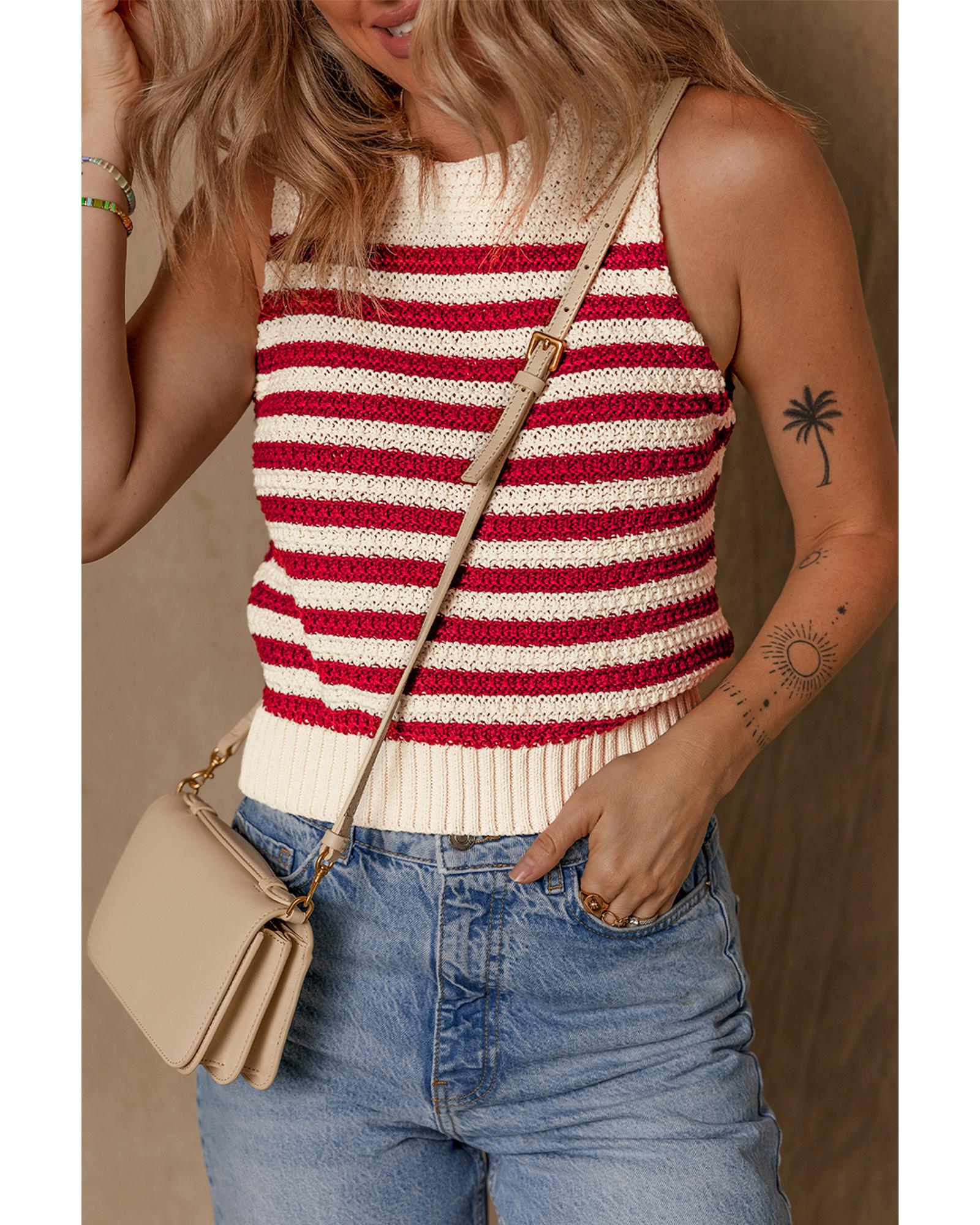 - Red Stripe Textured Knit Ribbed Hem Sweater Tank Top