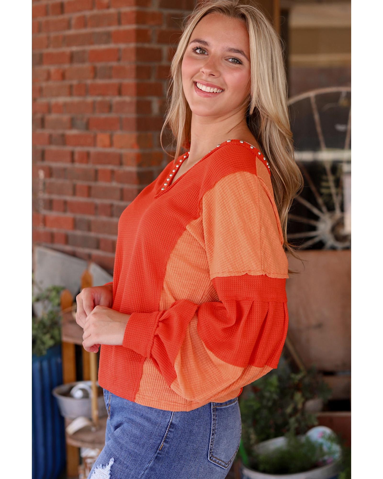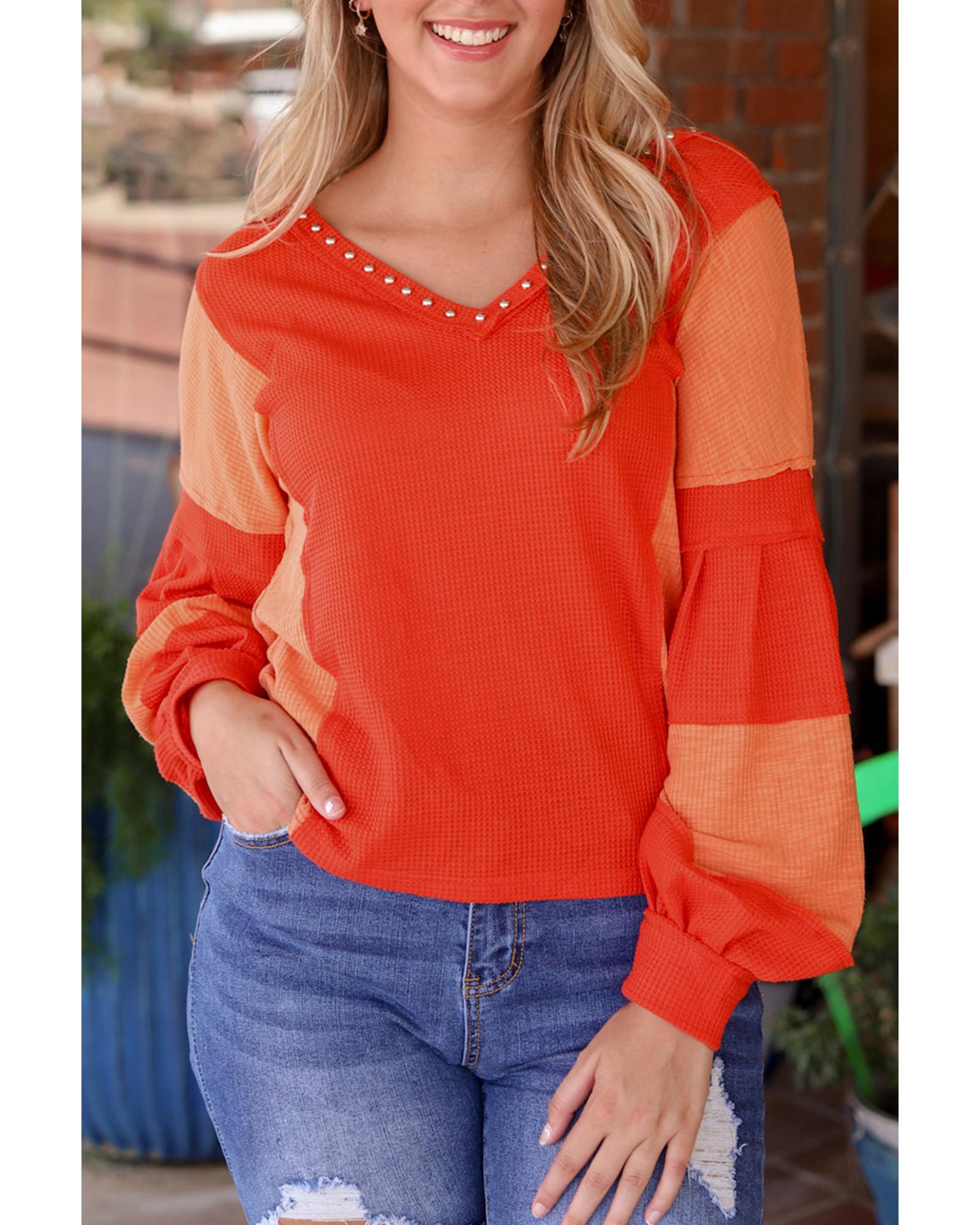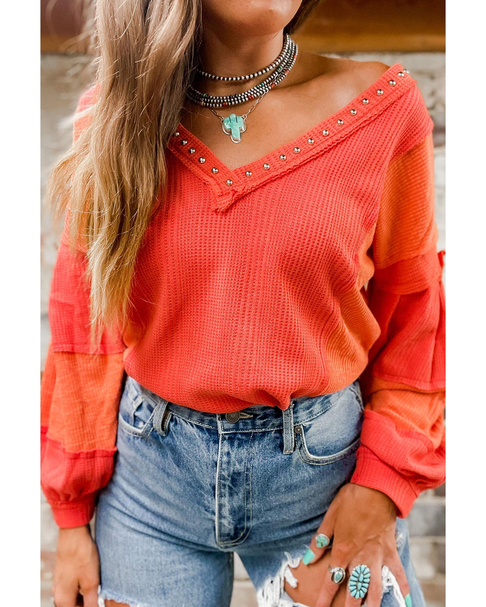 Red Studded V Neckline Exposed Seam Textured Knit Top – XL