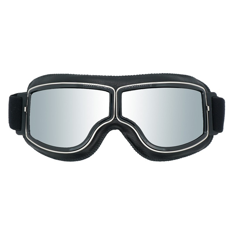 Retro Motorcycle Goggles – Windproof, UV400 Protection, Anti-Impact PC Lenses with Leather Frame(Black leather silver lens)