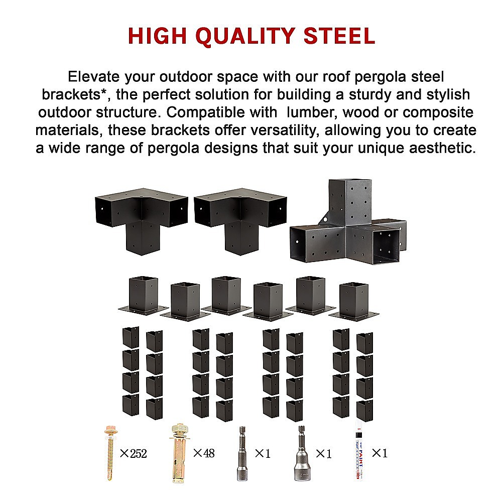 Experience superior quality with our pergola brackets*, crafted from high-quality steel to withstand the elements and stand the test of time. Their durable construction ensures reliability, even in challenging weather conditions, providing you with peace of mind and long-lasting performance.