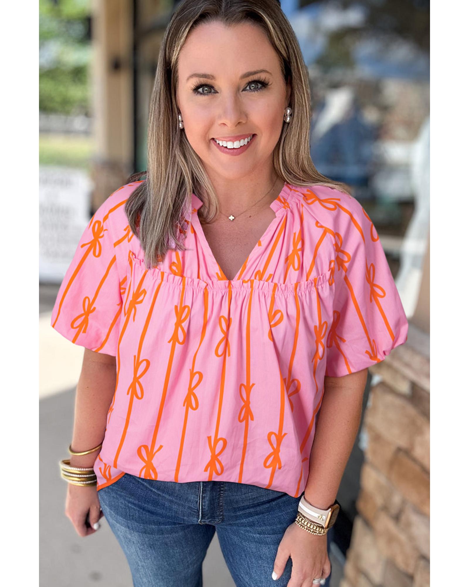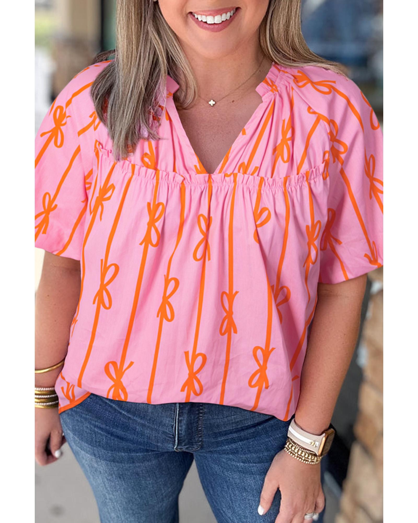 Rose Bowknot Print Shirred V Neck Puff Sleeve Plus Size Blouse – 1X