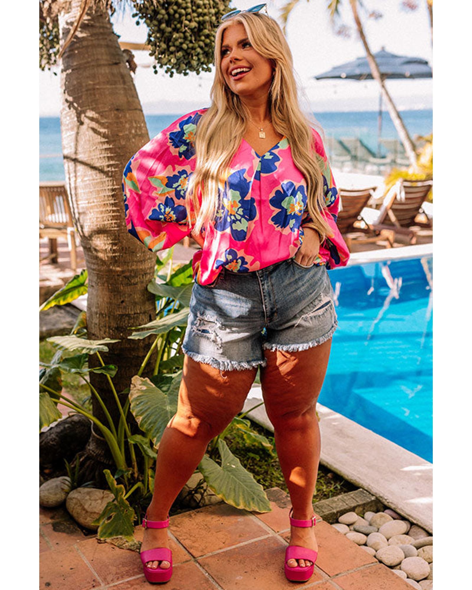 Rose Floral Pattern V Neck Balloon Sleeve Plus Size Blouse – 2X
