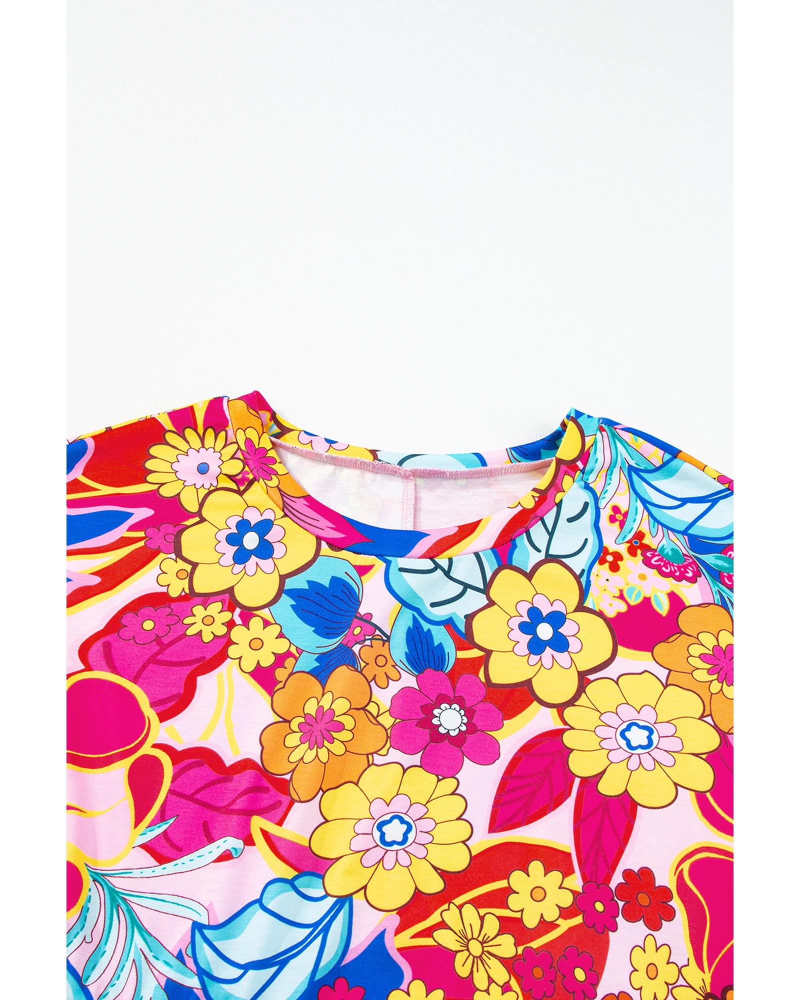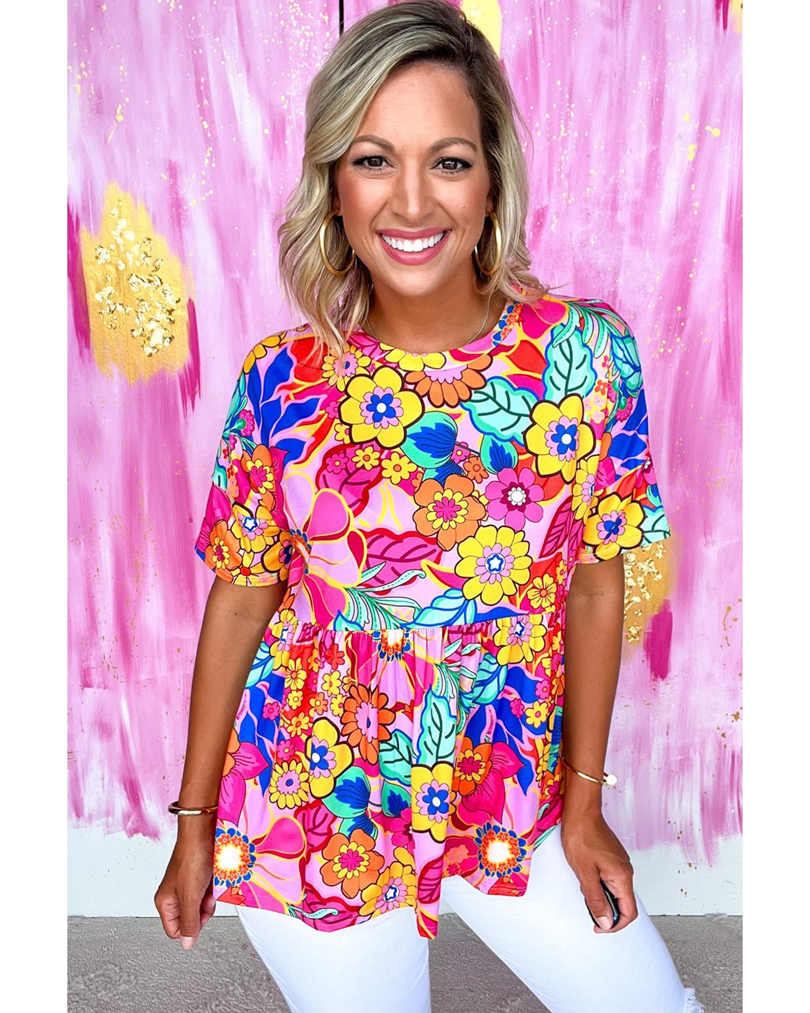 Rose Floral Print Short Sleeve Pleated Babydoll Top – S