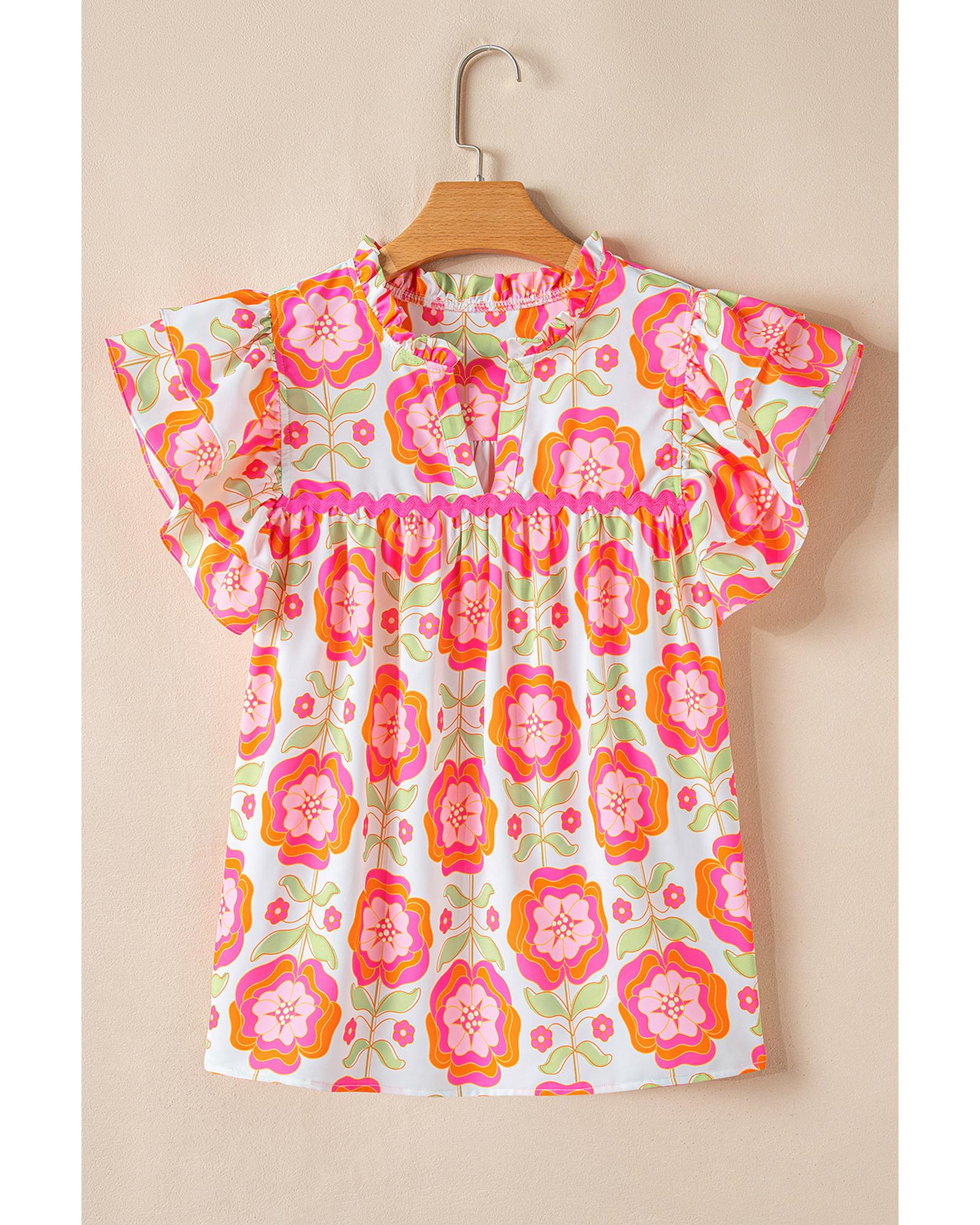 Rose Floral Ruffled Sleeve Ric-rac Trim Split Neck Loose Blouse – S
