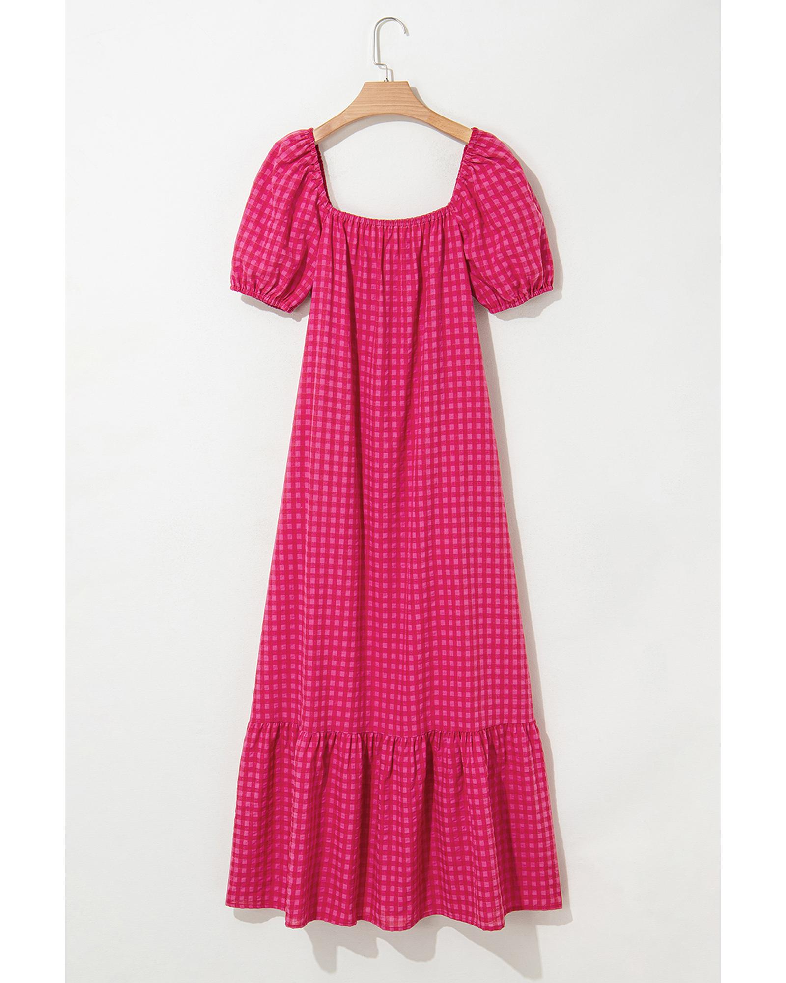 Rose Ginham Check Bubble Sleeve Ruffled Maxi Dress – M
