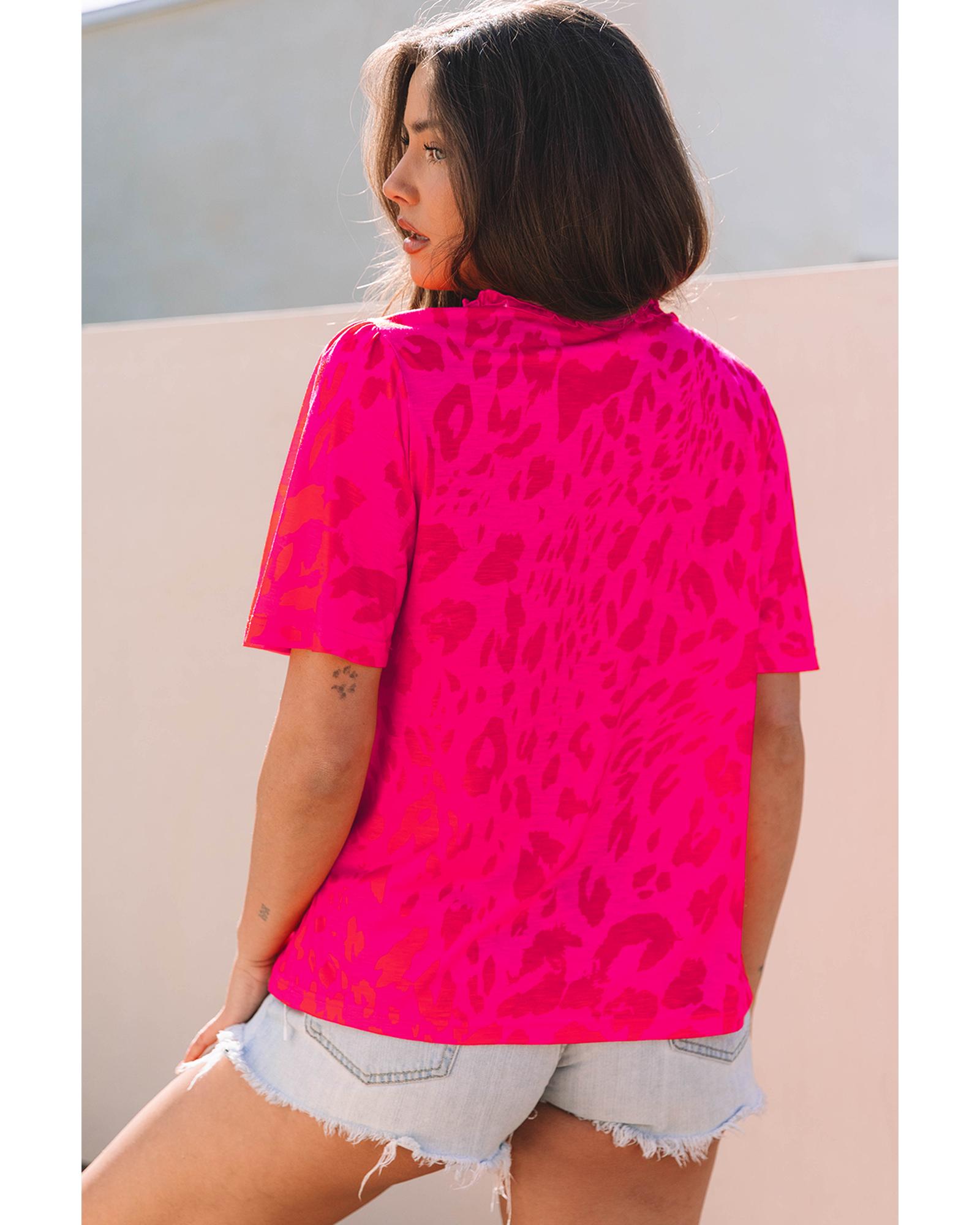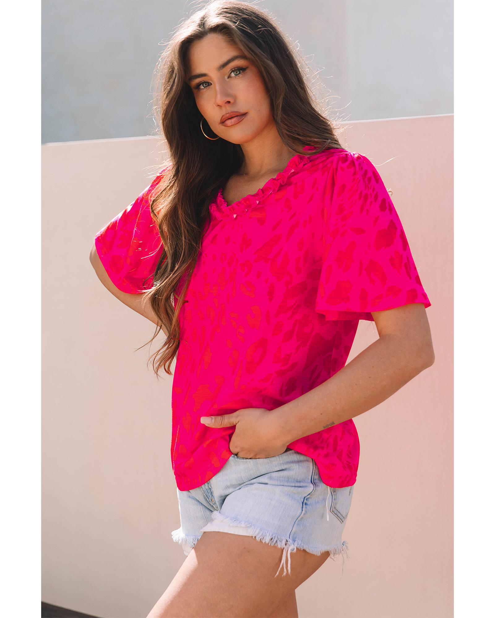 Rose Leopard Frilly V Neck Short Sleeve Blouse – L