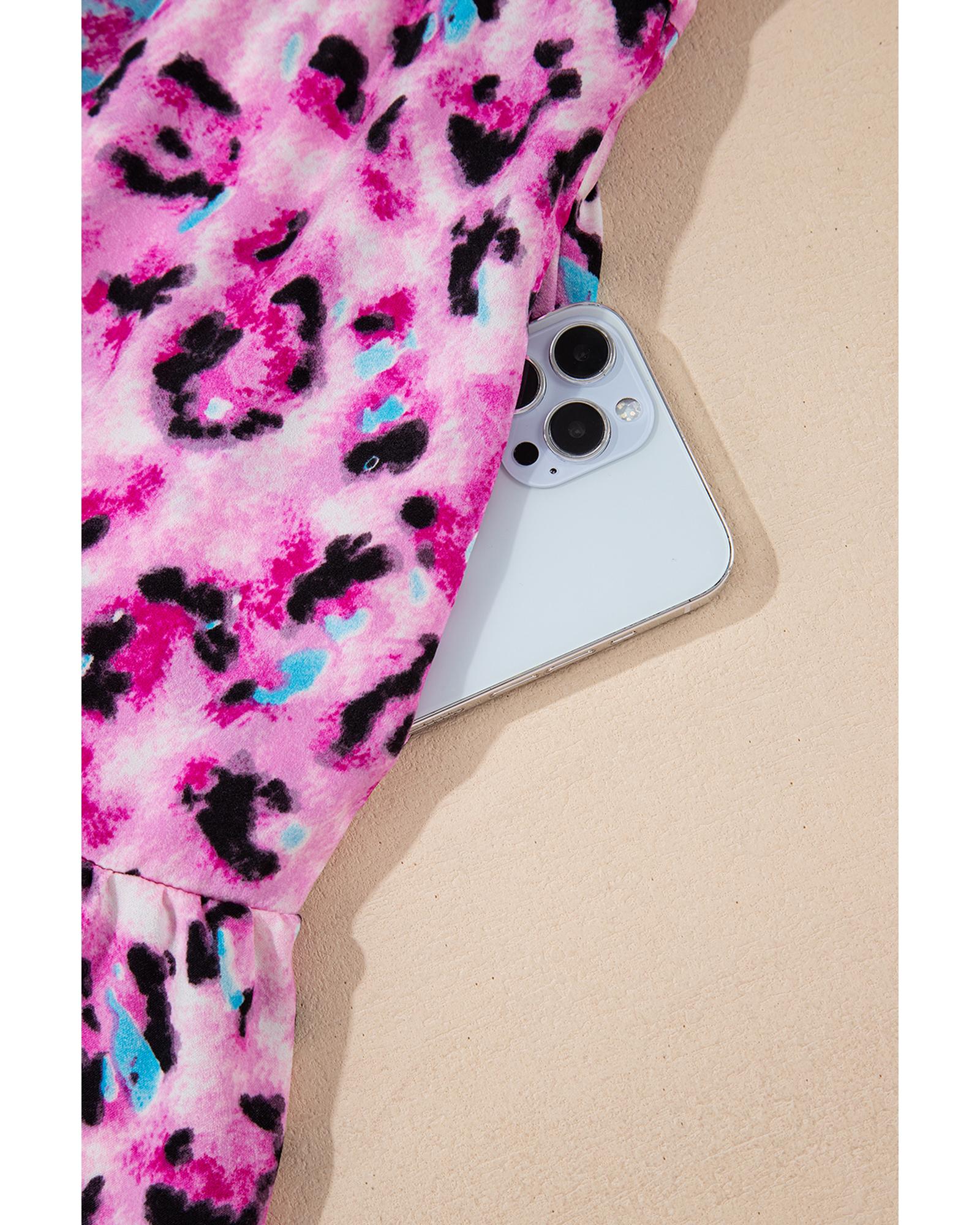 Rose Leopard Print Buttoned Front 3/4 Sleeve Tiered Ruffled Hem Dress – XL